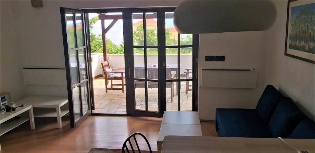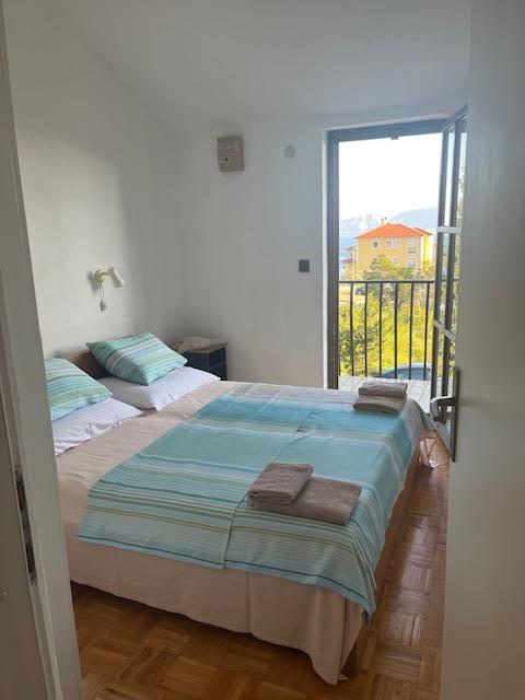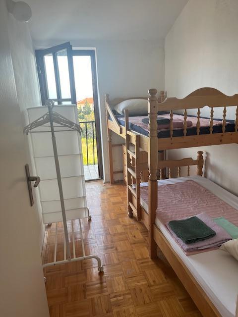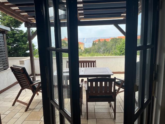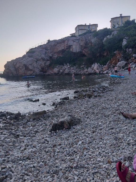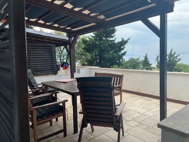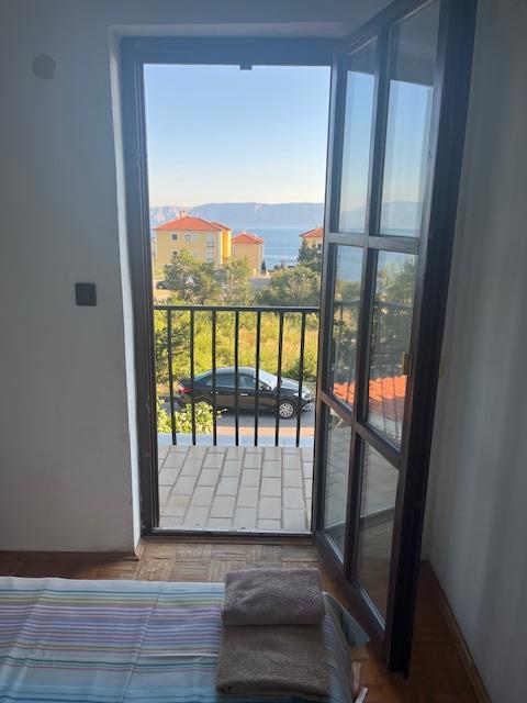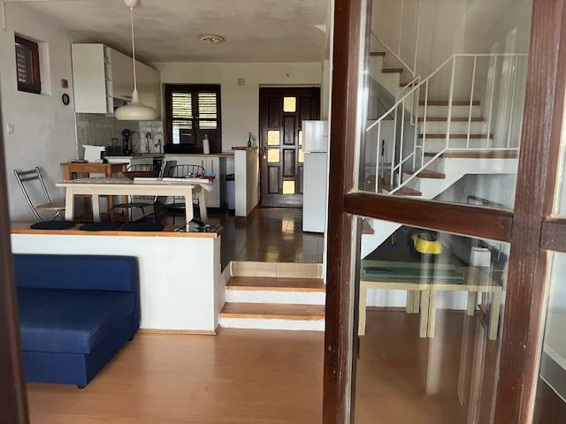 Kétszintes lakás 70m2 + nagy terasz 20m2 tengerre néző kilátással. Az alsó szinten található a teraszra nyíló nappali, konyha és WC. Az emeleten található egy fürdőszoba WC-vel és zuhanyzóval, három hálószoba (kettő tengerre néző és erkély). Külön bejárat, magánélet. 3 perc a lépcsőn a strandig.