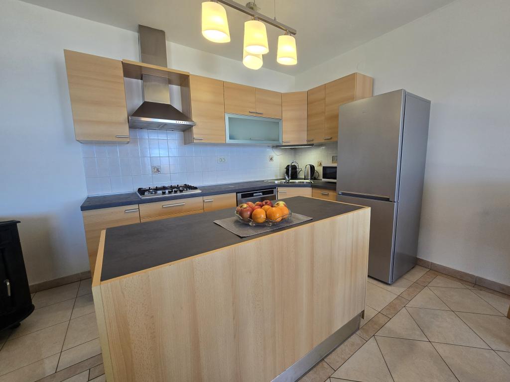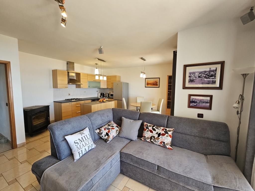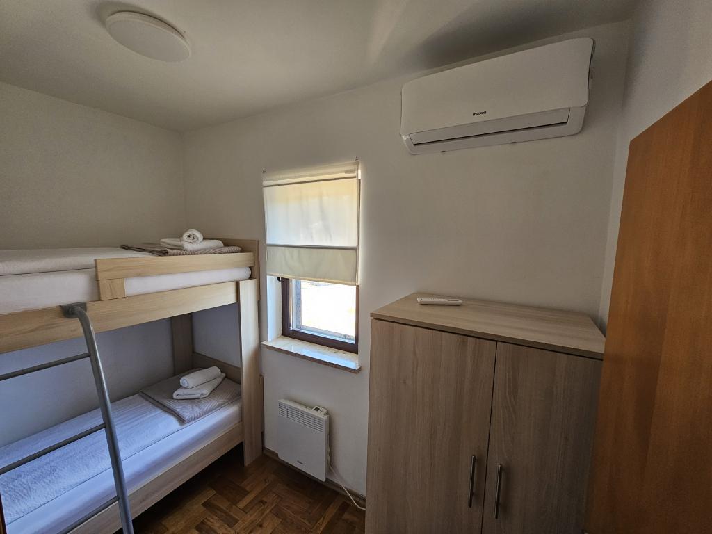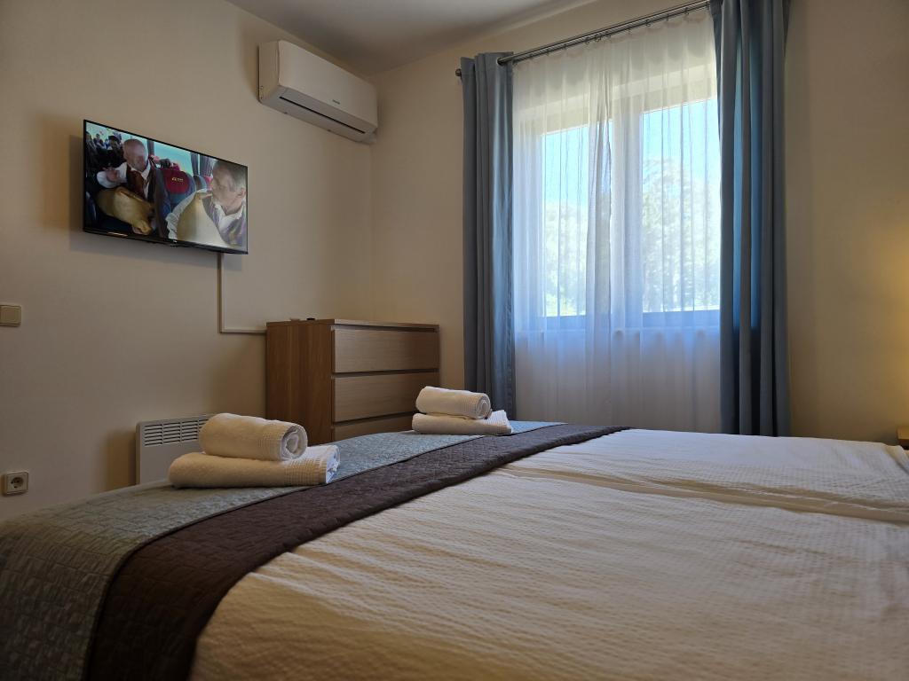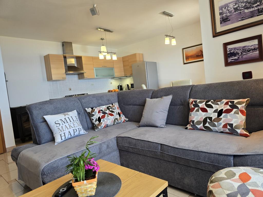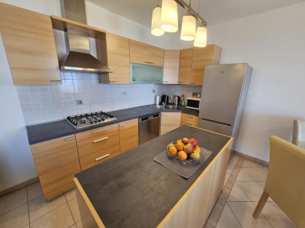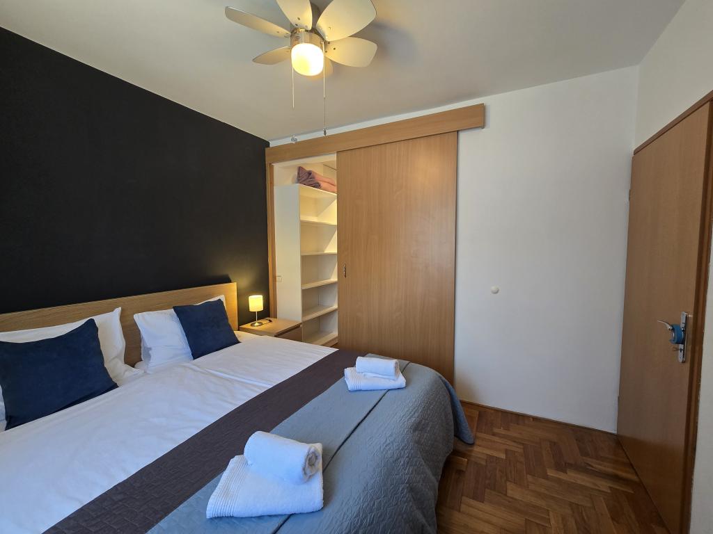 Teljesen felszerelt apartman két hálószobával, fürdőszobával, előszobával, konyhával, étkezővel és nappalival. Etetőszék áll rendelkezésre. A terasz mérete 25 m2. A hálószobában egy további LCD TV-vevő található. Hálószoba 1: nagy franciaágy (200x180 cm). 2. hálószoba: emeletes ágyak (200x180 cm). Az apartman egy csendes utcában található, közel minden szükséges szolgáltatáshoz. A családi ház első emeletén található. A konyha teljesen felszerelt (mosogatógép, gáztűzhely, sütő, hűtőszekrény fagyasztóval, filteres kávéfőző + Nespresso, kenyérpirító, mikrohullámú sütő, vízforraló, turmixgép...). A lakás teljesen klimatizált (nappali+konyha és hálószobák) Az ingatlan különálló, saját, ingyenes parkolóval rendelkezik az udvarban.