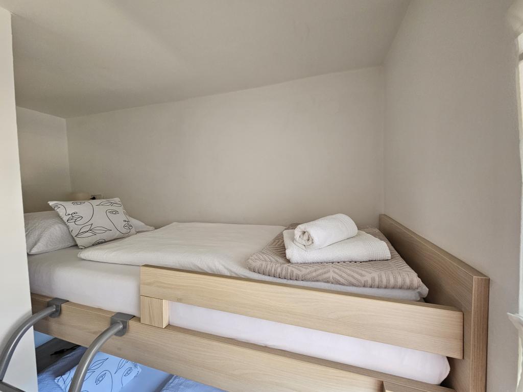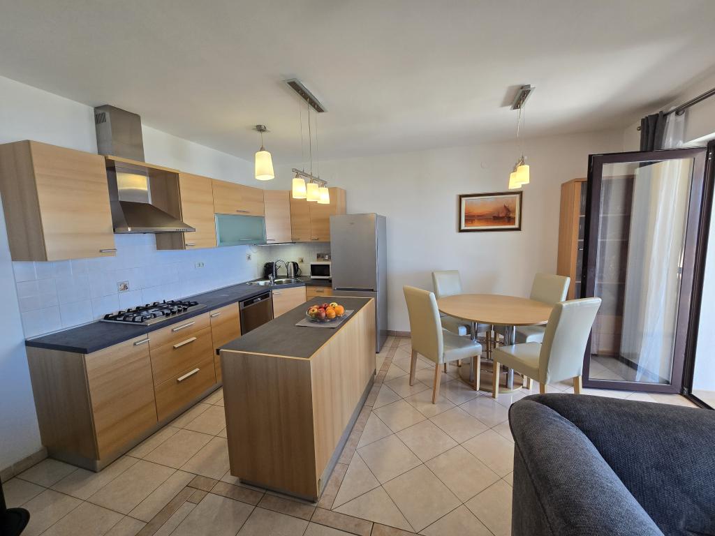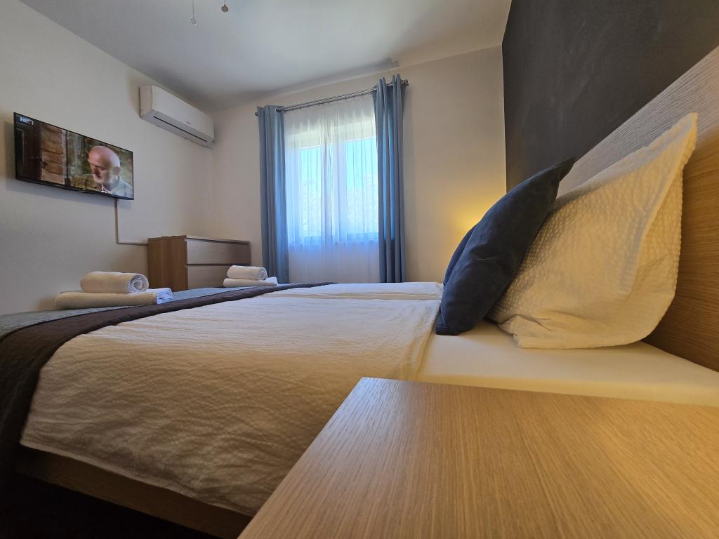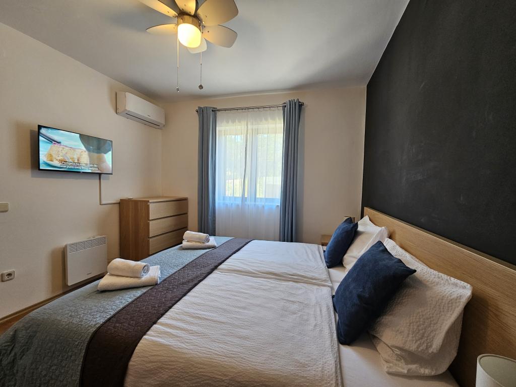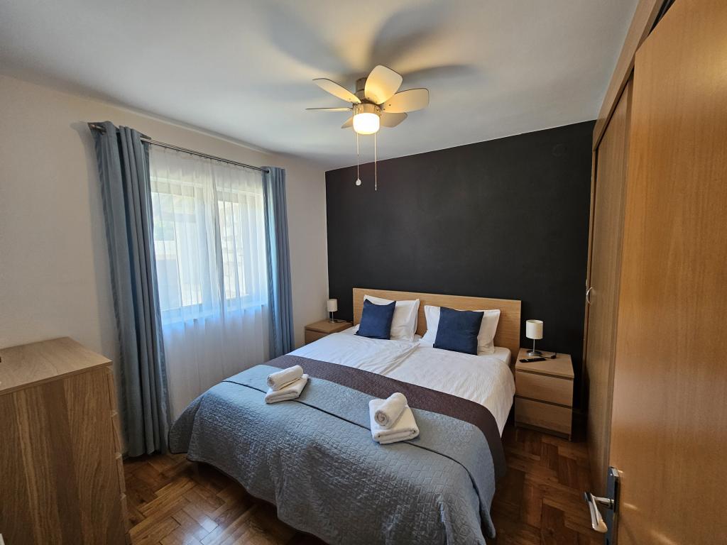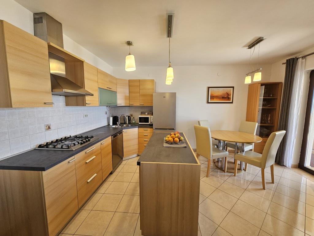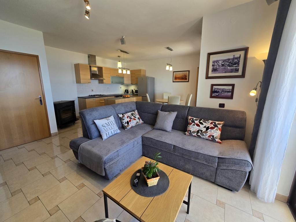 Teljesen felszerelt apartman két hálószobával, fürdőszobával, előszobával, konyhával, étkezővel és nappalival. Etetőszék áll rendelkezésre. A terasz mérete 25 m2. A hálószobában egy további LCD TV-vevő található. Hálószoba 1: nagy franciaágy (200x180 cm). 2. hálószoba: emeletes ágyak (200x180 cm). Az apartman egy csendes utcában található, közel minden szükséges szolgáltatáshoz. A családi ház első emeletén található. A konyha teljesen felszerelt (mosogatógép, gáztűzhely, sütő, hűtőszekrény fagyasztóval, filteres kávéfőző + Nespresso, kenyérpirító, mikrohullámú sütő, vízforraló, turmixgép...). A lakás teljesen klimatizált (nappali+konyha és hálószobák) Az ingatlan különálló, saját, ingyenes parkolóval rendelkezik az udvarban.