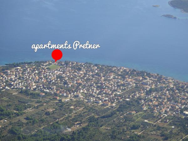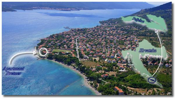 Apartmanok Pretner Orebic a Peljesac-félszigeten található, nyugodt, csendes környezetben, a tenger mellett, a homokos strandtól Trstenica. Első 2000m2 magában déli oldalán gazdag kert, mediterrán növényzet és egy kandalló, áll a vendégek rendelkezésére. Az északi oldalon vannak fák a citrusfélék és olajfák és egy nagy parkoló. Minden apartman légkondicionált, és műholdas TV-vel és vezeték nélküli internet.