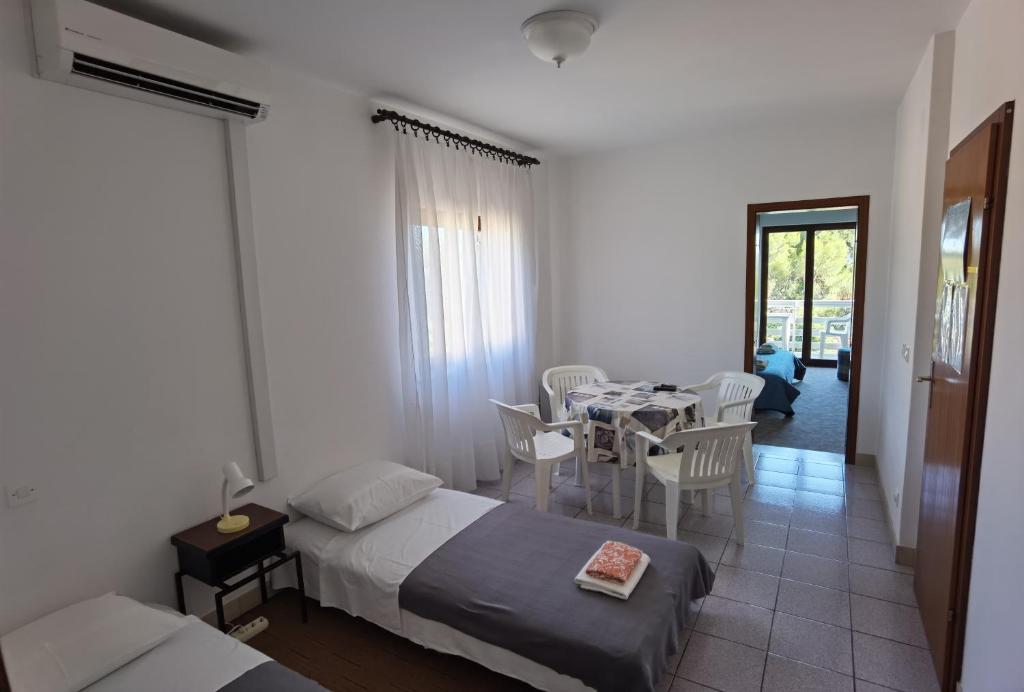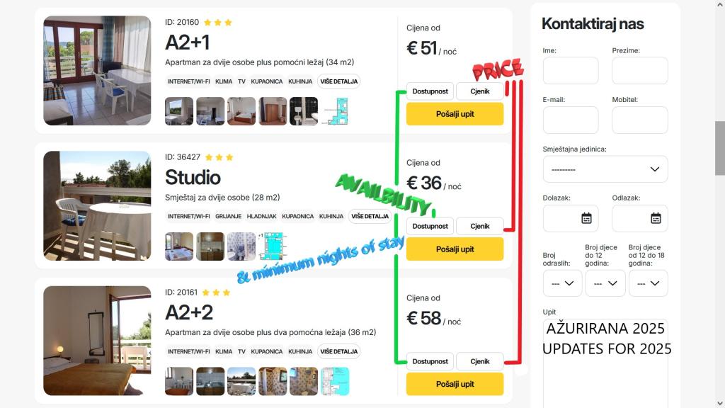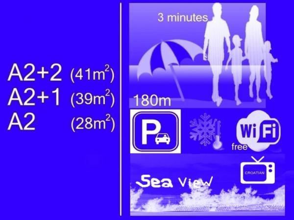 A szálláshely Orebić nyugati oldalán, az utolsó utcában található. A szállodakomplexum közelében, közvetlenül egy fenyőerdő mellett. Körülbelül 2,5 perces sétára található a tenger és a nyilvános strandok. A tengerparton bővelkedik a fenyőfák és a tölgyesek árnyékában található strandok, valamint bárok és éttermek is találhatók. Különösen vonzó a Grand Hotel alatti nyilvános strand öböllel és sekély, homokos tengerrel az alján. Minden apartmanhoz tartozik erkély - egy loggia, ahol meleg időben és teljes szélcsendben a levegő erősen és kellemesen kering. A "2+2" és "2+1" pótágyazható apartmanok két- vagy egygyermekes családok számára alkalmasak. A "2+2" lakásban kettő, a "2+1" lakásban egy klímaberendezés található. ÜDVÖZÖLJÜK