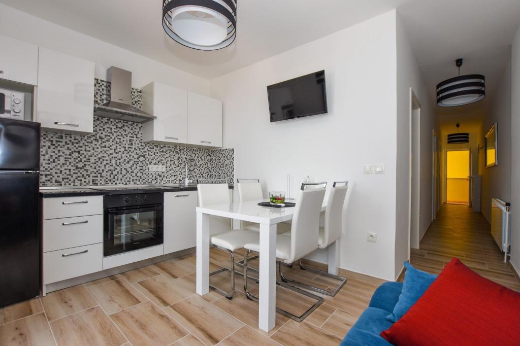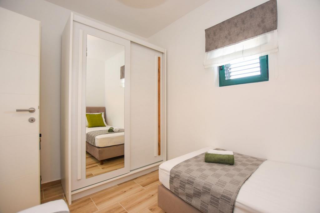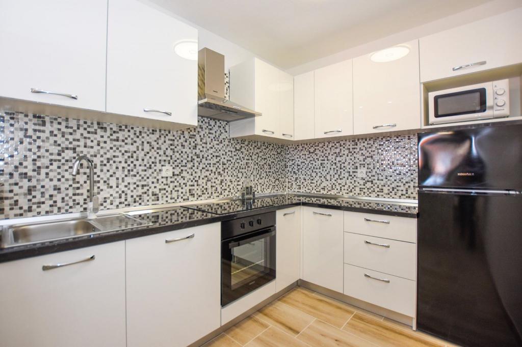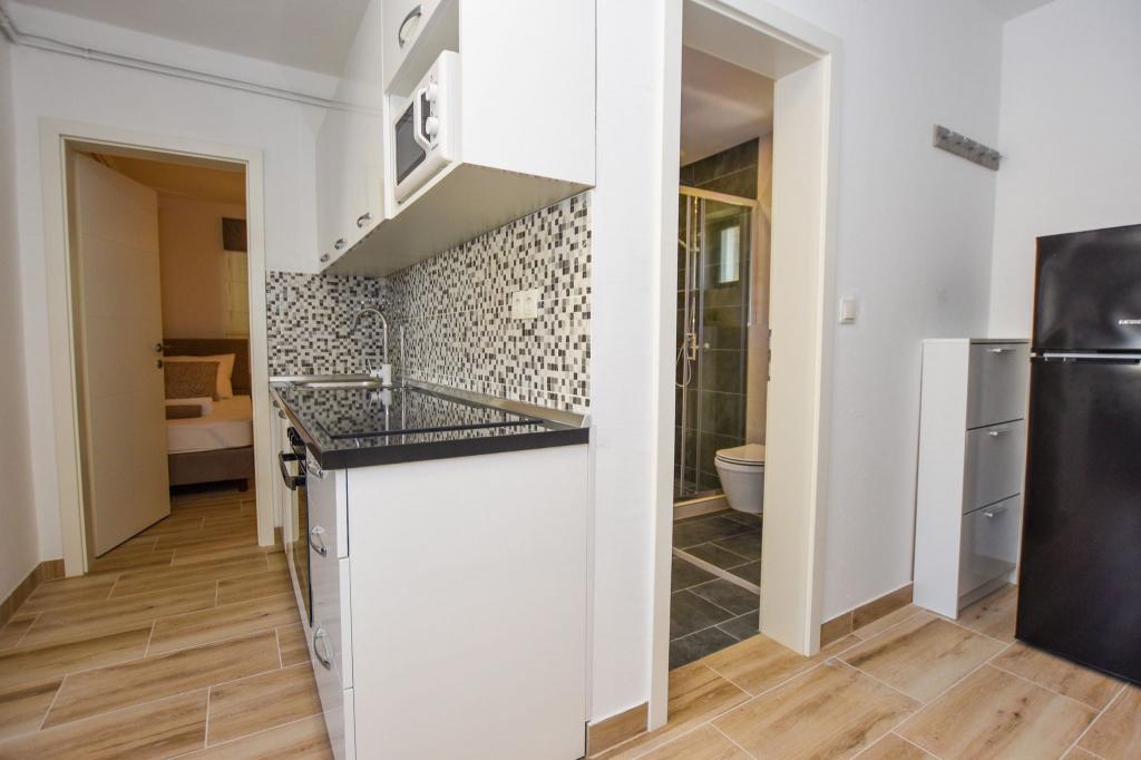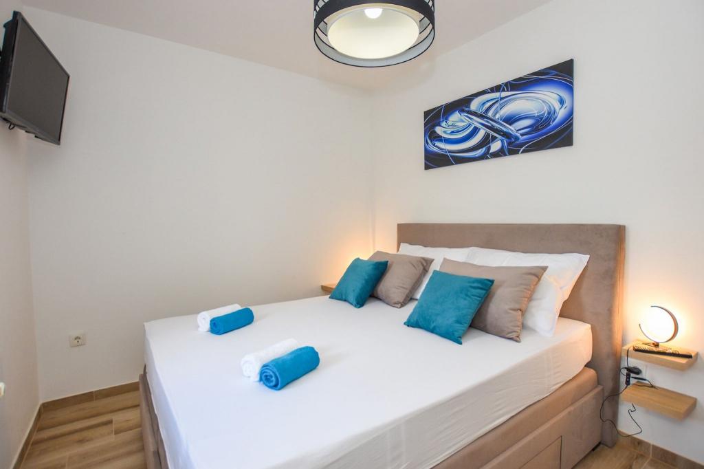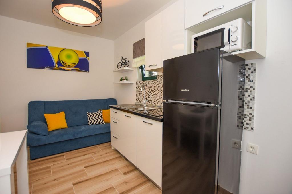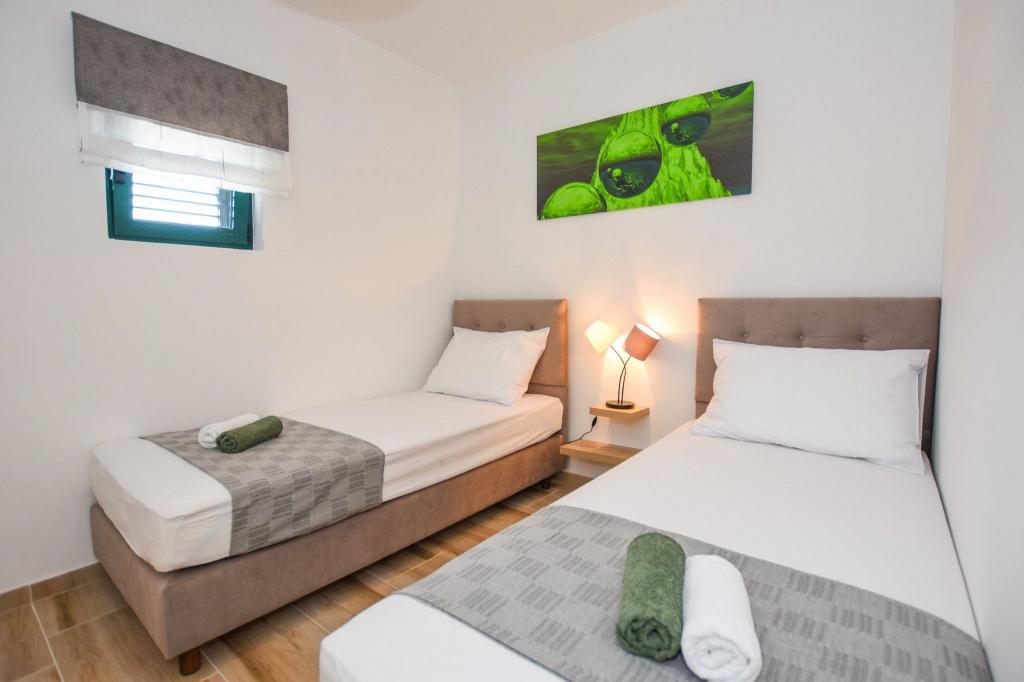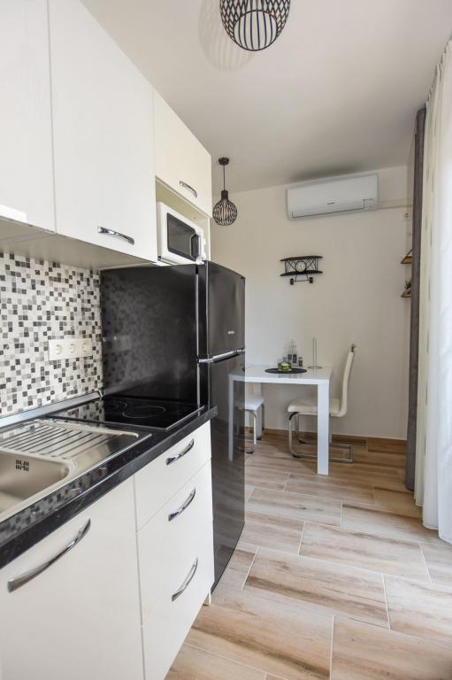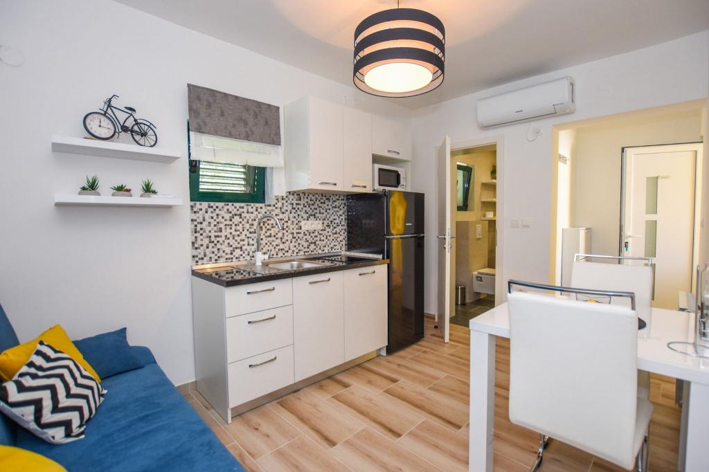 6 ÚJ KORSZERŰ DÍSZÍTÉSŰ apartman, minden egység légkondicionálóval, saját zuhanyzós fürdőszobával és konyhával mosogatógéppel, hűtőszekrénnyel, kenyérpirítóval és vízforralóval, valamint egy közös helyiség mosáshoz, szárításhoz és vasaláshoz, ingyenes Wi-Fi, LED TV, kávéfőző , gyermekágy. Ingyenes privát parkoló 50 méteren belül. Néhány lakóegységhez terasz is tartozik. 20 méteres körzetben gyönyörű strandok, kávézók, játszótér, éttermek, üzletek és játszószoba található.
