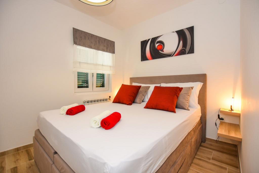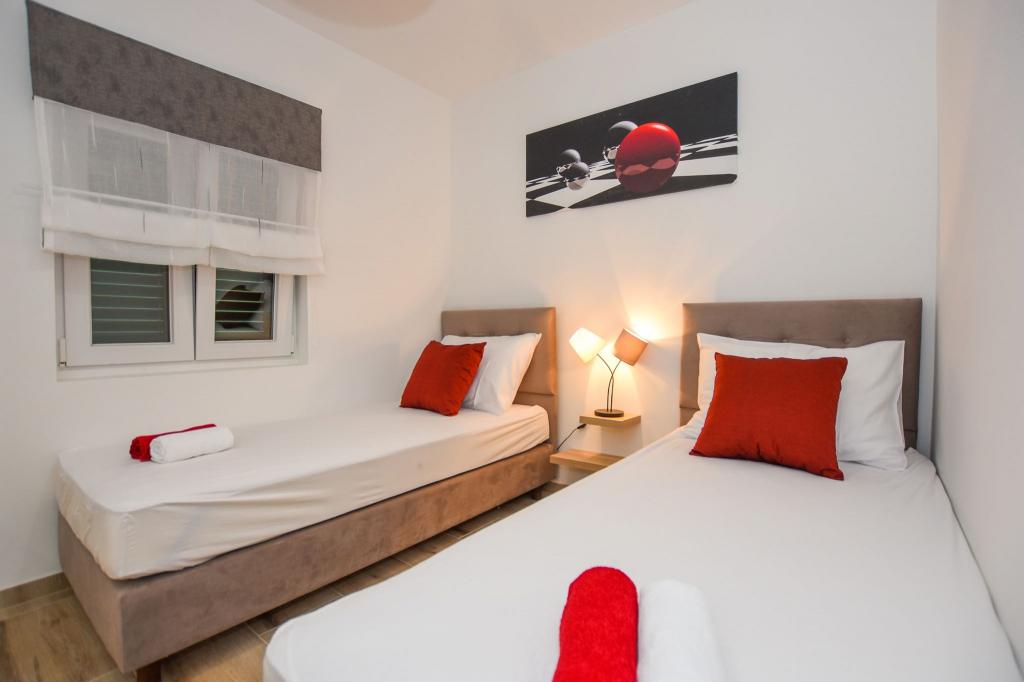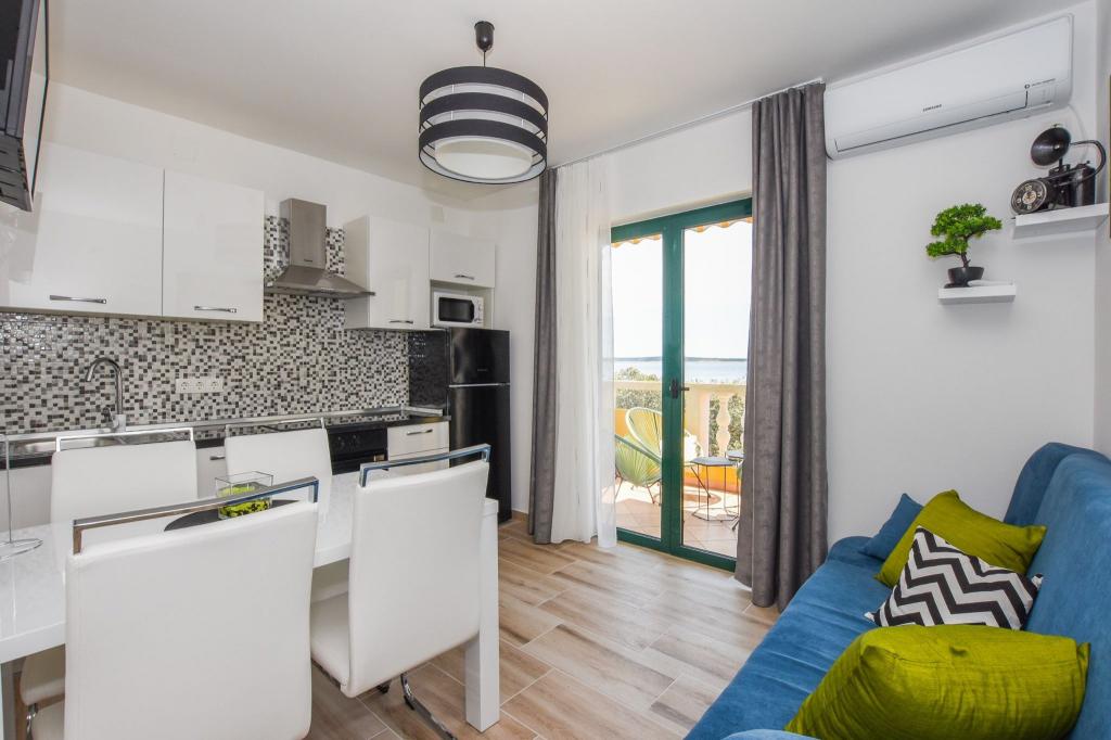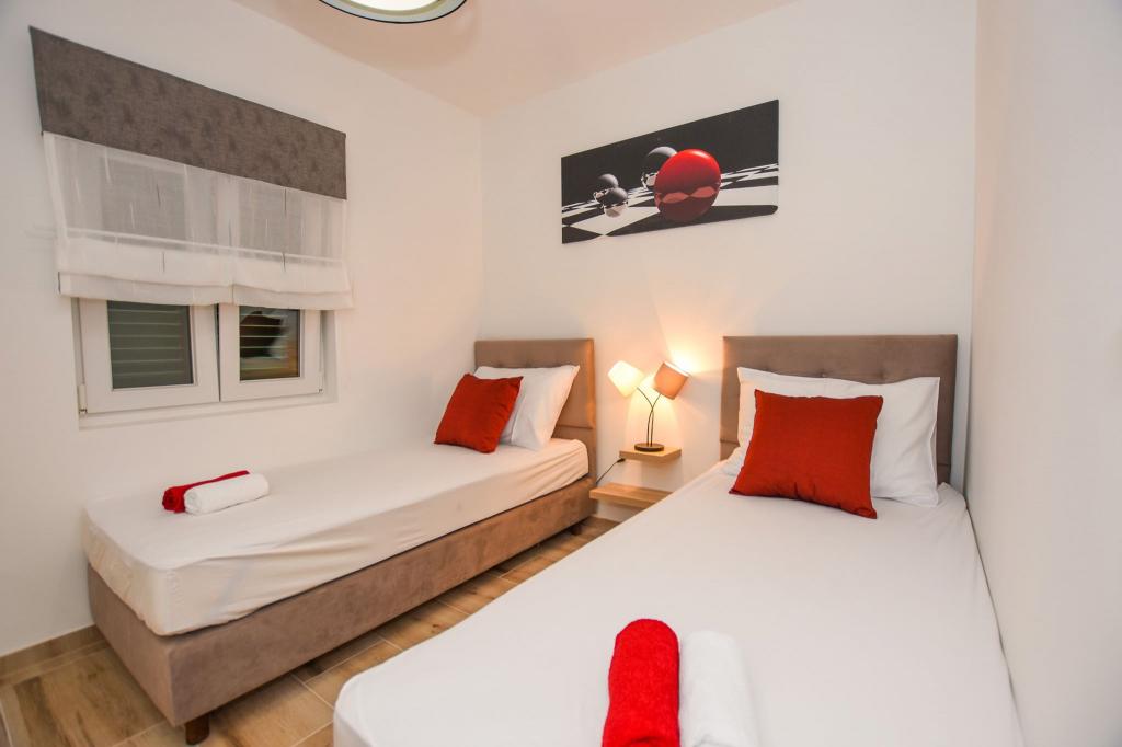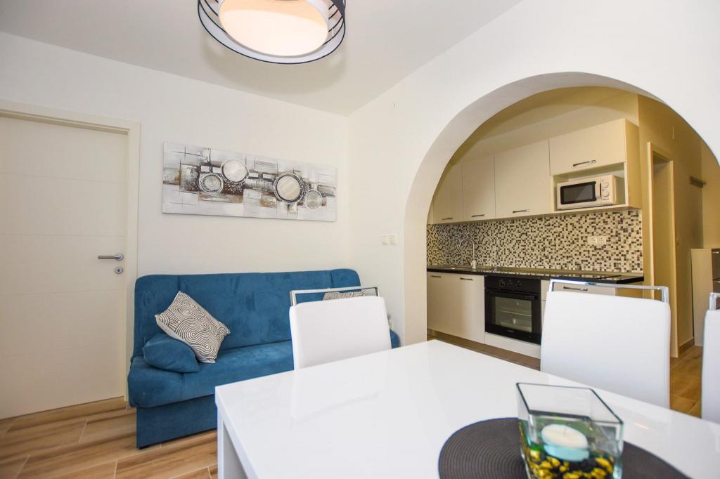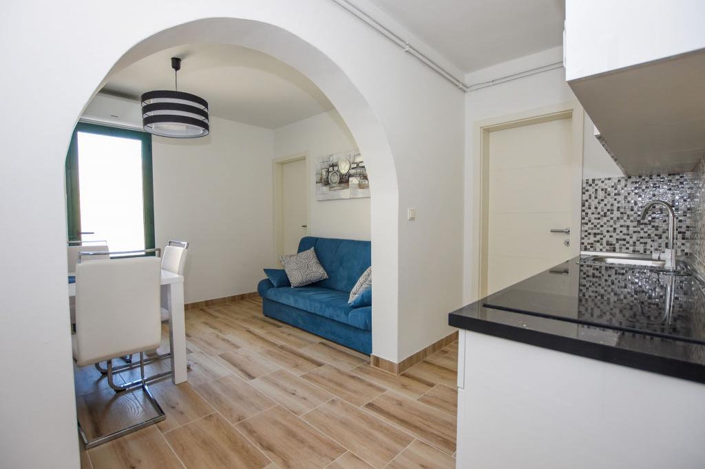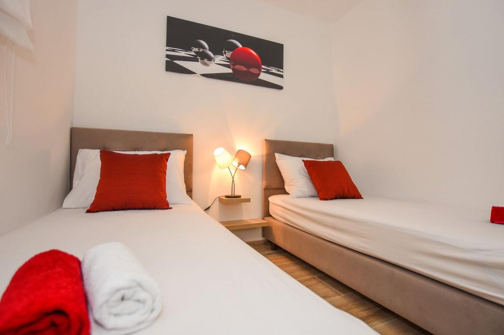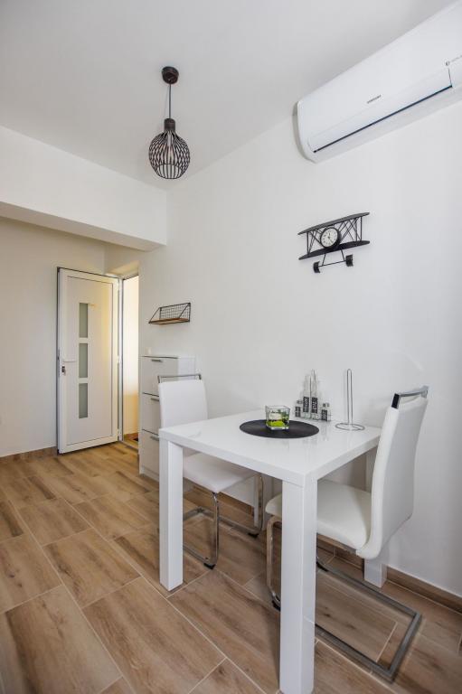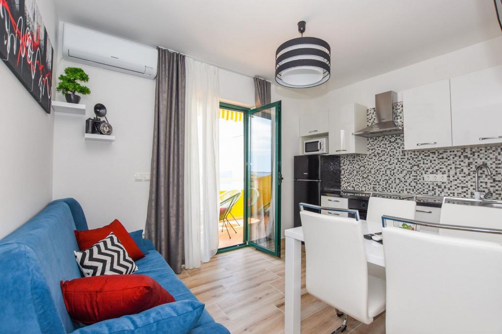 6 ÚJ KORSZERŰ DÍSZÍTÉSŰ apartman, minden egység légkondicionálóval, saját zuhanyzós fürdőszobával és konyhával mosogatógéppel, hűtőszekrénnyel, kenyérpirítóval és vízforralóval, valamint egy közös helyiség mosáshoz, szárításhoz és vasaláshoz, ingyenes Wi-Fi, LED TV, kávéfőző , gyermekágy. Ingyenes privát parkoló 50 méteren belül. Néhány lakóegységhez terasz is tartozik. 20 méteres körzetben gyönyörű strandok, kávézók, játszótér, éttermek, üzletek és játszószoba található.