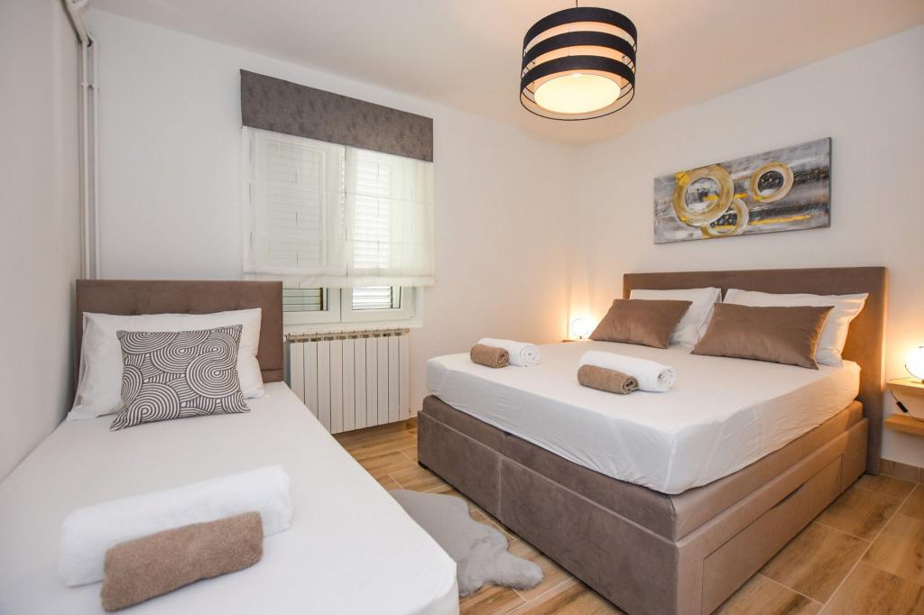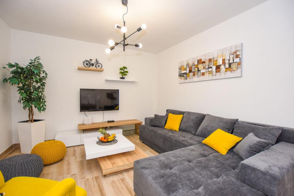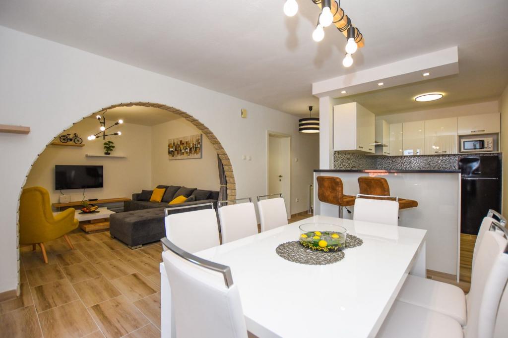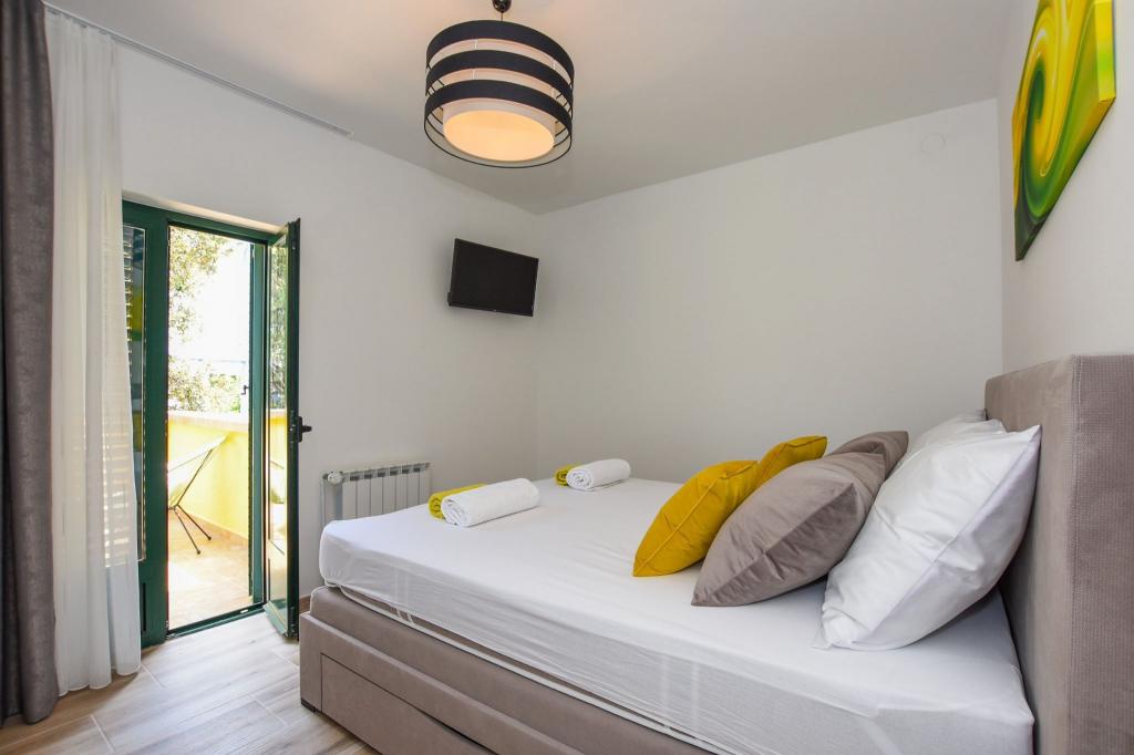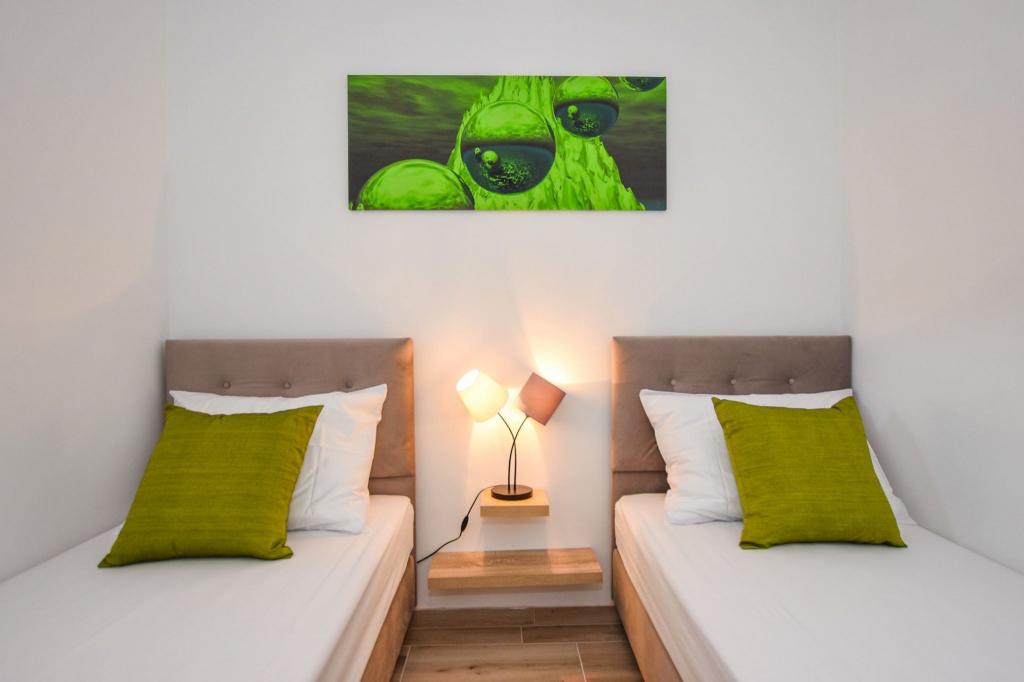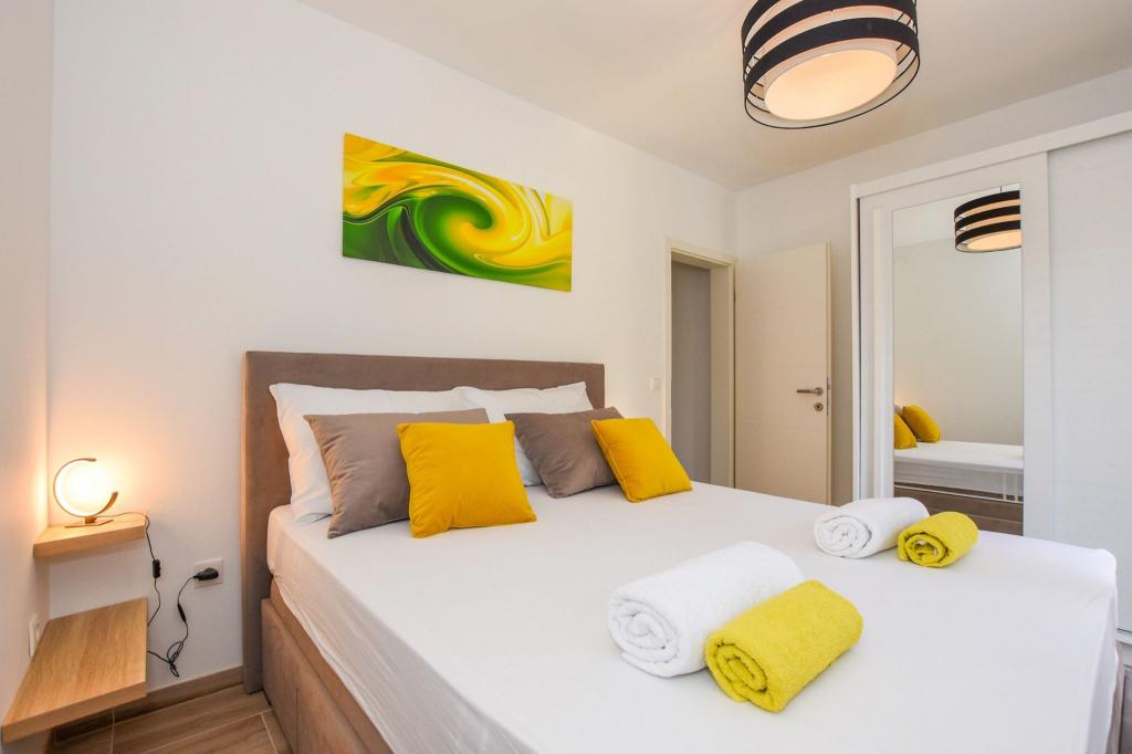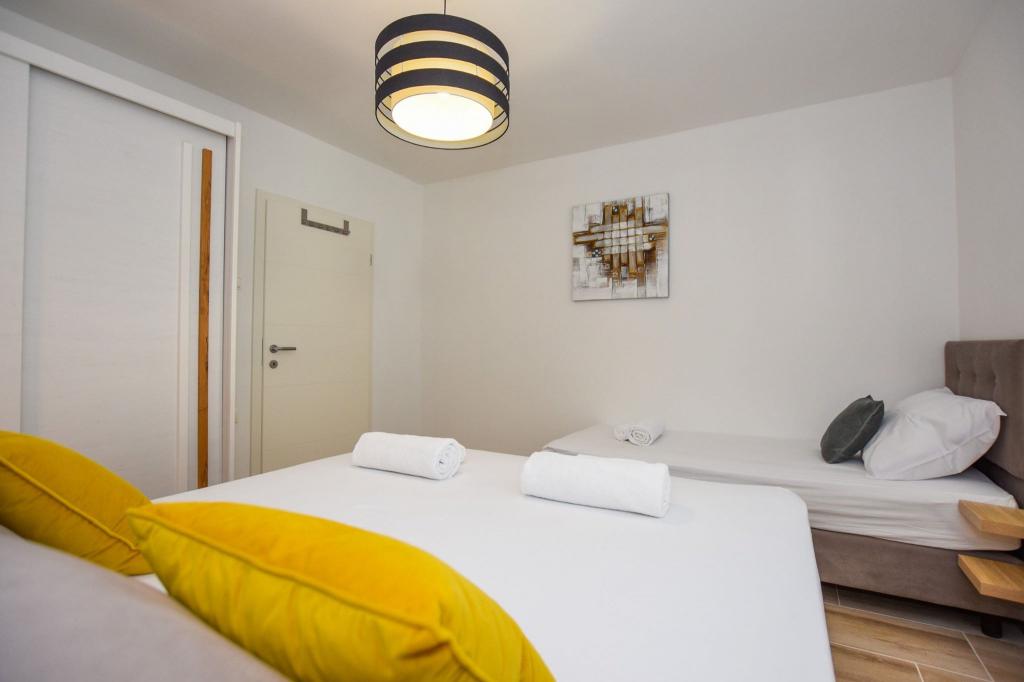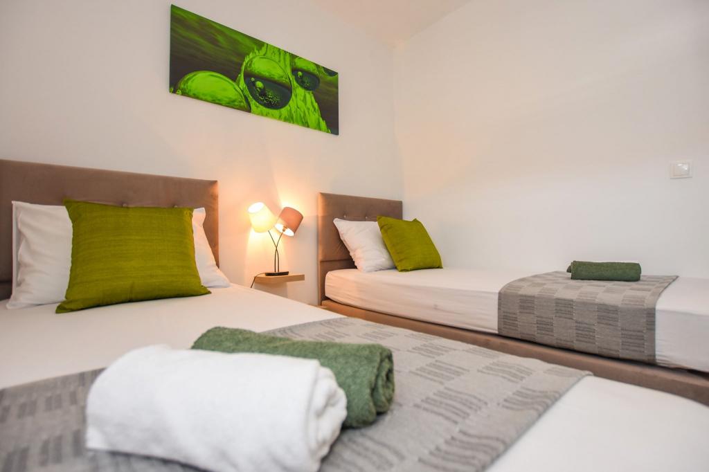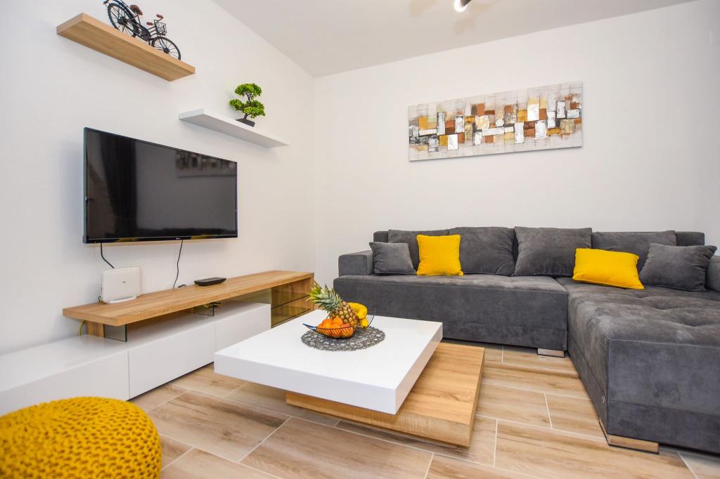 6 ÚJ KORSZERŰ DÍSZÍTÉSŰ apartman, minden egység légkondicionálóval, saját zuhanyzós fürdőszobával és konyhával mosogatógéppel, hűtőszekrénnyel, kenyérpirítóval és vízforralóval, valamint egy közös helyiség mosáshoz, szárításhoz és vasaláshoz, ingyenes Wi-Fi, LED TV, kávéfőző , gyermekágy. Ingyenes privát parkoló 50 méteren belül. Néhány lakóegységhez terasz is tartozik. 20 méteres körzetben gyönyörű strandok, kávézók, játszótér, éttermek, üzletek és játszószoba található.