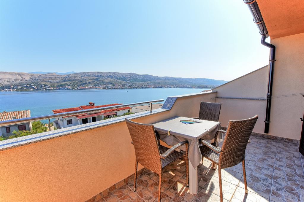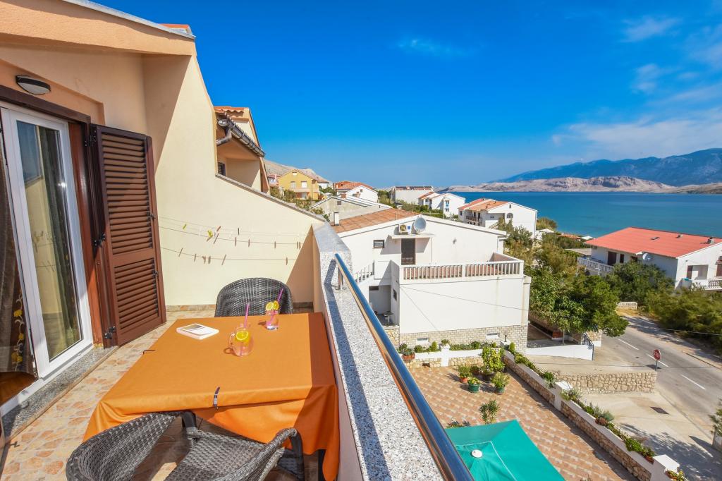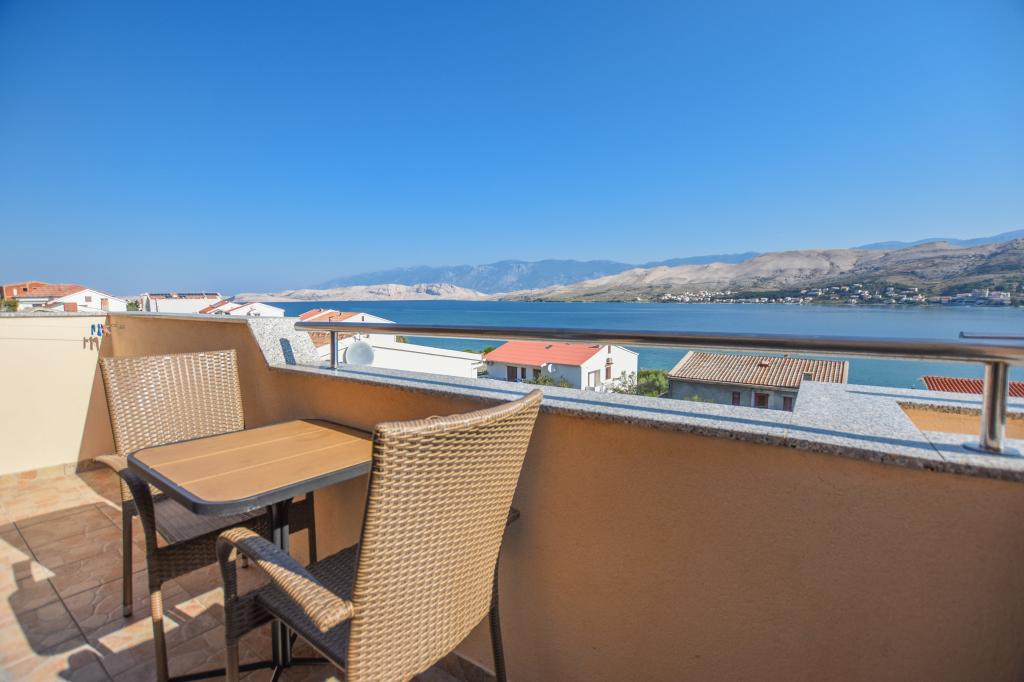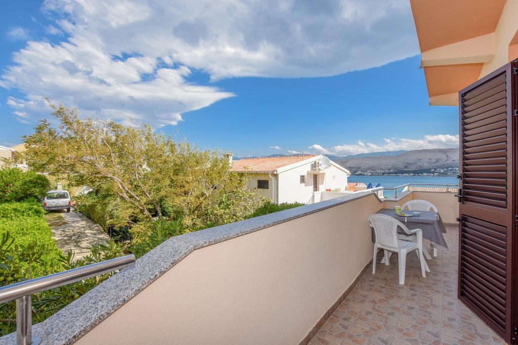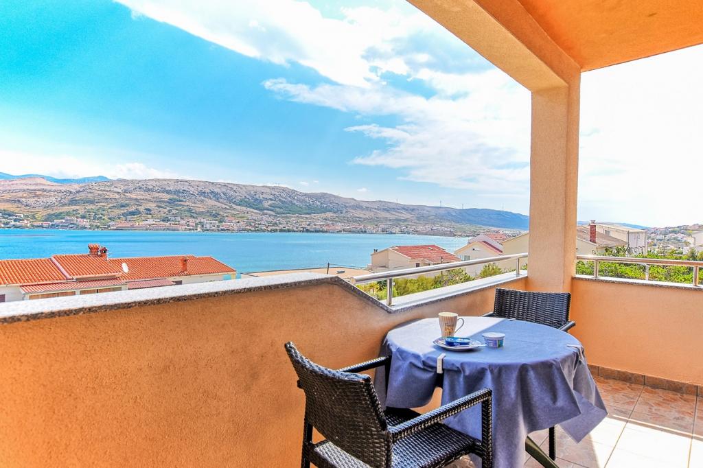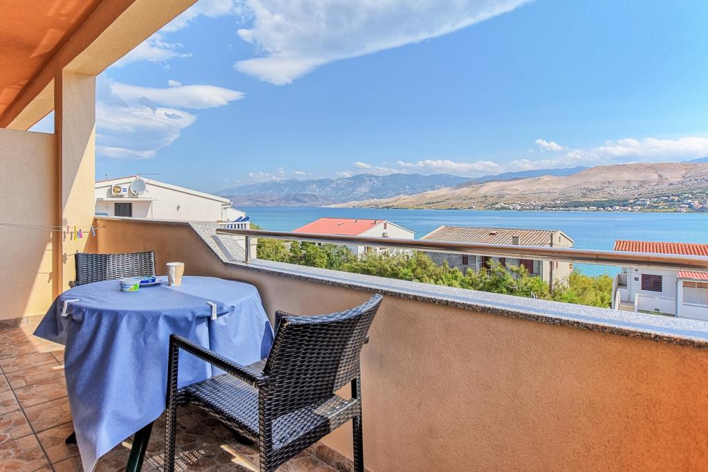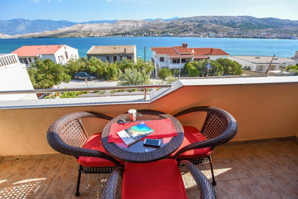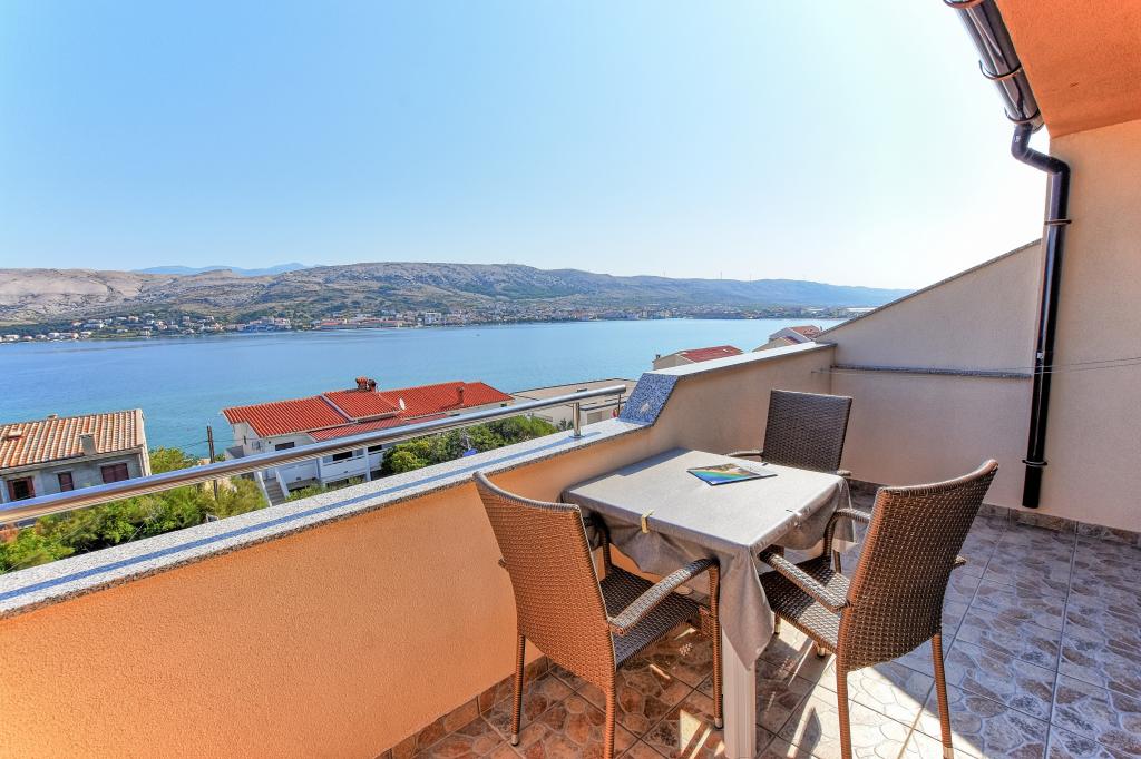 Tágas apartman 2 erkéllyel, mindkettő gyönyörű kilátással a tengerre és Pag városára. Alkalmas gyermekes családok számára, 5 perc. gyalog a Prosika strandtól. Kiváló és tágas parkoló. A tulajdonos barátságos és mindig elérhető.