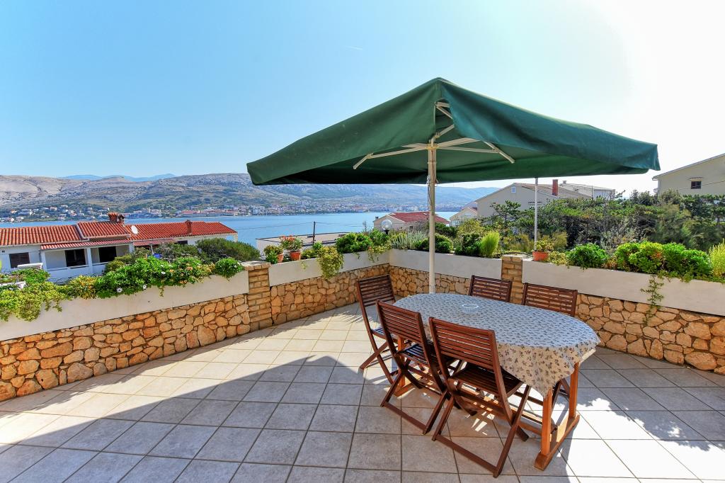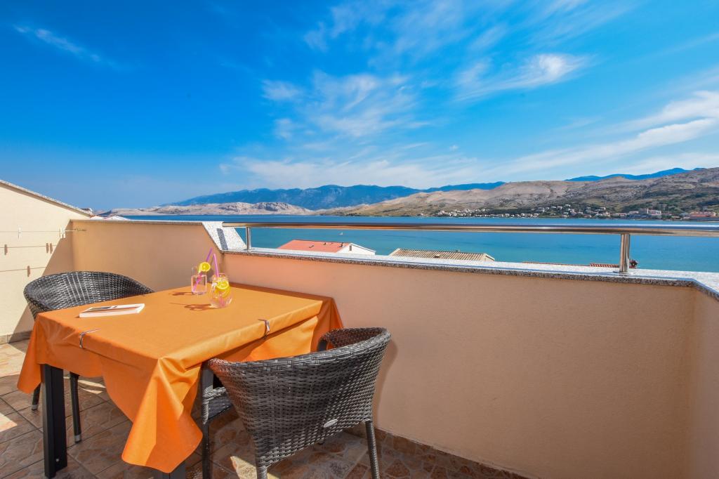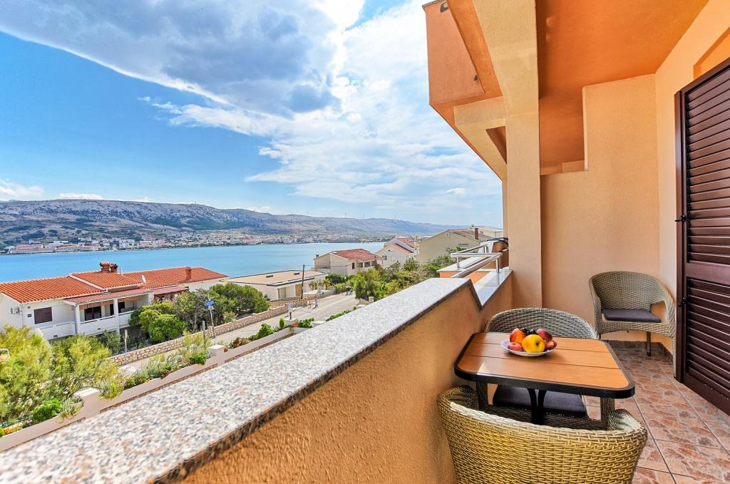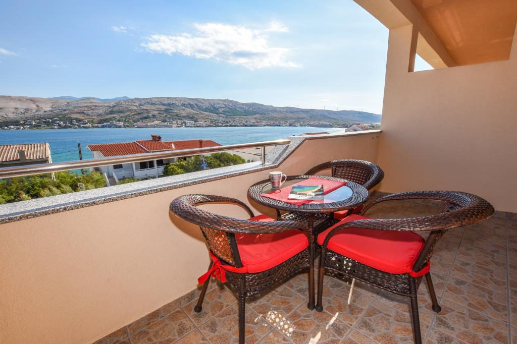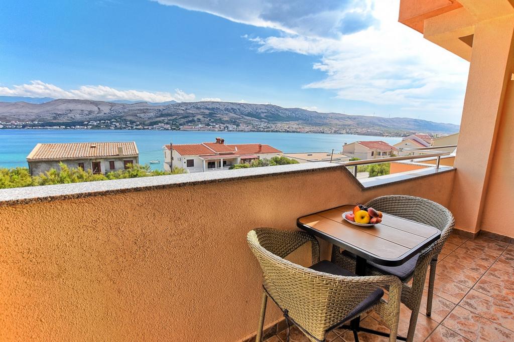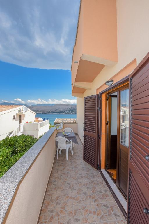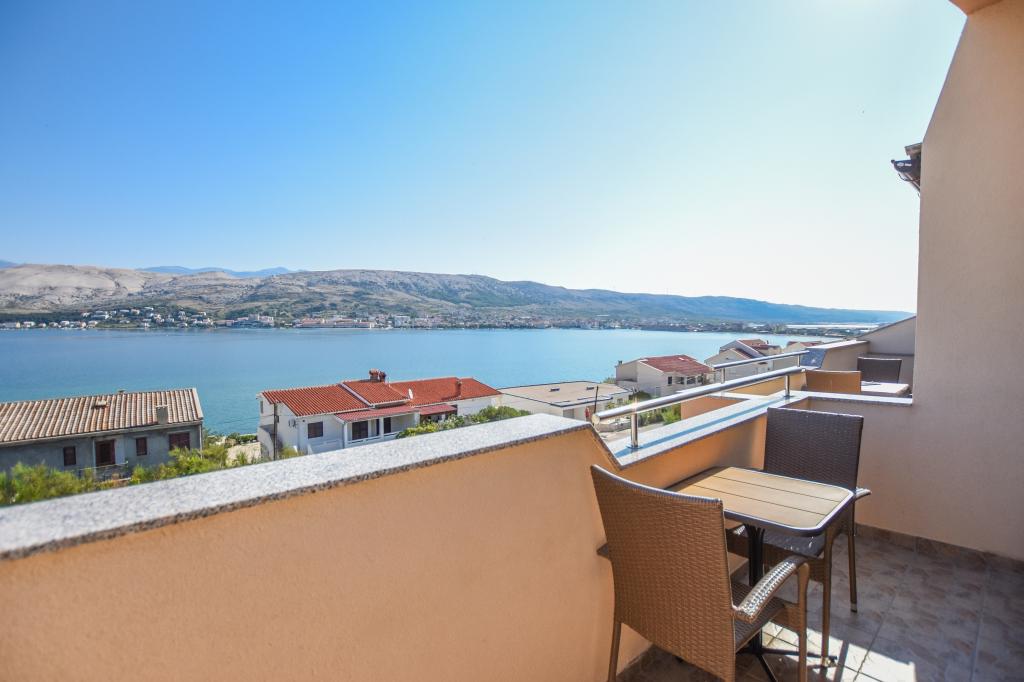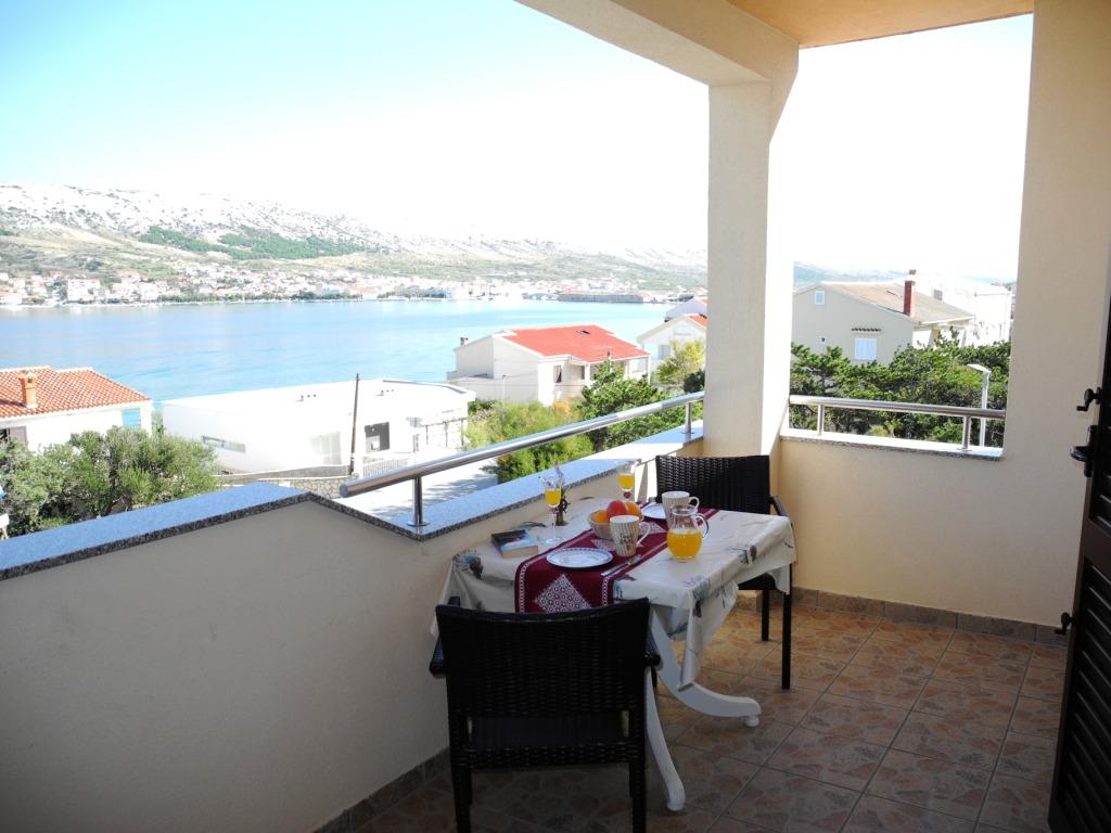 Tágas apartman 2 erkéllyel, mindkettő gyönyörű kilátással a tengerre és Pag városára. Alkalmas gyermekes családok számára, 5 perc. gyalog a Prosika strandtól. Kiváló és tágas parkoló. A tulajdonos barátságos és mindig elérhető.