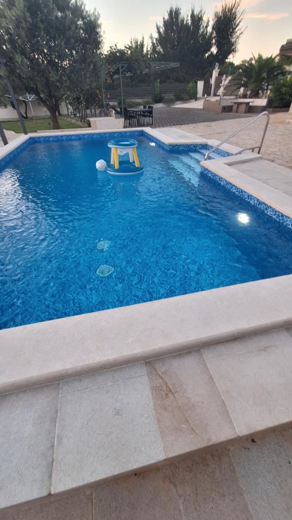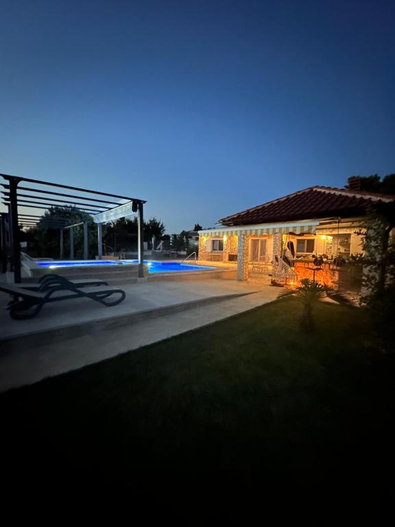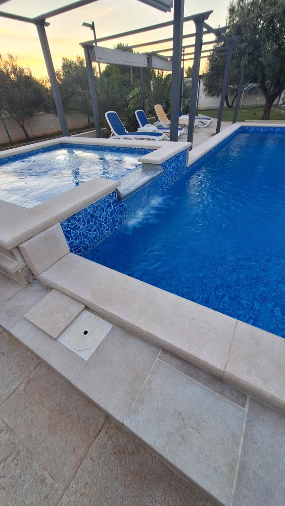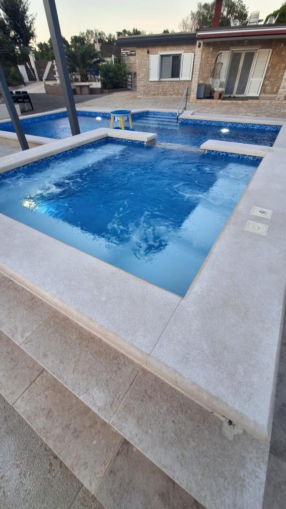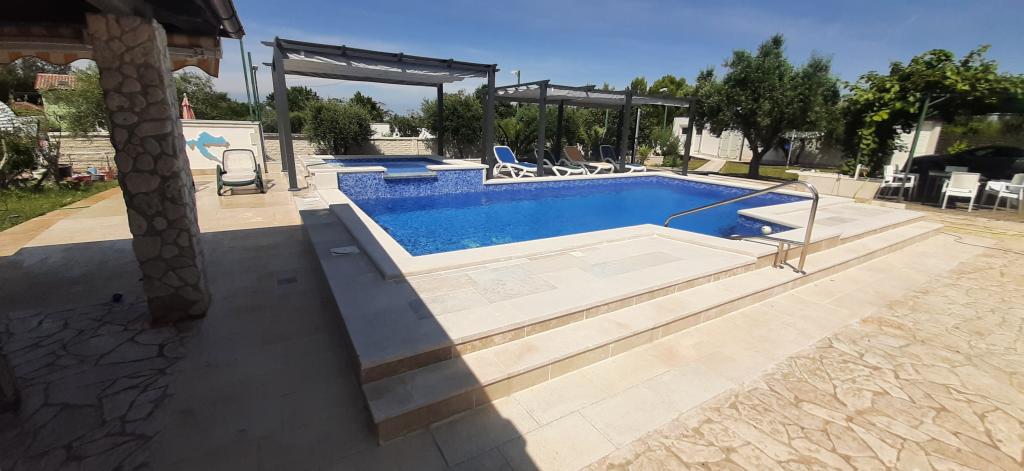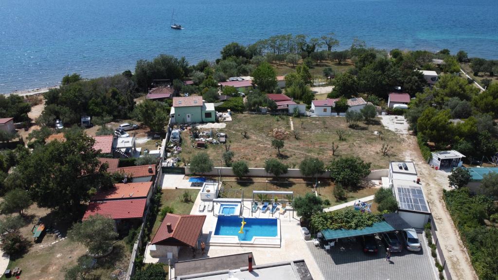 Üdülőház fűtött medencével és masszázsmedencével, mesterséges vízeséssel. A medence 8x4 m, a masszázsmedence 3 x 3 m. 200 méterre található a strandtól. A közelben található egy étterem, kikötő hajók számára és egy strand háziállatok számára. Grillezővel, 3 autó parkolásával.