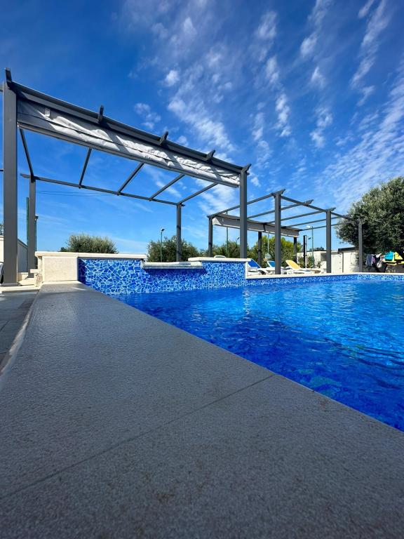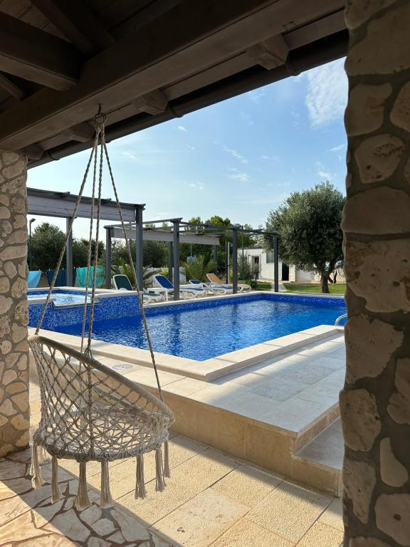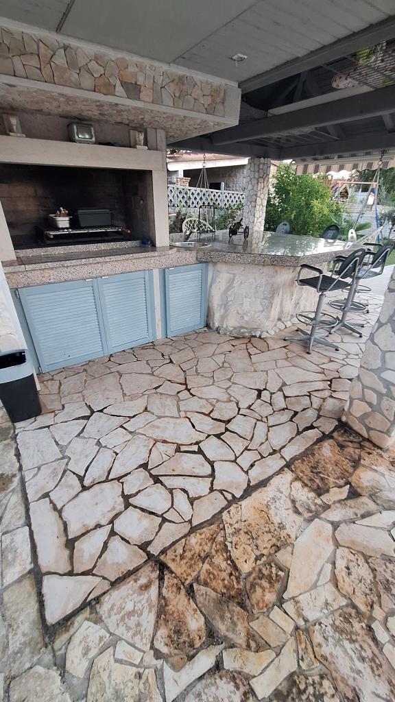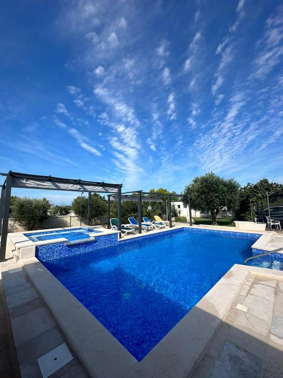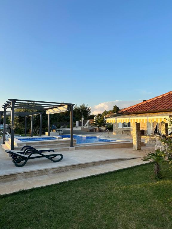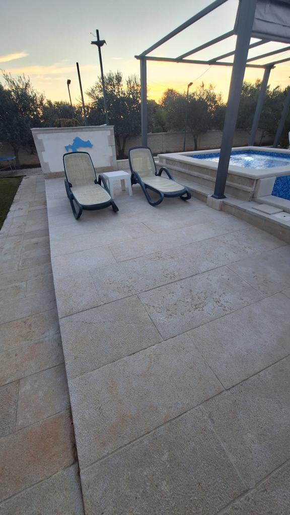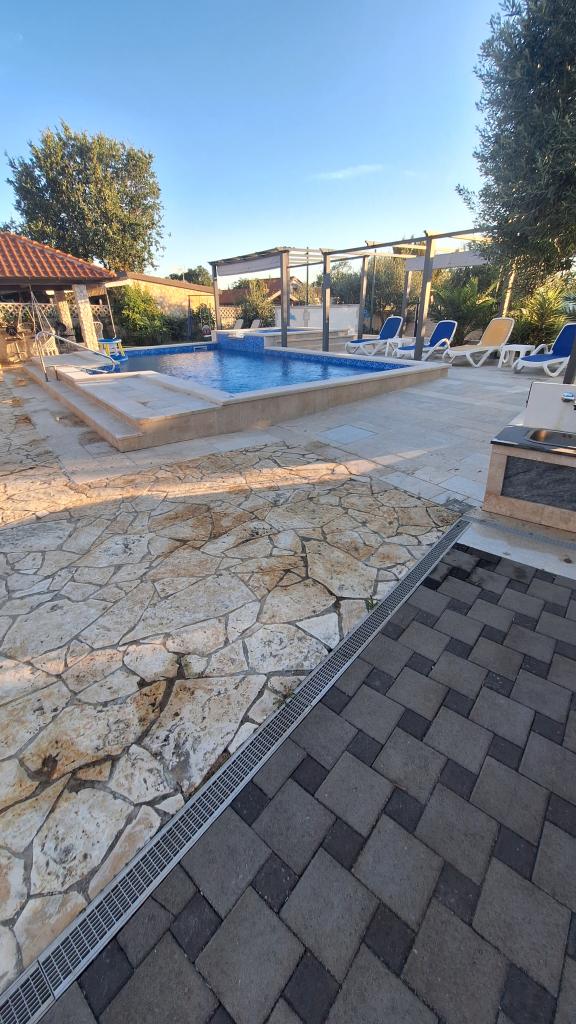 Üdülőház fűtött medencével és masszázsmedencével, mesterséges vízeséssel. A medence 8x4 m, a masszázsmedence 3 x 3 m. 200 méterre található a strandtól. A közelben található egy étterem, kikötő hajók számára és egy strand háziállatok számára. Grillezővel, 3 autó parkolásával.