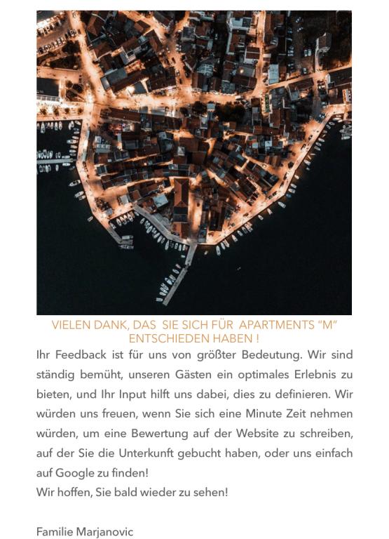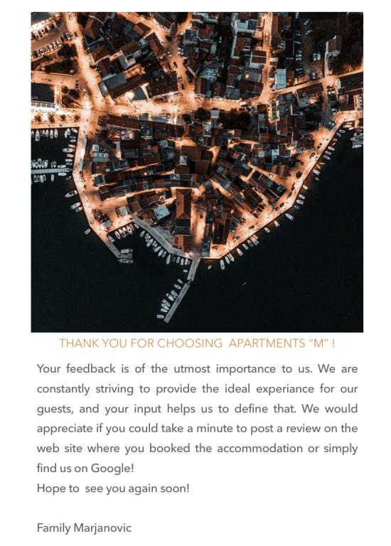 mindig örülünk, ha a vendégek megtalálják apartmanjainkban a kívánt nyugalmat és kikapcsolódást. Örülünk, hogy tetszett, és úgy döntött, hogy nyilvánosan megosztja benyomásait. Köszönöm! Ajtóink mindig nyitva állnak előtted, mert öröm, hogy hozzád hasonló vendégek érkeznek. Viszlát viszlát viszlát! Apartmanok M