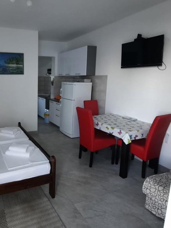 Egy szép, tágas stúdió, mindennel felszerelt, amire szükséged lehet, még egy mosógéppel is. Előtte egy gyönyörű, nagy terasz található grillezővel. Nyugalom és teljes magánélet, a tulajdonosok pedig mindenben kedvesek és segítőkészek. Néhány órával el kellett halasztanunk a visszautat, de semmi probléma nem volt, azonnal találtak megoldást a problémánkra. Ajánljuk, mint egy top úti célt!