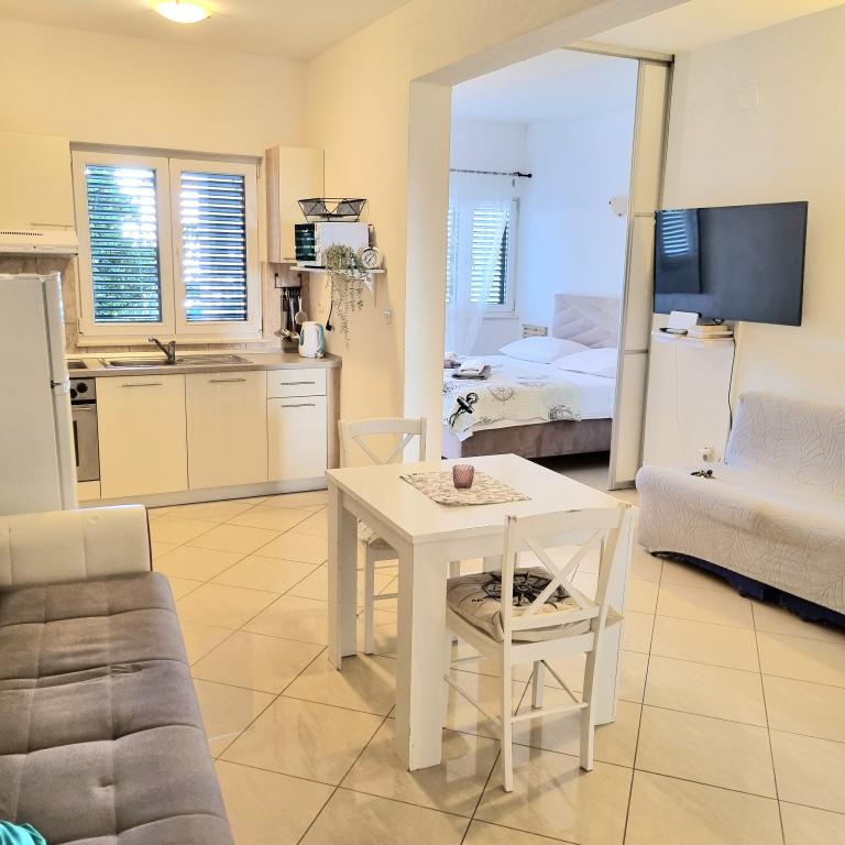 Rájöttem, ez a lakás három évvel ezelőtt, és én már oda minden évben. Helyezze a békés, csendes, és közel van a város Split, Omis, Makarska, ahol mindenki megtalálja a kedvére magukat. Tenger tiszta, meleg, strand, néhány lépésre a ház, és ingyenes napozóágyakkal, amelyek a házigazdák. szép, segítse minden helyzetben / még hajt, ha halat Split és a finom házi bor / 100m-re található piac jó ellátás és a buszmegálló, ahol a Mentés minden busz Split és Omis. Zárt parkoló, kert biztos grill.Cudowne kilátás az erkélyekről Én nagyon ajánlom