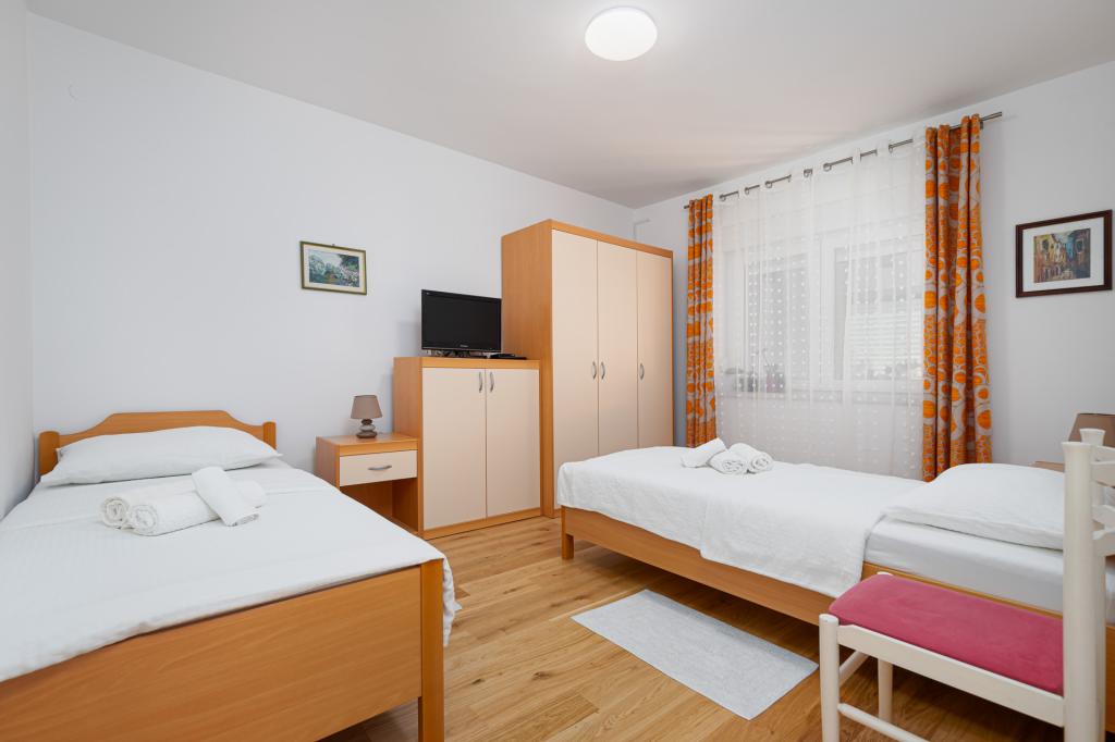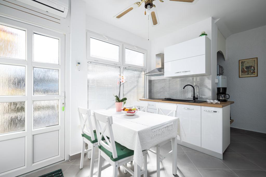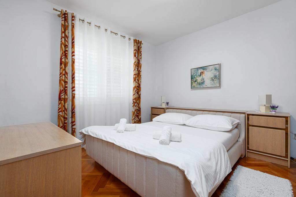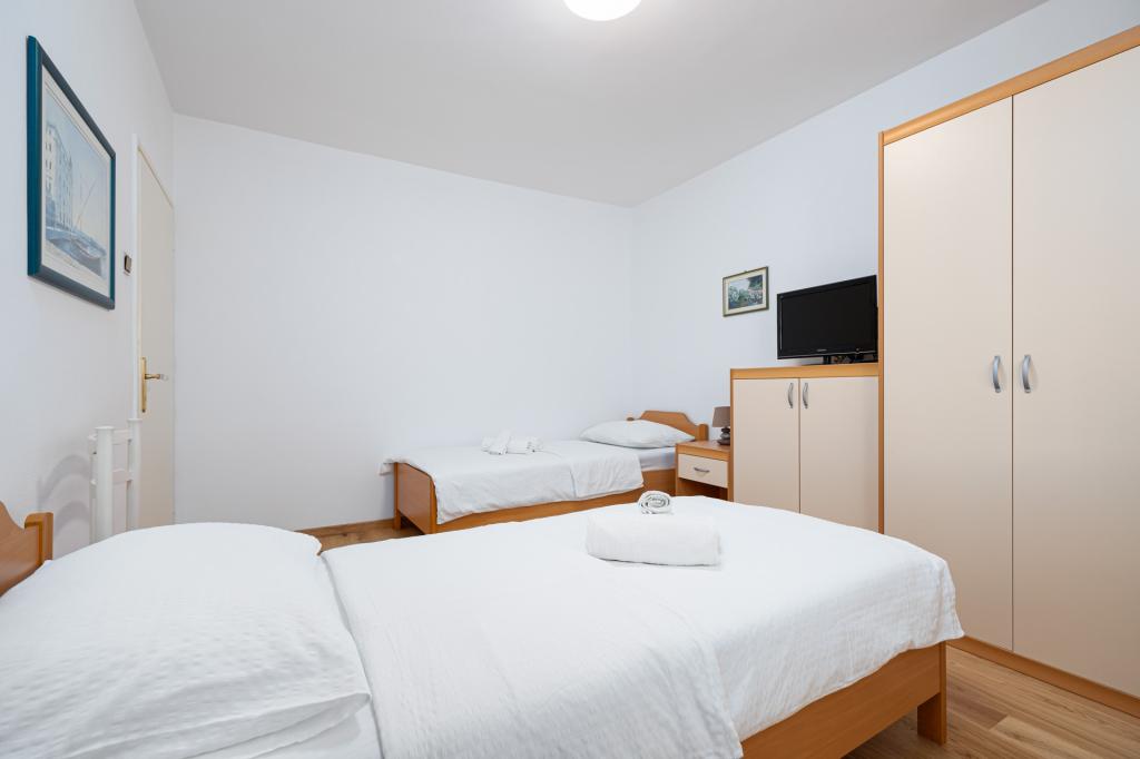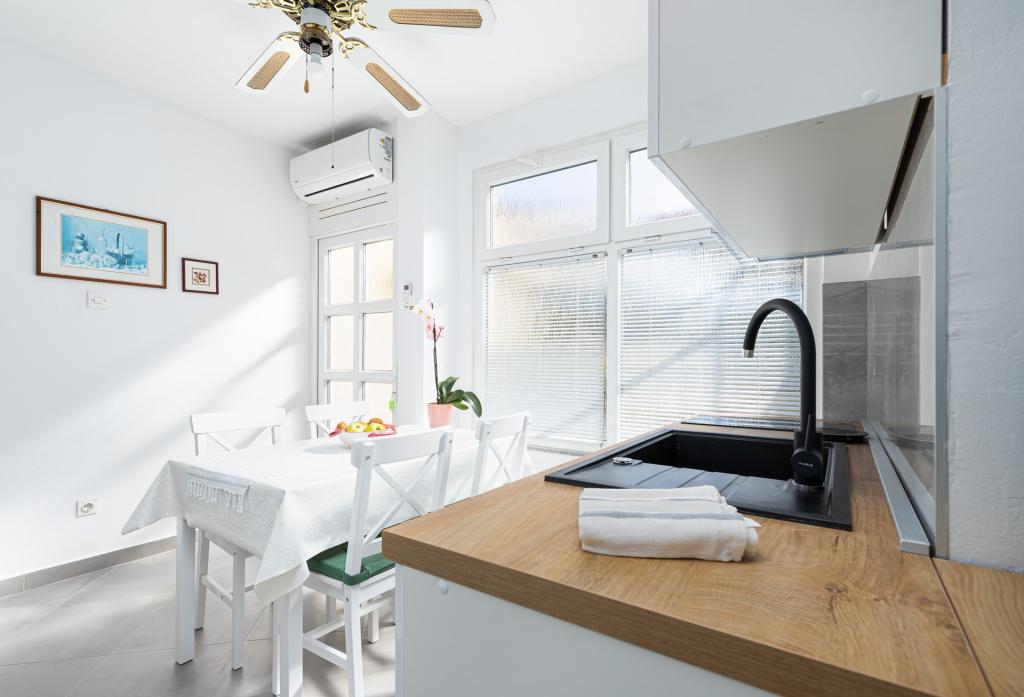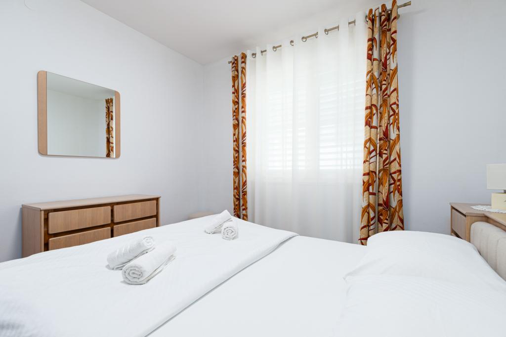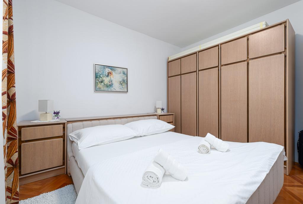 A lakás ízlésesen berendezett, maximum négy fő elszállásolására alkalmas. Tartalmaz egy nappalit, egy teljesen felszerelt konyhát, egy étkezőasztalt, egy hálószoba franciaággyal, egy hálószoba két egyszemélyes ággyal, síkképernyős TV-vel és egy fürdőszoba. A lakás előtt, nagyon kellemes légkörben, pihenősarok található. Az apartman bérleti díja tartalmazza: ágynemű, törölköző, Wi-Fi, légkondicionálás használatát.