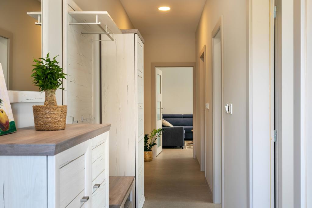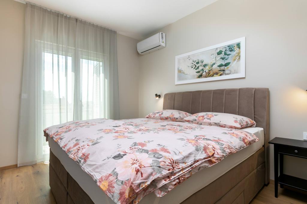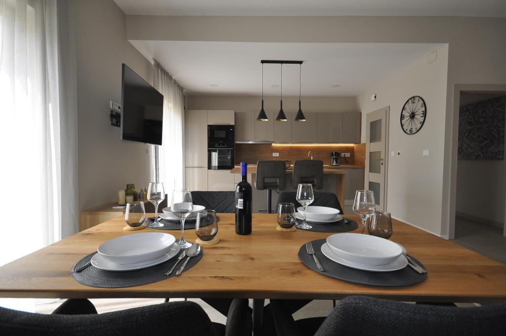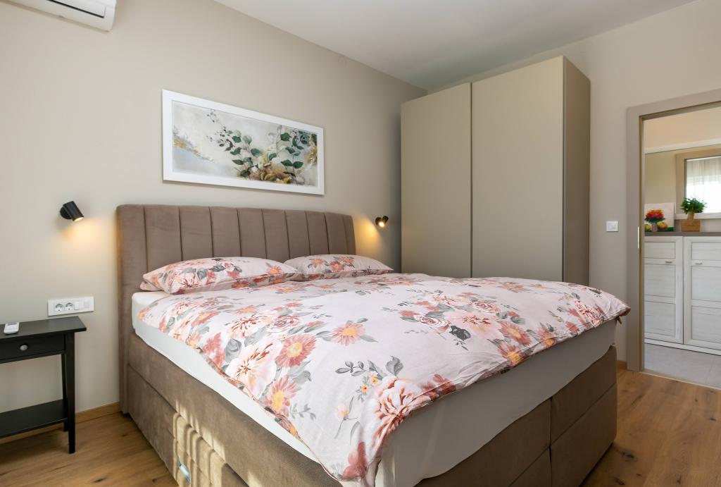 Poreč, Apartman Nona Ana, felújított apartman egy hálószobával, fürdőszobával, tágas nappalival, étkezővel és konyhával, valamint erkéllyel. A konyhában mosogatógép, mikrohullámú sütő, sütő, filteres kávéfőző és eszpresszó kávéfőző, vízforraló és kenyérpirító található. Az apartmanban műholdas TV, Wi-Fi, hajszárító, vasaló a ruha vasalásához és mosógép is található a fürdőszobában. A lakás fűtését és hűtését a nappaliban és a hálószobában található inverteres klíma biztosítja. A lakás az 1. emeleten található. Parkolóhely biztosított az udvarban. A tenger távolsága mindössze 900-1000 m, a piac 500 m, az étterem 600 m, a központ távolsága 2500 m.