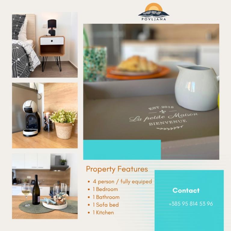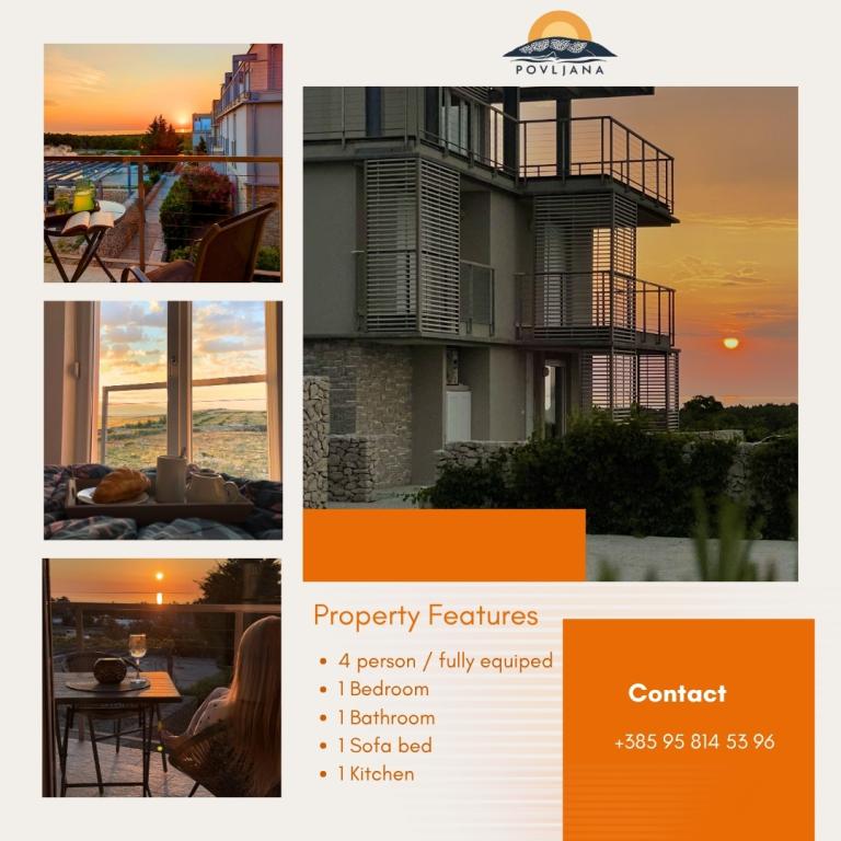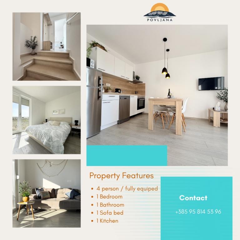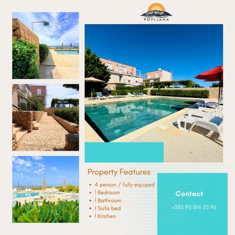 Modern felszereltségű apartman a Rastavac-félszigeten, kilátással Povljana és Velebit szigeteire, a Lijepi otok komplexumon belül. Az apartman teljesen felszerelt a kényelmes tartózkodáshoz. 1 hálószobából áll, amelyben egy franciaágy, valamint egy kihúzható pótágy található a nappaliban 2 fő részére. Az apartman vendégei számára ingyenes parkolási lehetőség, medence, grillező és közös játszótér (hinták, asztalitenisz) áll rendelkezésre. A komplexum alatt, 150 méterre egy csendes homokos strand található. Kavicsos és egyéb nyilvános homokos strandok 2-4 km-re találhatók. A közvetlen közelben (200 m) található az újonnan megnyílt Amines Avalon kemping, a kempingbe a belépés ingyenes (elérhető szolgáltatások: üzlet, edzőterem, pékség, étterem, aquapark). Povljana központja 4 km-re található. Ha nyugodt nyaralásra, lélegzetelállító napfelkeltékre és naplementékre, kristálytiszta tengerre és érintetlen természetre vágyik, Povljana a megfelelő választás az Ön számára.