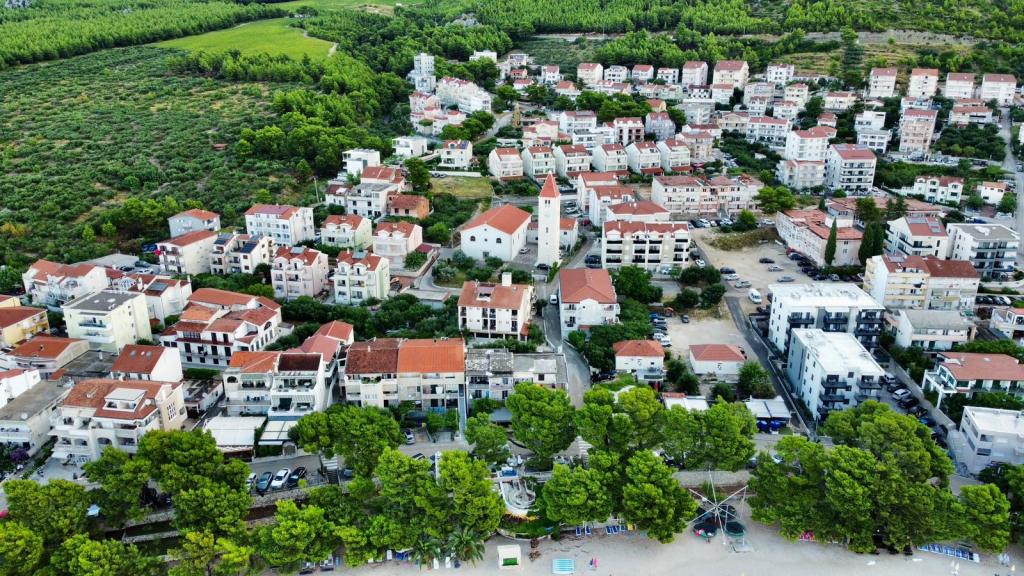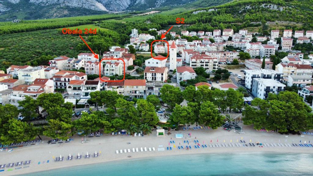 Az S2 apartman (2+2) Promajna városában található, a városközpontban, közvetlenül a templom felett (északra) - kb. 100 méterre a fő strandtól, a Prilaz obali 24. szám alatt. Az apartman mellett egy autó számára van parkolóhely.