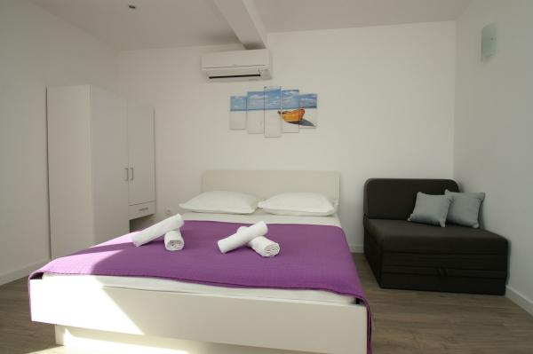 A Wi-Fi jel a lakásban rendkívül rossz, és az internet kapcsolat nagyrészt hiányzik. Nincs HT mobil internet (nincs jel). Habár 3 fő befogadására alkalmas, ez valójában egy 2 fős stúdió, mivel a segédágy valójában egy kemény és kényelmetlen kanapé, és ugyanazon az egyenes kínzáson alszik, és nem pihen. A konyha nagyon szerényen fel van szerelve konyhai eszközökkel és konyhai eszközökkel. Az asztal és a székek csak a teraszon vannak. Mindent összevetve, ez a stúdió alkalmas két embernek, akiknek szüksége van egy helyre, ahol aludni és étkezni, és akik nem terveznek semmit az éves szabadságuk alatt. Azonban a lakás ára teljesen túl magas az ilyen ajánlatért. Határozottan a legnagyobb mínusz ebben a lakásban a házigazdák középpontjában csak a pénz, míg a vendég elégedettsége teljesen irreleváns. Domicil Dijana rendkívül kegyetlen és szakszerűtlen.