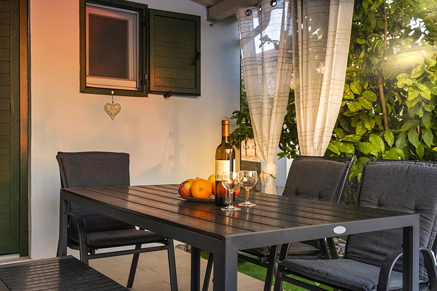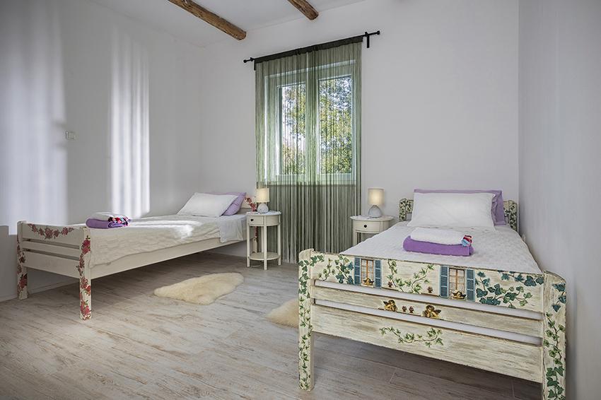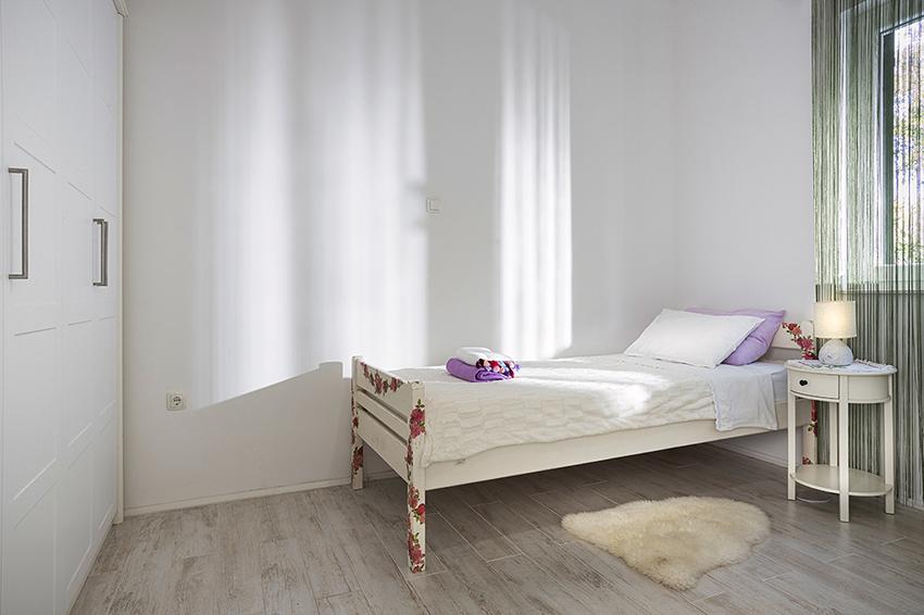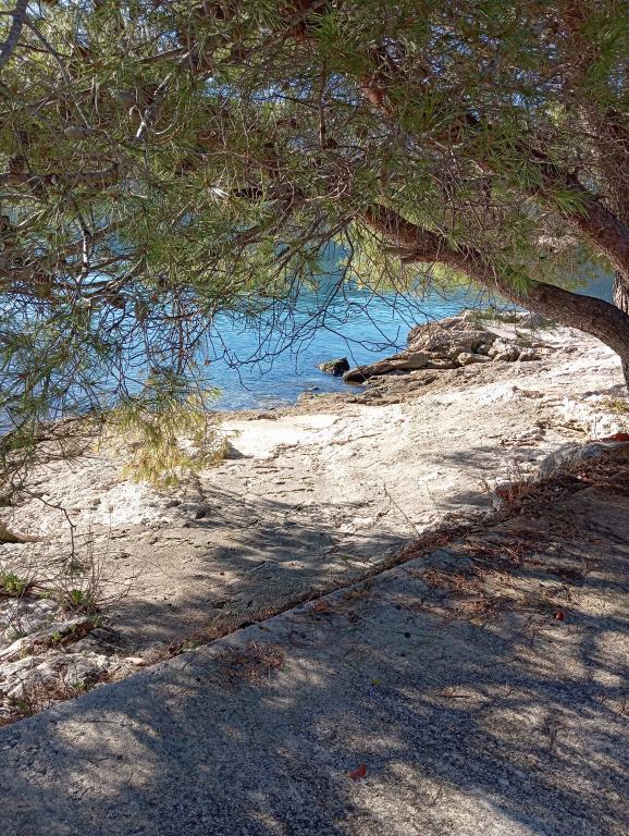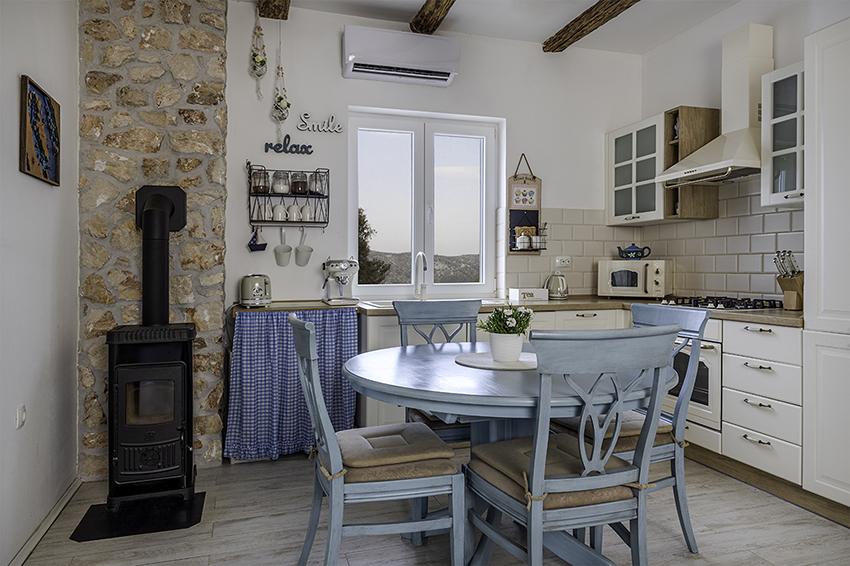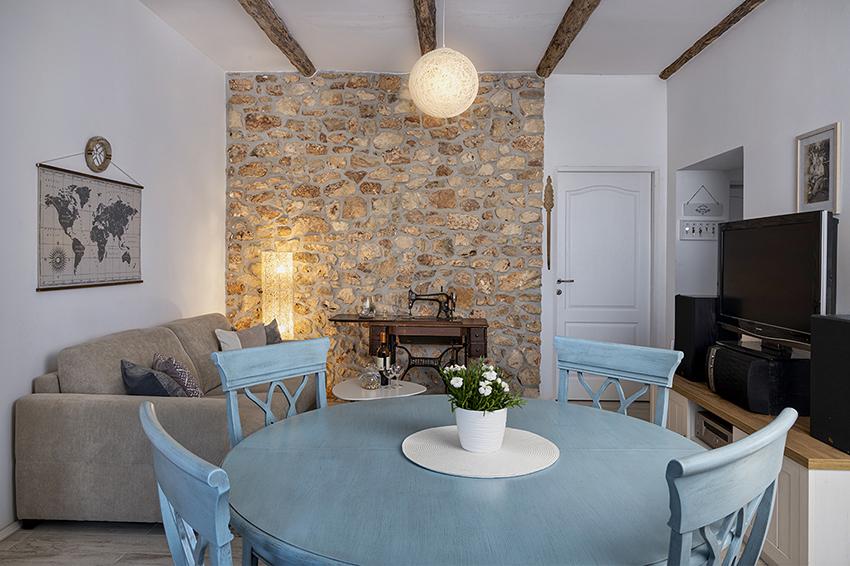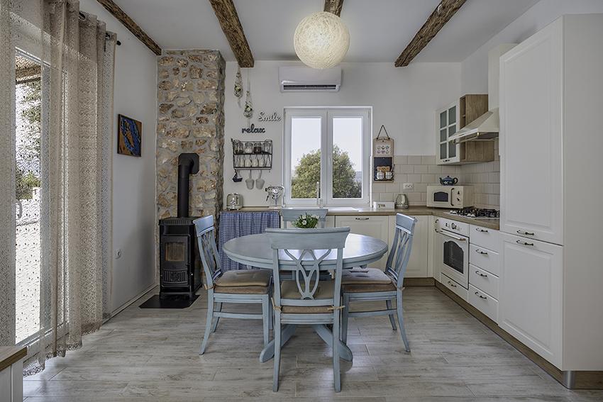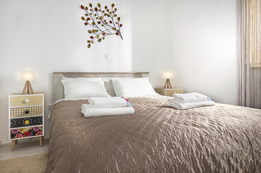 Az apartman a falu régebbi részén, egy félreeső helyen található a domb tetején (75 m-től 82 m-ig tengerszint felett), így élvezni fogja a békét és a csendet. 100 m-re van a legközelebbi strandtól, gyalogosan a régi úton vagy gyalog, illetve az új úton autóval is megközelíthető. A konyha korszerűen felszerelt és használható hűtő fagyasztóval, sütő, mosogatógép, kávéfőző, kenyérpirító, vízforraló, mikrohullámú sütő. Az épületben klíma és padlófűtés van. A fürdőszoba mosógéppel felszerelt. A lakás két szobás. Az egyikben egy franciaágy, a másikban pedig két összetolható egyszemélyes ágy található. A tágas teraszon is élvezheti a szabadidőt.