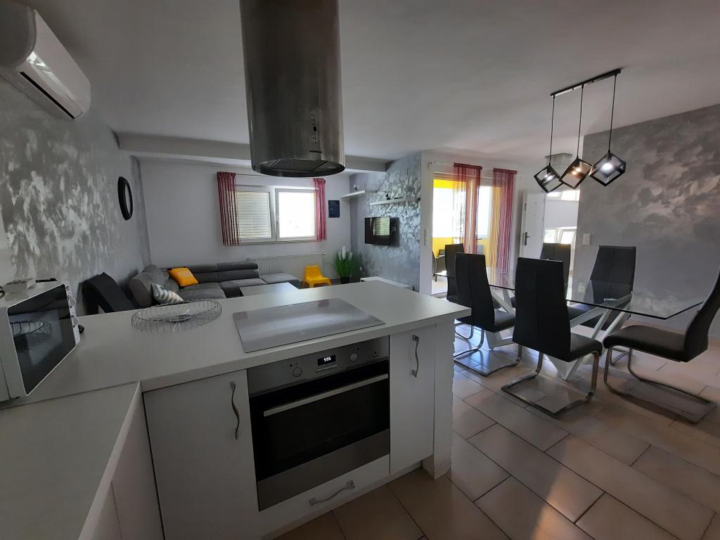 ÜDVÖZÖLJÜK a FLOBI apartmanokban! Öt szépen berendezett apartmanunk mindössze 300 méterre található a népszerű kavicsos strandtól. 3 csillagos apartmanjaink jól felszereltek légkondicionálóval, ingyenes wifivel, műholdas TV-vel, teljesen felszerelt konyhával és saját erkéllyel, ahonnan gyönyörű kilátás nyílik a tengerre. Mosógép kérésre rendelkezésre áll. Ingyenes parkolás és egy grillezőhely is rendelkezésre áll. Különösen kényelmes, hogy néhány perces sétával elérheti a mindennapi igényeket kielégítő összes üzletet (például szupermarketek, pékség, hentes, orvosok, gyógyszertár, posta, bankautomata, éttermek, kávézók, piac és templom). Ha további kérdése van, forduljon hozzánk bizalommal a foglalási űrlapon keresztül. Az Apartments FLOBI szeretettel várja érkezését!