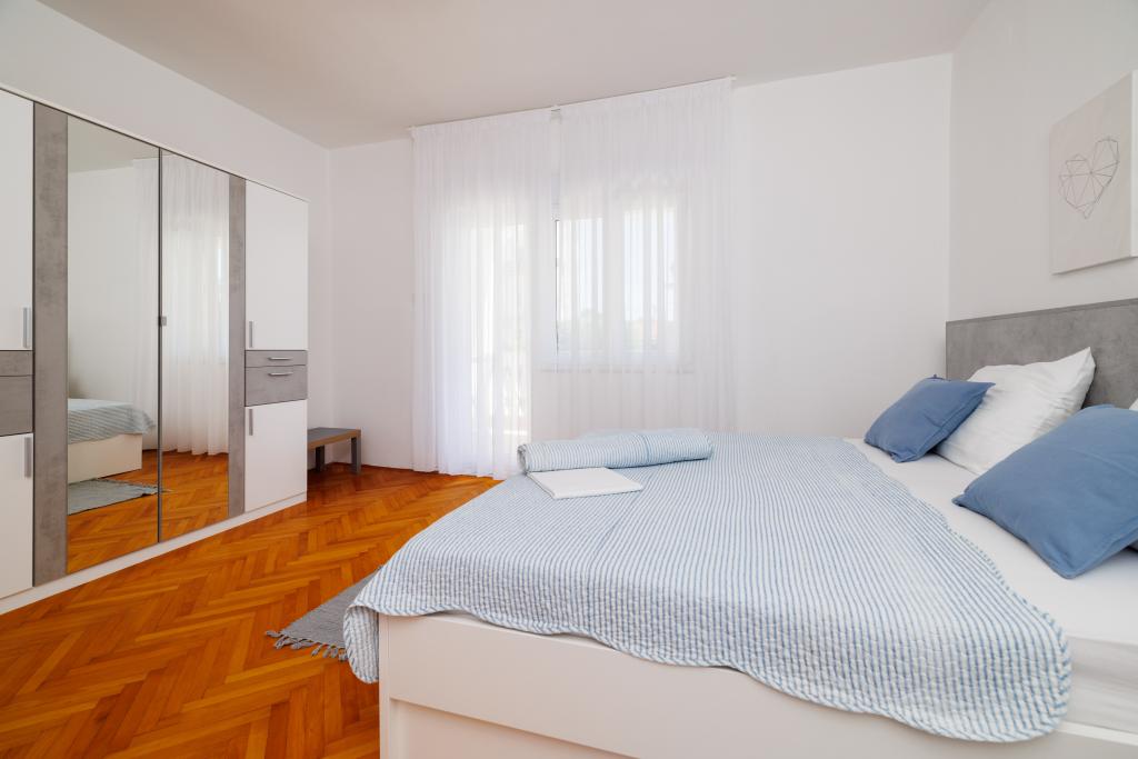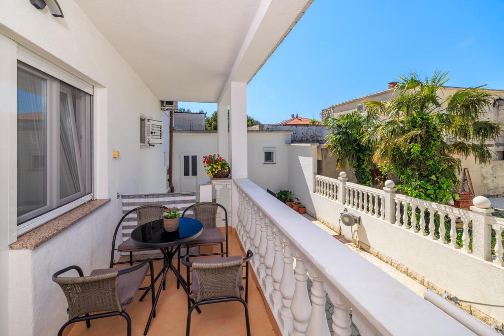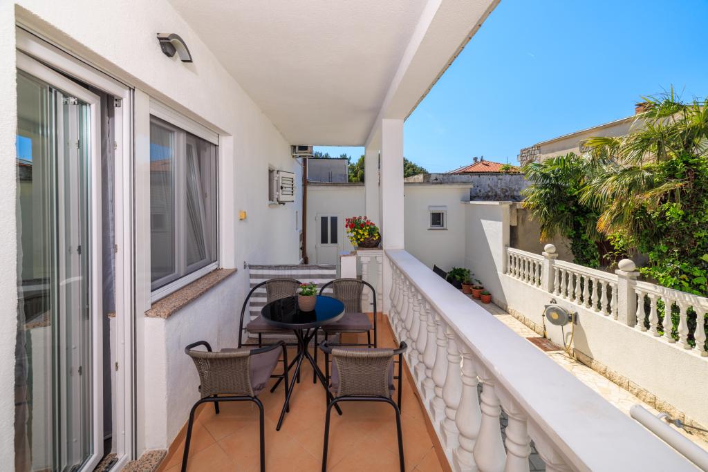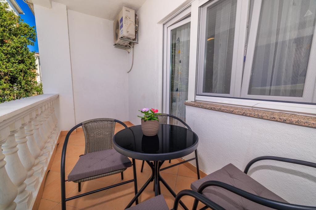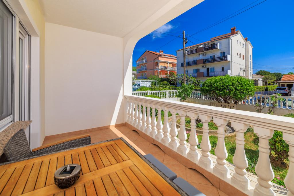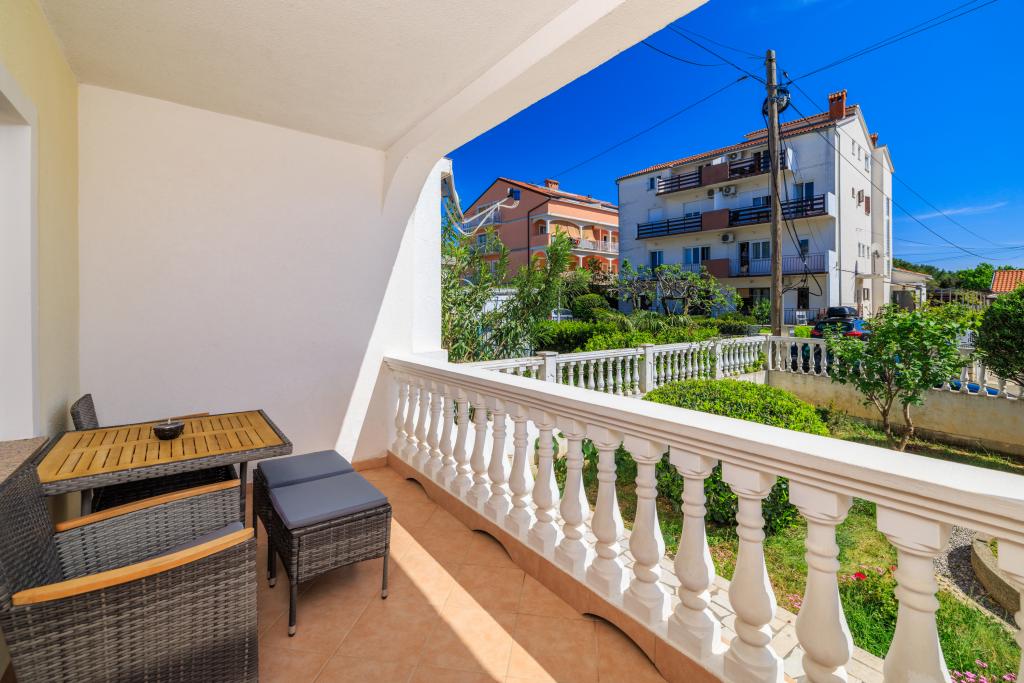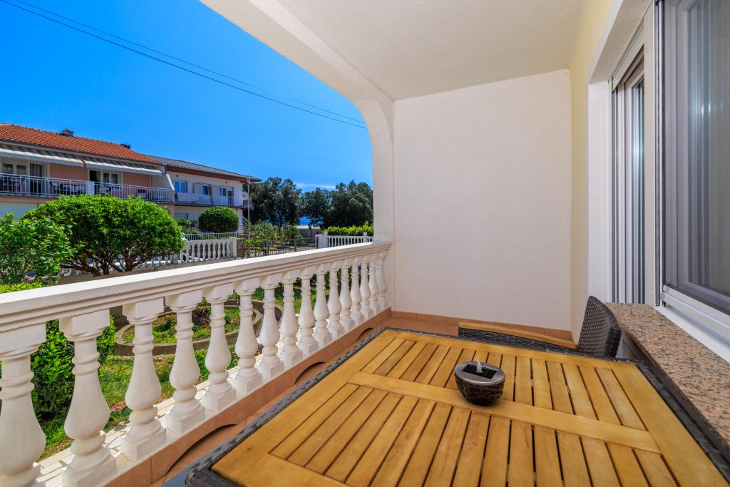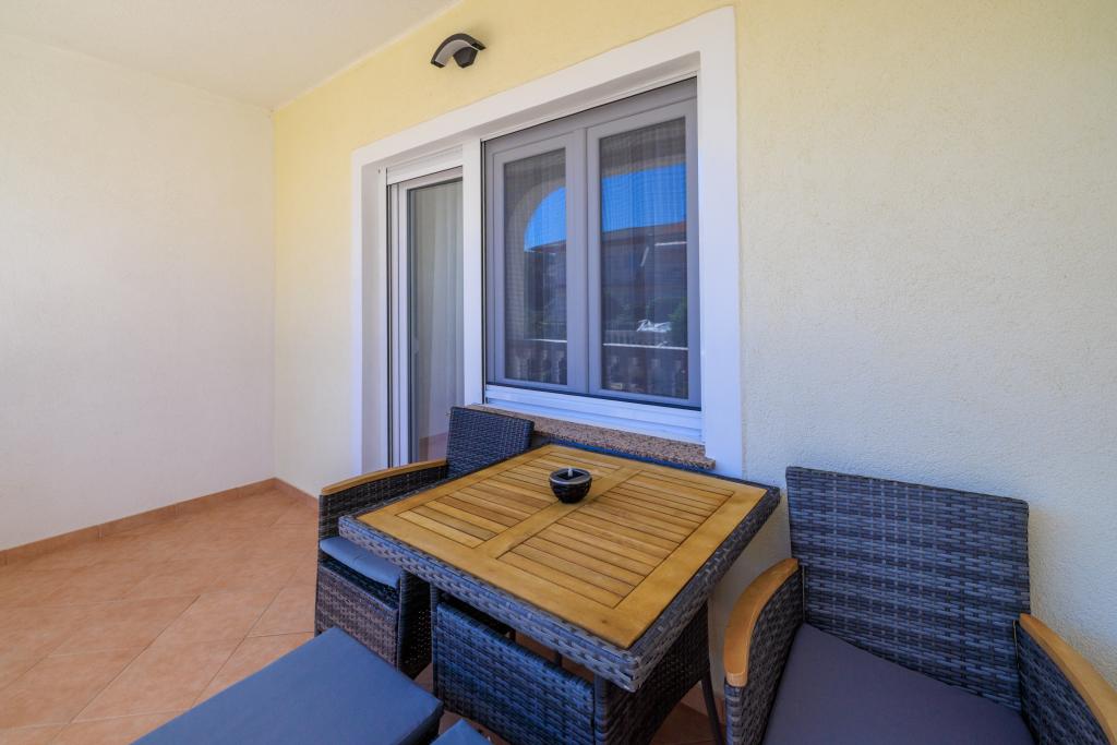 Az apartman egy családi házban található, közvetlenül a parkoló mellett, néhány percre a tengertől és a híres Rokan strandtól. Az egész várost átszelő sétányon számos étterem, kávézó, sportolási lehetőség és üzlet található. Az apartmanban két nagy kétágyas hálószoba található, melyekben egy-egy pótágy /kihajtható/, egy konyha étkezővel, ahol egy sarokkanapé és egy TV található, valamint egy tágas fürdőszoba káddal és zuhanyzóval. A fürdőszobában mosógép található. Minden szoba és konyha egy fedett teraszra nyílik.