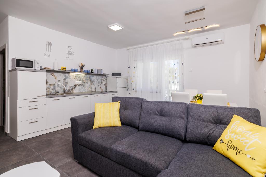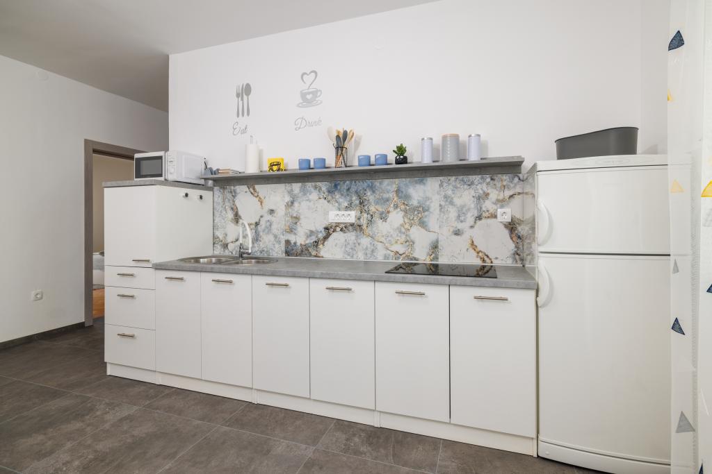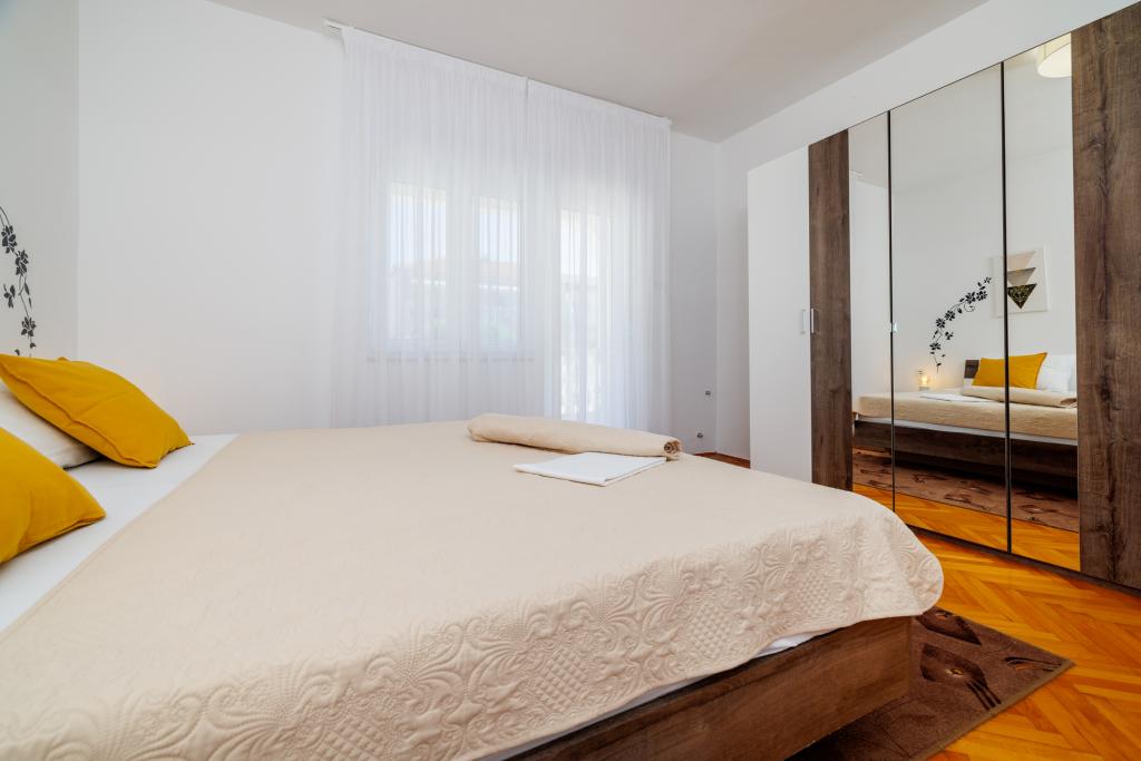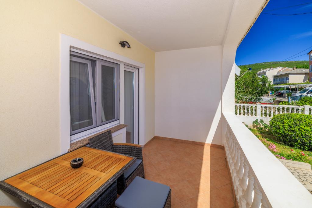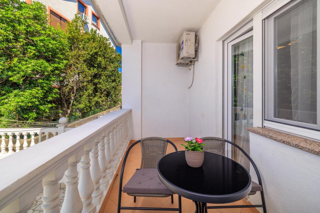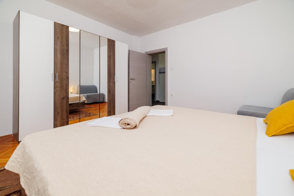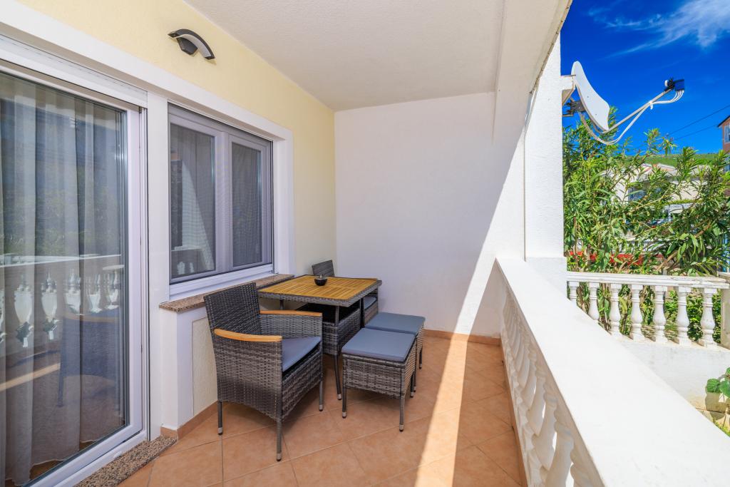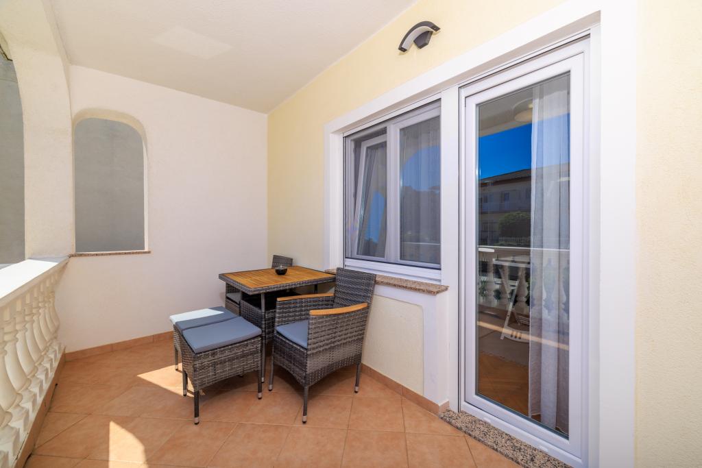 Az apartman egy családi házban található, közvetlenül a parkoló mellett, néhány percre a tengertől és a híres Rokan strandtól. Az egész várost átszelő sétányon számos étterem, kávézó, sportolási lehetőség és üzlet található. Az apartmanban két nagy kétágyas hálószoba található, melyekben egy-egy pótágy /kihajtható/, egy konyha étkezővel, ahol egy sarokkanapé és egy TV található, valamint egy tágas fürdőszoba káddal és zuhanyzóval. A fürdőszobában mosógép található. Minden szoba és konyha egy fedett teraszra nyílik.