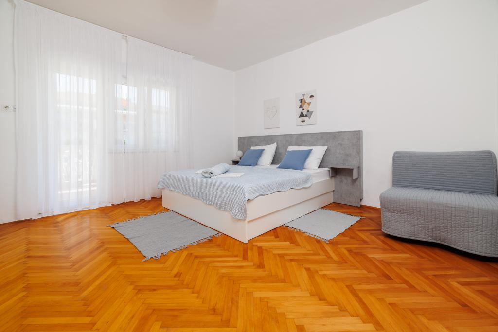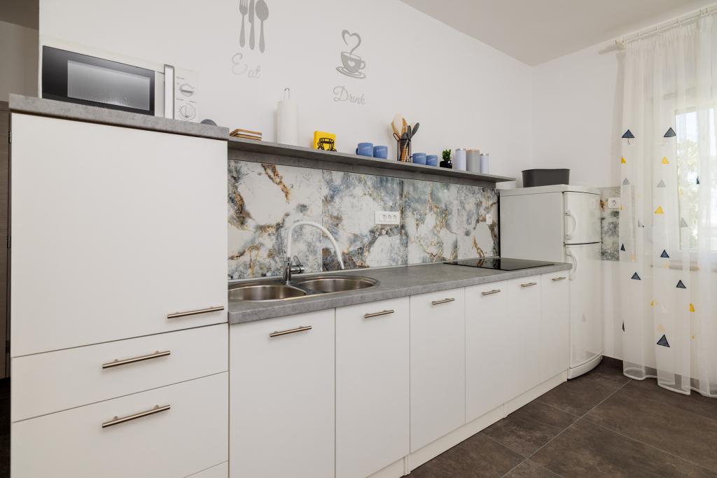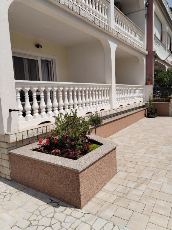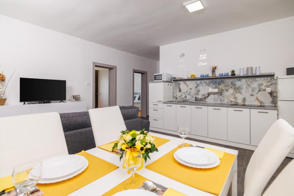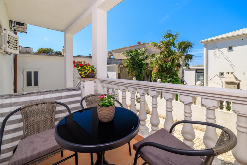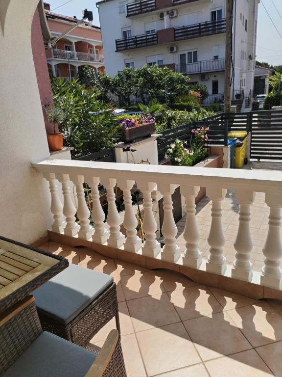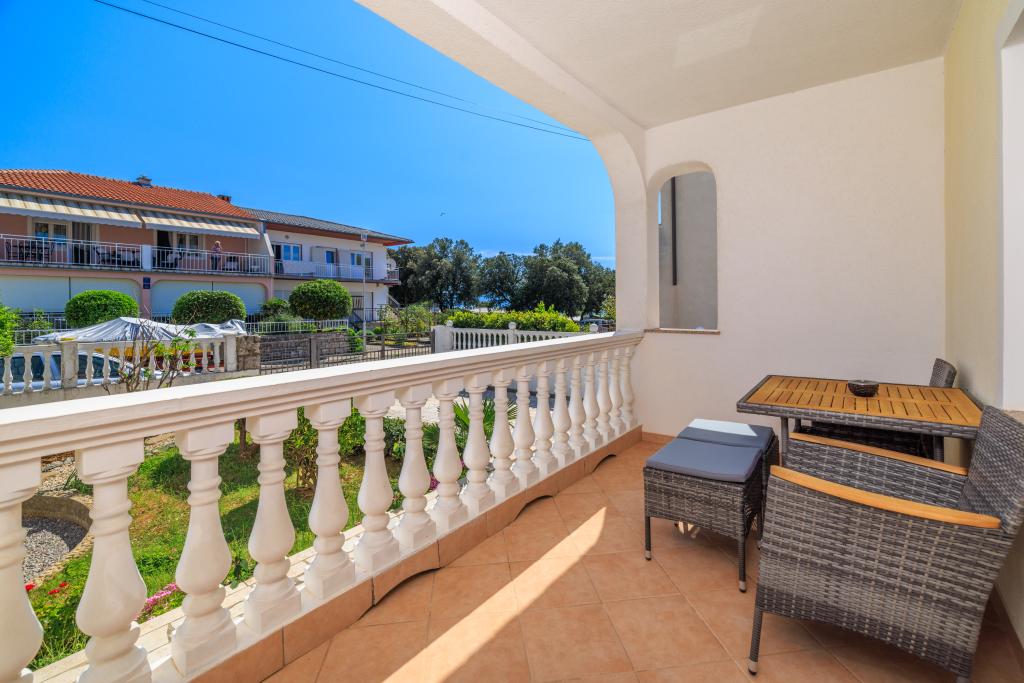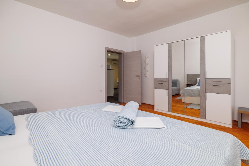 Az apartman egy családi házban található, közvetlenül a parkoló mellett, néhány percre a tengertől és a híres Rokan strandtól. Az egész várost átszelő sétányon számos étterem, kávézó, sportolási lehetőség és üzlet található. Az apartmanban két nagy kétágyas hálószoba található, melyekben egy-egy pótágy /kihajtható/, egy konyha étkezővel, ahol egy sarokkanapé és egy TV található, valamint egy tágas fürdőszoba káddal és zuhanyzóval. A fürdőszobában mosógép található. Minden szoba és konyha egy fedett teraszra nyílik.