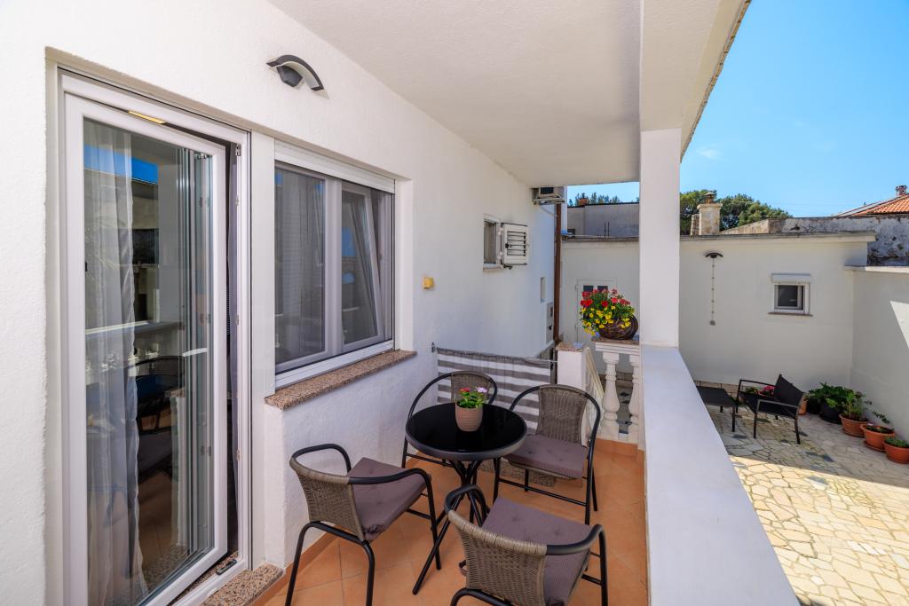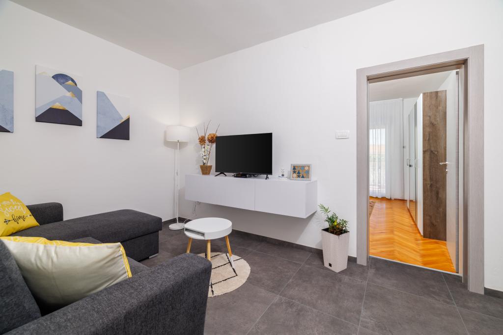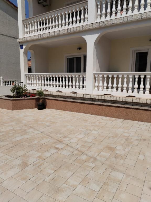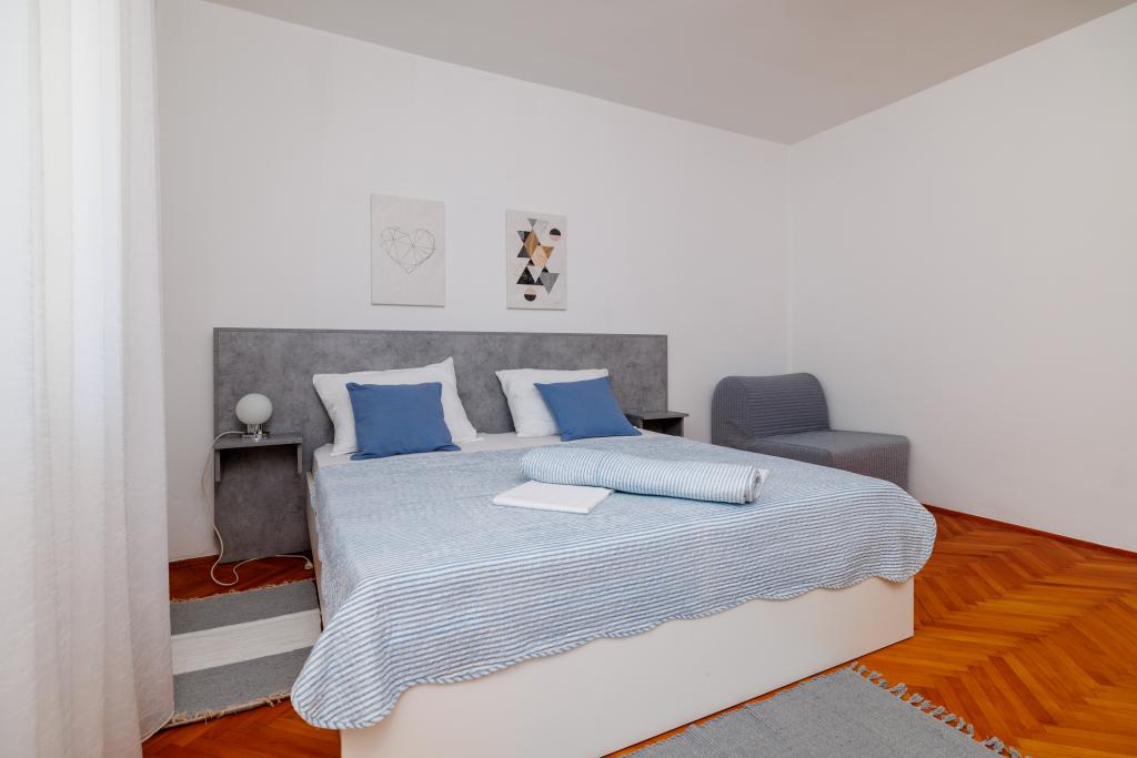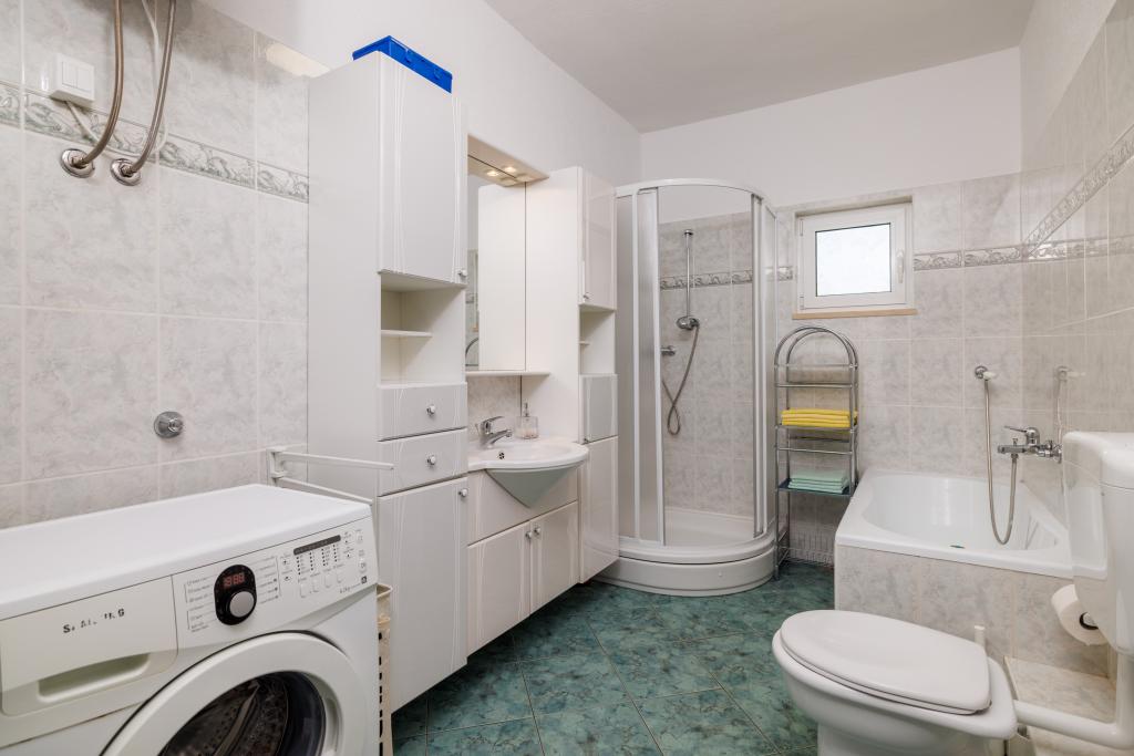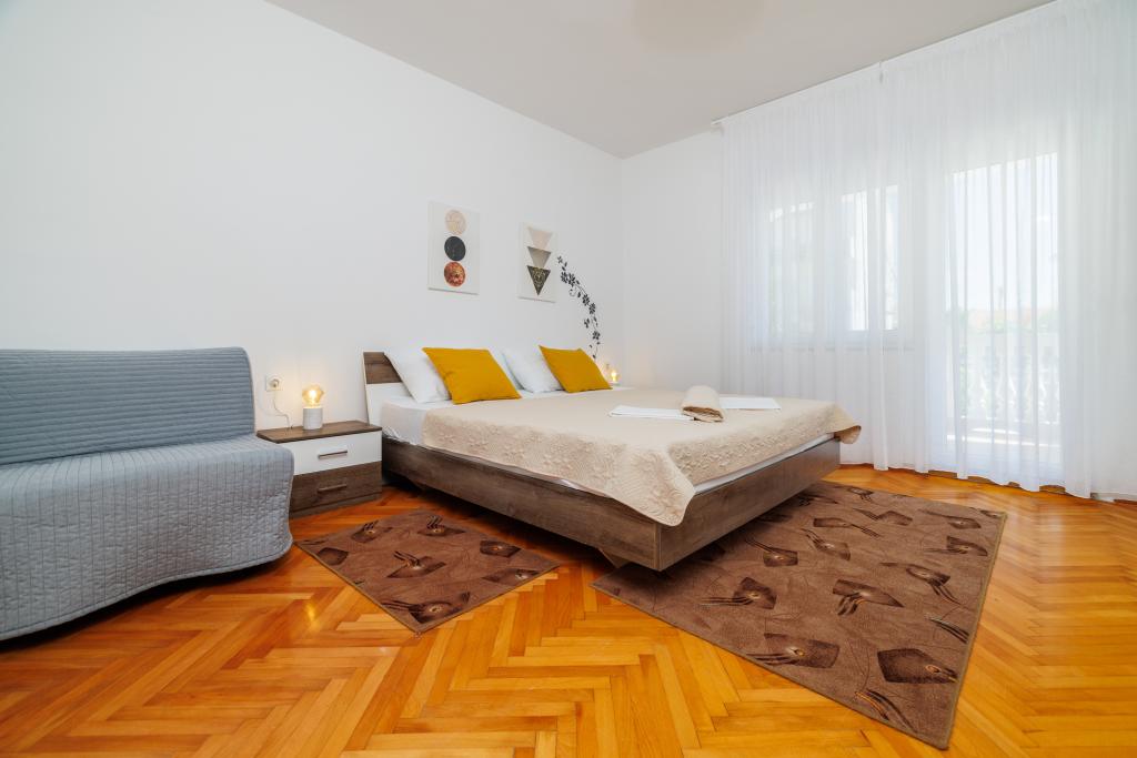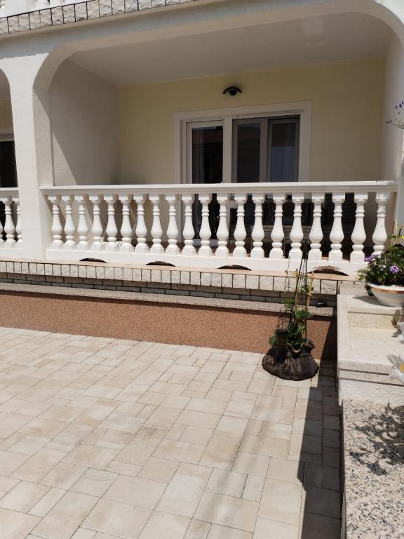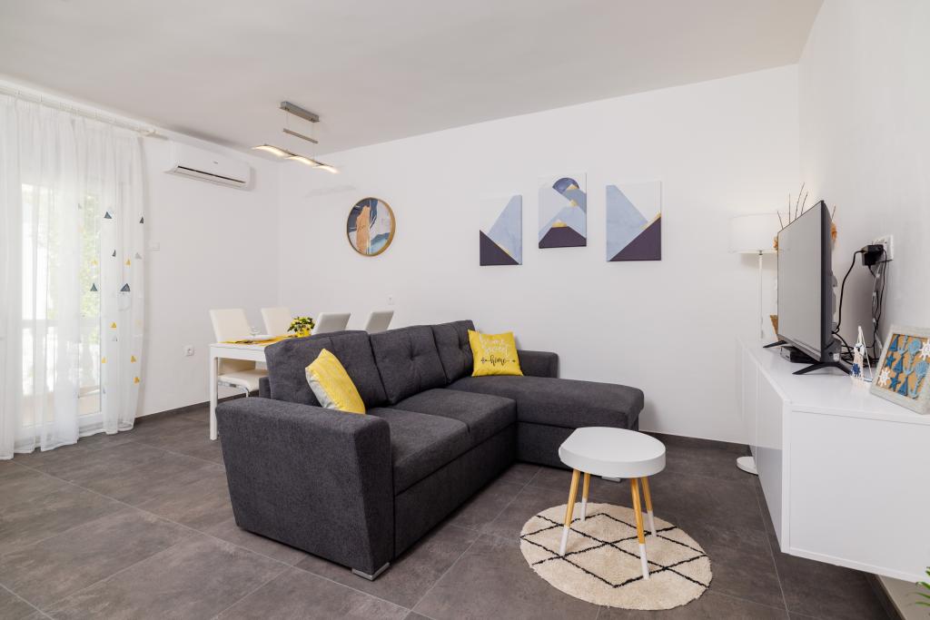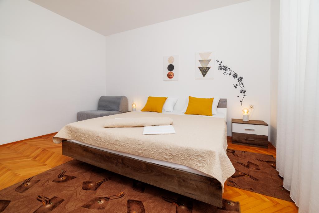 Az apartman egy családi házban található, közvetlenül a parkoló mellett, néhány percre a tengertől és a híres Rokan strandtól. Az egész várost átszelő sétányon számos étterem, kávézó, sportolási lehetőség és üzlet található. Az apartmanban két nagy kétágyas hálószoba található, melyekben egy-egy pótágy /kihajtható/, egy konyha étkezővel, ahol egy sarokkanapé és egy TV található, valamint egy tágas fürdőszoba káddal és zuhanyzóval. A fürdőszobában mosógép található. Minden szoba és konyha egy fedett teraszra nyílik.