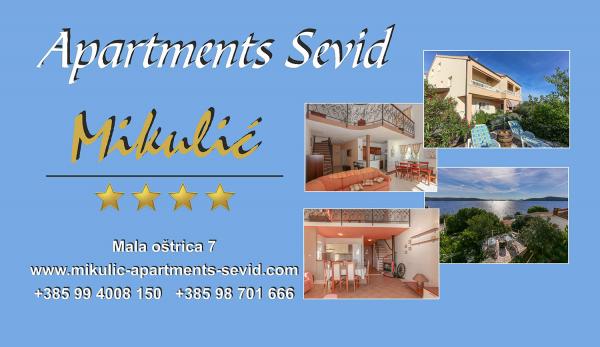 Sevid na moru, eléggé elrejtve a város tömege elől, de elég közel ahhoz, hogy mindent lássunk. Az érintetlen természet napos, rejtett sarka, ideális egy igazi mediterrán nyaraláshoz. Bár kicsi, Sevidben minden megtalálható, amire szüksége lehet. Ideális gyermekes családok számára a forró nyári napokon és télen is. A Mikulić apartmanok a Sevid-félsziget keleti oldalán találhatók, 20 méterre a tengertől, gyönyörű kilátással a tengerre, a környező szigetekre és a zöldellő kertre. Az apartmanok 4 csillagosak és igazi luxus nyaralóvillának nevezhetők. A vendégek használhatják a kertet grillezővel, a mediterrán kertet, a parkolót, a strandot csónakkikötővel. A homokos strand nagyon közel van a házhoz. lehetőséget kínálunk a lakással együtt csónak bérlésére (motorcsónak vagy kishajó). vízibiciklit, jet-skit, sup deszkát, kerékpárt is kínálunk. Isten hozott!!!