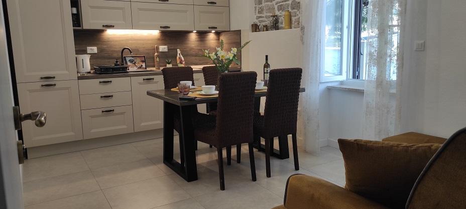 Šolta szigete, STOMORSKA - Érezze egy régi dalmát város szellemét a festői vízpart közepén található magánházban található apartmanokban (első sor a tenger felé). A teraszról gyönyörű kilátás nyílik a helyre, a tengerre, az öbölre. Kávézók, éttermek, üzletek, strandok... minden a közelben van az apartmantól, pár perc sétára. A nagyobb apartmanban két hálószoba, két fürdőszoba és egy nappali konyhával és terasszal rendelkezik. A kisebb apartmanban nappali-konyha, külön hálószoba és fürdőszoba található. A lakás előtt egy nappali található. Az apartmanokat úgy tervezték és felszerelték, hogy minden igényt kielégítsenek, csak gyere és élvezd. A ház zöldellő, dalmát stílusban díszített udvarral, kandallóval és szabadtéri zuhanyzóval rendelkezik. A vendéglátók, valamint parkolóhelyek állnak a vendégek rendelkezésére