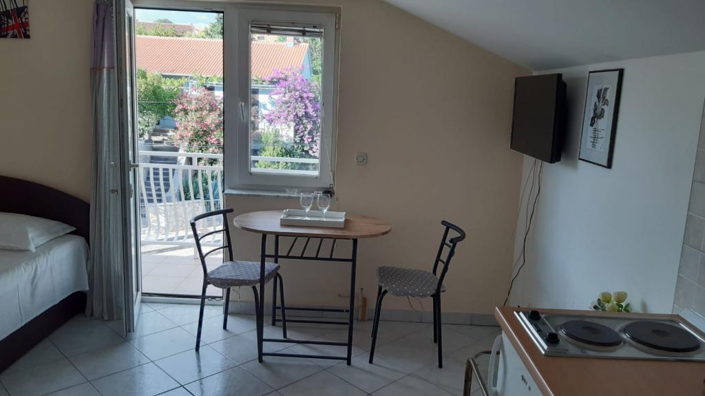 Az apartman egy családi ház első emeletén található, egy kisváros központjában. 3-5 perc alatt elérhető a vízpart, a posta, a bank, a templom, az orvosok, a kis sportok játszóterei. A strand a vízpartról indul, balra és jobbra húzódik. A strand minden korosztály számára alkalmas. Az apartmanok saját parkolóval rendelkeznek. Más létesítmények közelsége miatt autóra általában nincs szükség. Az apartmanok ingyenes internettel, légkondicionálóval és új SMART TV-vel rendelkeznek.