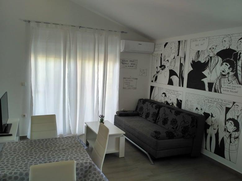 Egy apartmanban voltunk, ahonnan az egyik oldalon a tengerre, a másikon egy olajfaligetre nyílik kilátás - tiszta idill. A lakás modern berendezésű (Alan Ford a falon azonnal megnyert minket), tiszta és közel található a városközponthoz és a homokos strandhoz, ahol megszálltunk. A kellemes házigazdák véget vetettek a tökéletes nyaralásnak.