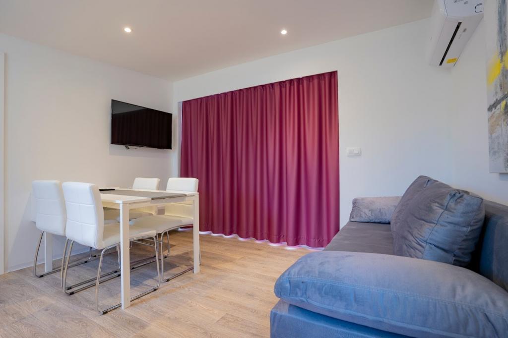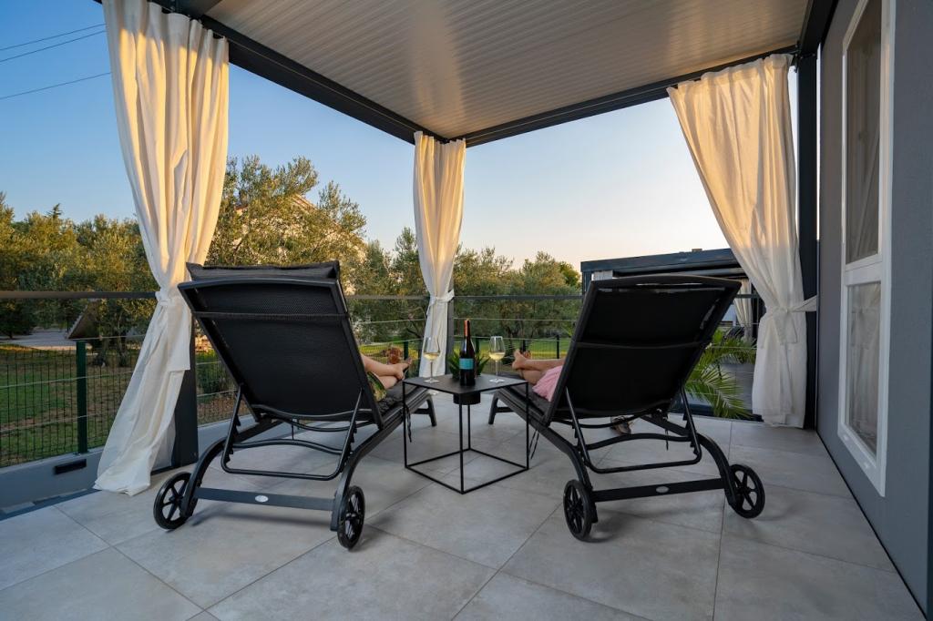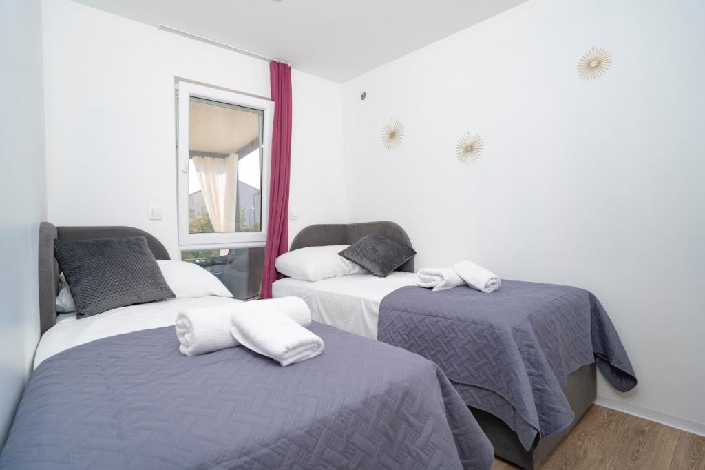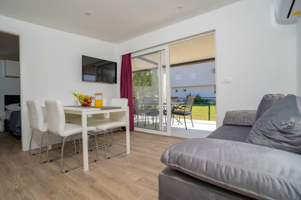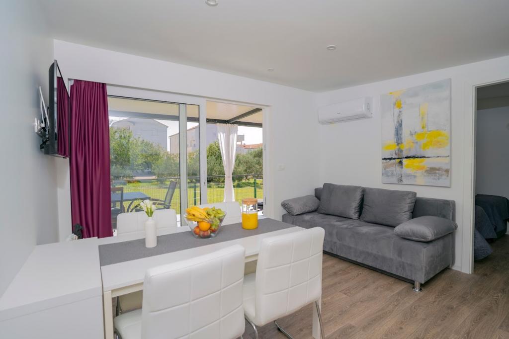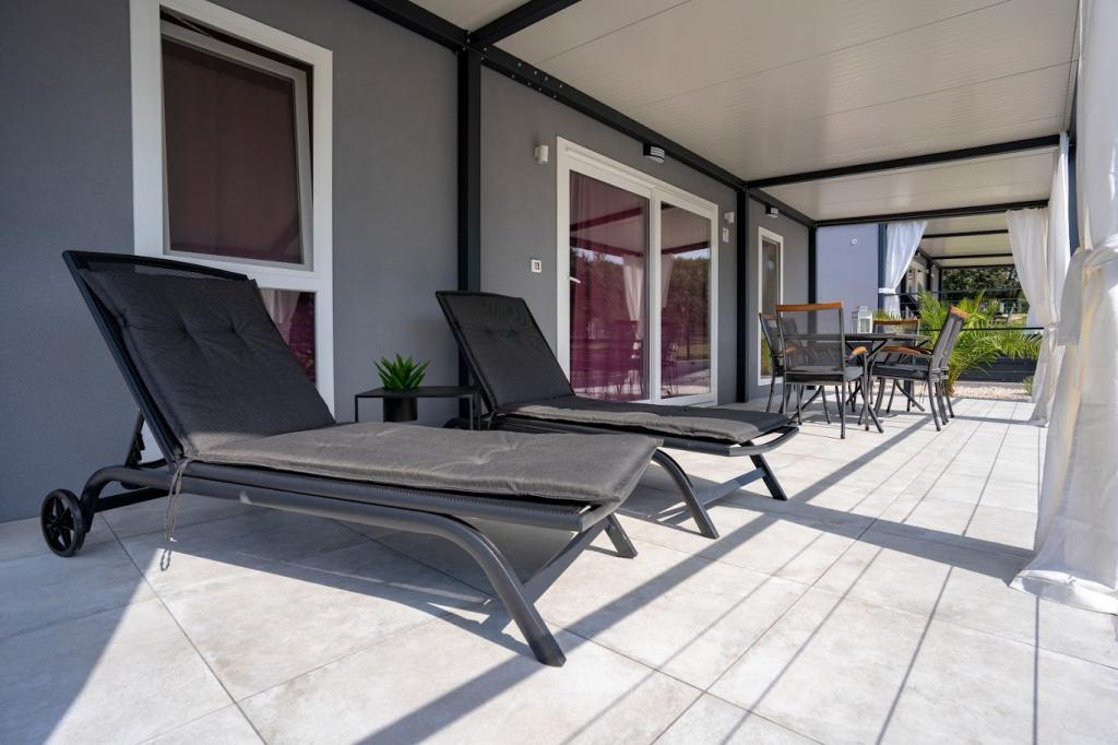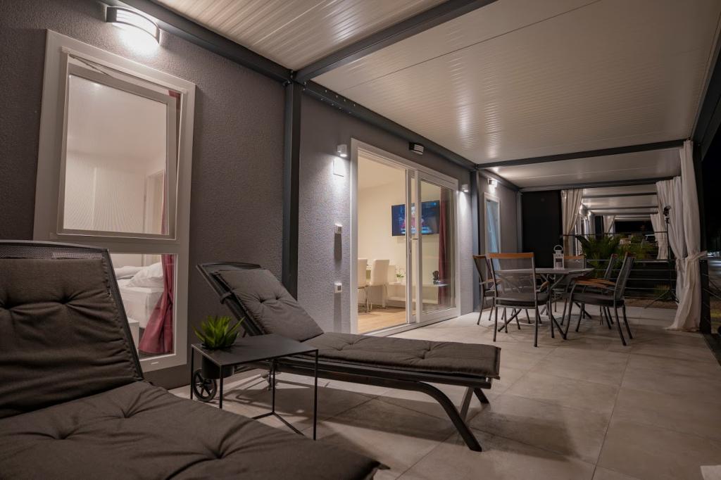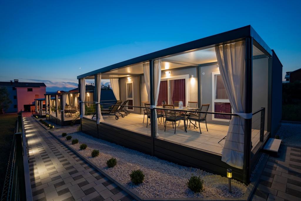 A mobilházak a homokos strand közelében, 200 m-re, a központtól 400 m-re, csendes környezetben találhatók. Fényűzően berendezett TV, Wi-Fi, két hálószoba, két fürdőszoba. Teljesen felszerelt konyha mosogatógéppel és nappali. 40 m2 teljes terület. Légkondicionált .. 27 m2-es szabadtéri fedett terasz nyári bútorokkal. Parkolás.