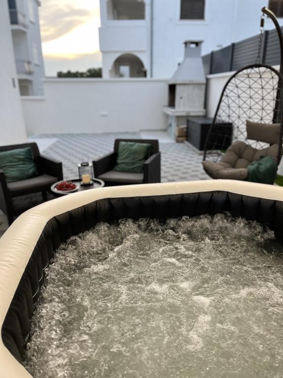Az új luxus Four Stars apartmanok Sveti Petar na moruban találhatók, Biograd na moru és Zadar között. Az apartmanok az első sorban találhatók a tenger mellett, 40 méterre a kavicsos strandtól. Minden apartman légkondicionált és hangszigetelt. Minden ablakon és erkélyajtón van szúnyogháló. A lakás bejárati ajtaja tűz- és betörésbiztos, síkképernyős LCD TV műholdas programokkal, ingyenes WI-FI. Erkélyéről csodálatos kilátás nyílik a tengerre és a szerelem szigetére - Galešnjakra. Az ajánlat tartalmazza az ingyenes privát parkolót, a ház mögötti grillezőt, valamint a jacuzzi hidromasszázs medencét, amely teljes tartalmat biztosít létesítményünknek. Röviden: a négycsillagos apartmanok tökéletes nyaralást és menekülést kínálnak a nyüzsgő élet elől. Ha adrenalinra vágyik, akkor Biograd na moruban (11 km) áll rendelkezésére a Dalmaland Fun & Water Park vidámpark. A közelben található Zadar városa (17 km), amely tele van történelmi tartalommal. Nos, a döntés rajtad múlik, mi pedig várunk rád :)