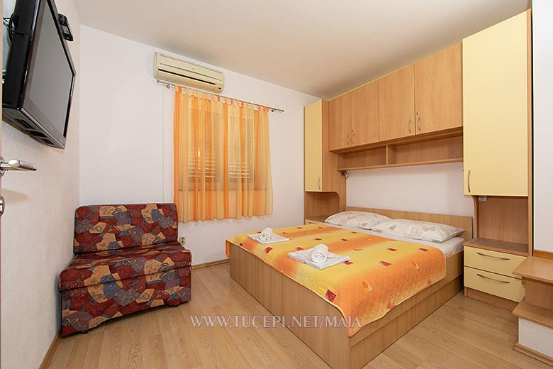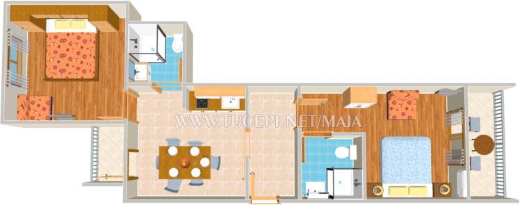 A strand 20 méterre, a központ pedig 50 méterre található a szálláshelytől. A központban üzletek, posta, gyógyszertár, valamint kávézók és éttermek találhatók. A lakás két különálló szobából áll. Minden szoba légkondicionálóval és saját fürdőszobával rendelkezik. Minden szobában műholdas TV is található. Az apartman ingyenes Wi-Fi-vel és parkolóval rendelkezik.