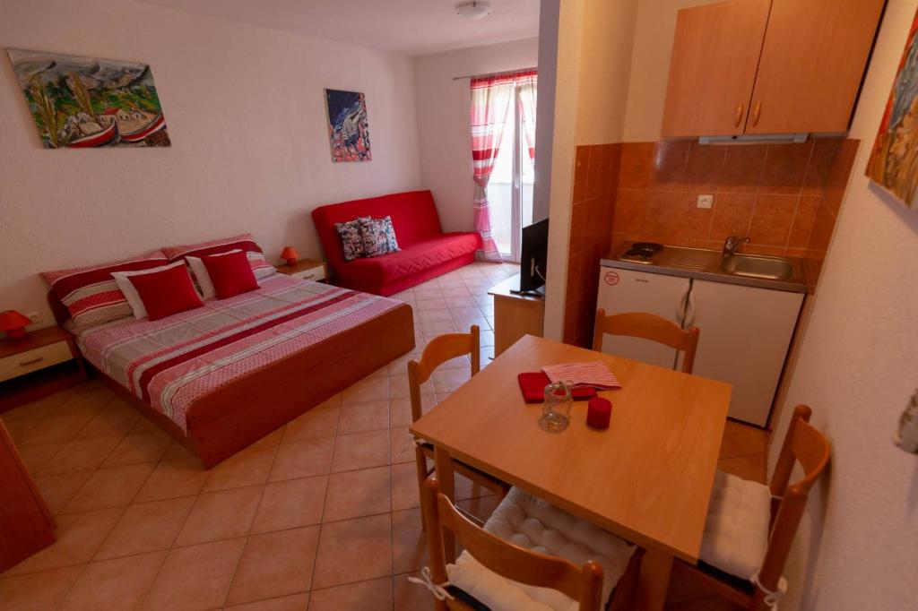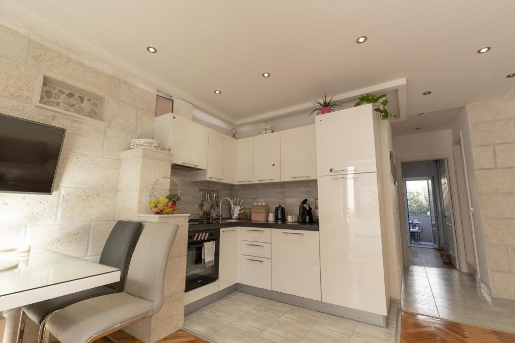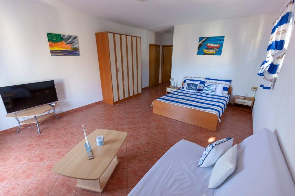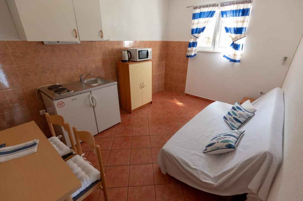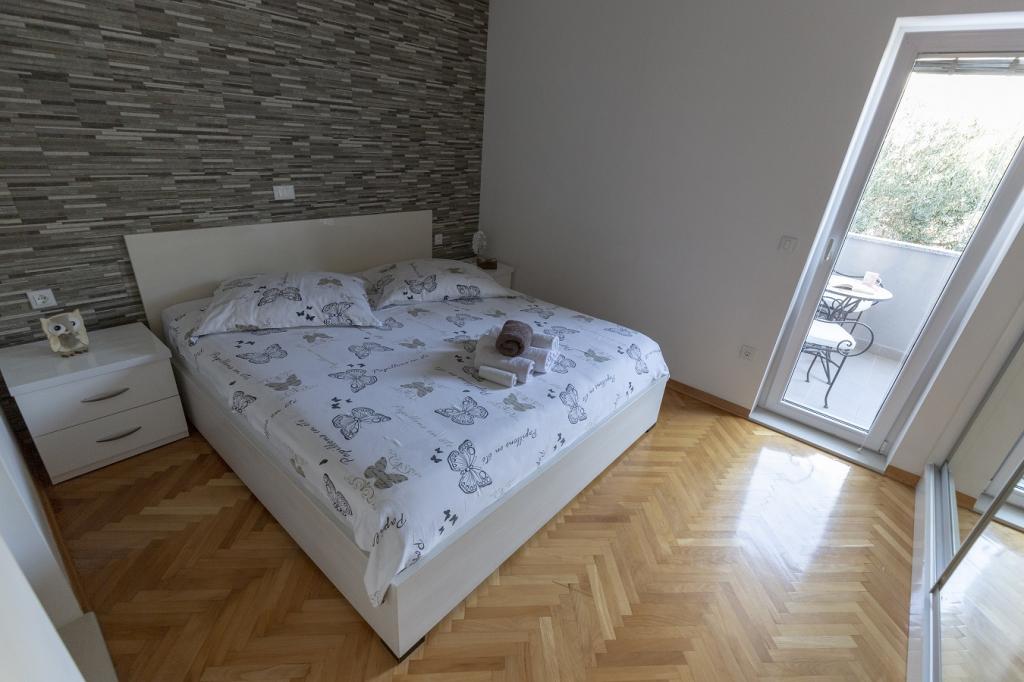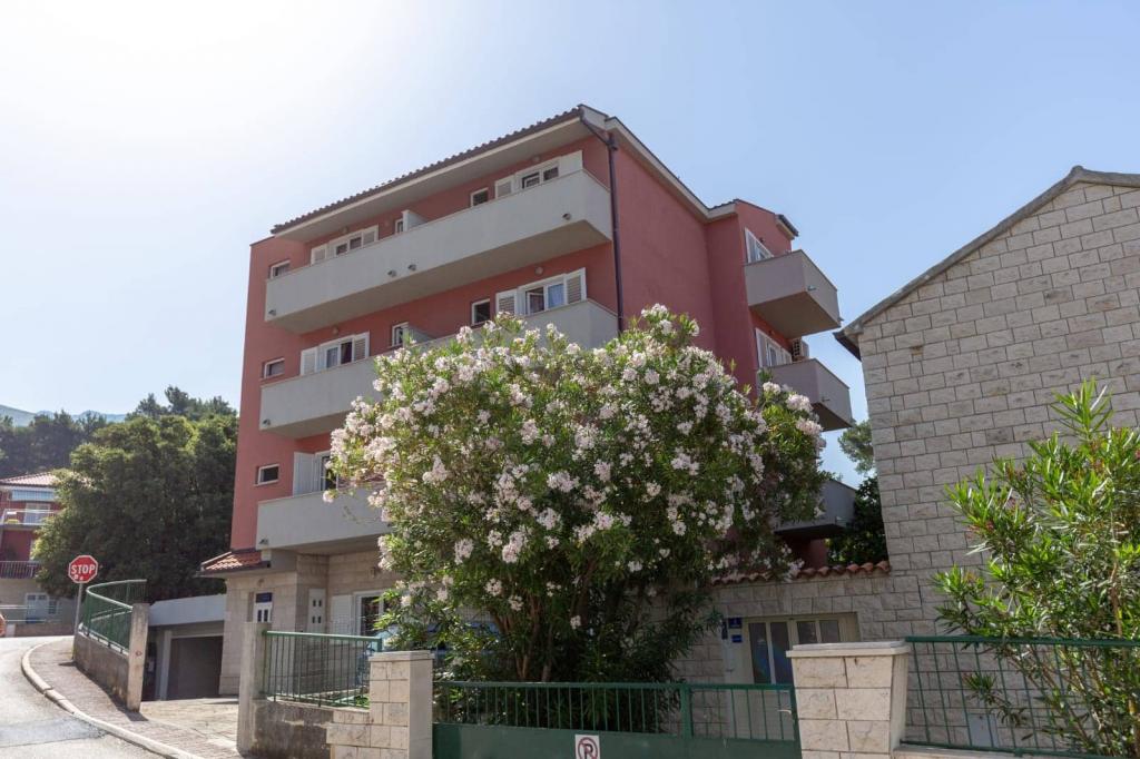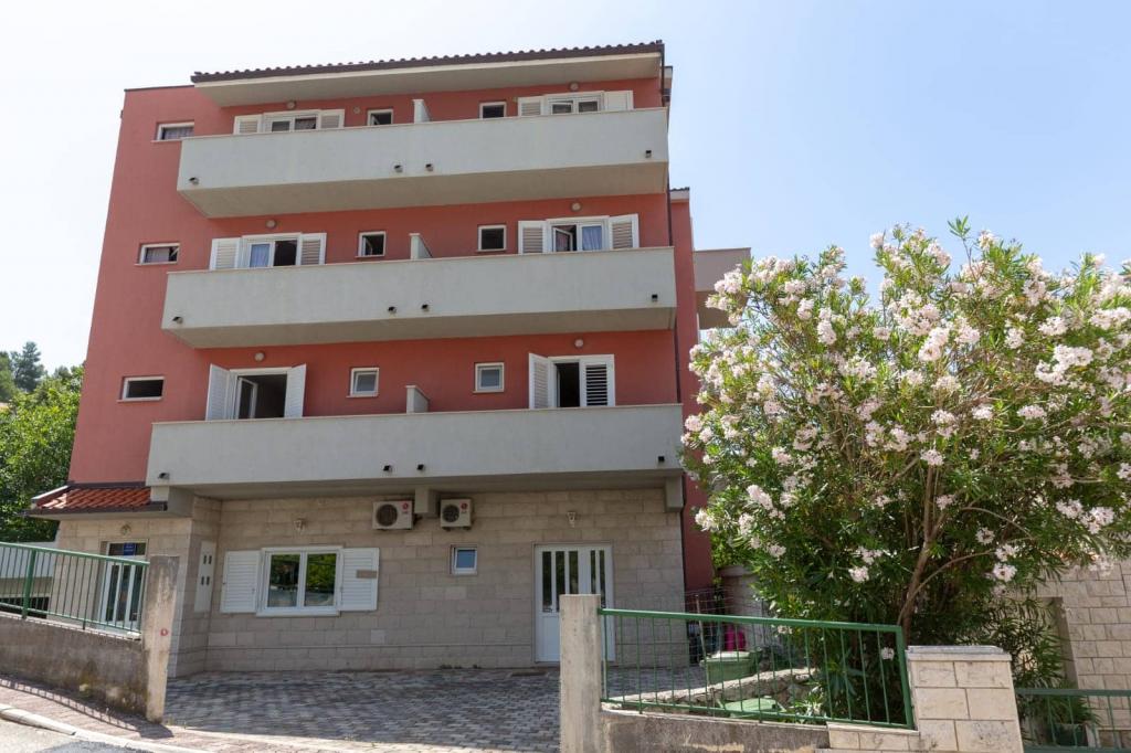 Az apartmanok 30 méterre találhatók a tengertől, az apartman közelében éttermek, bárok, szupermarket és egyéb létesítmények találhatók. Személyenként és éjszakánként 6 eurós felár ellenében reggelit biztosítunk a strand melletti épületben. Ideális autómentes nyaraláshoz. Érezze Dalmácia gyöngyszemeinek varázsát, pihenjen a 3 km-es strandokon a kristálytiszta tenger tükörképével.