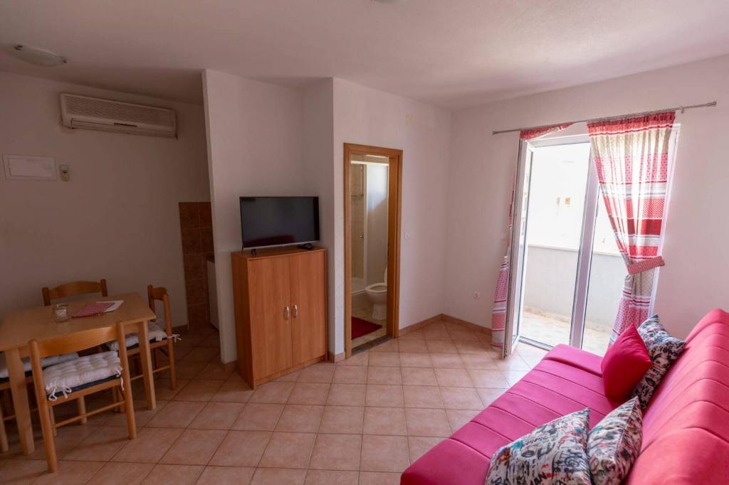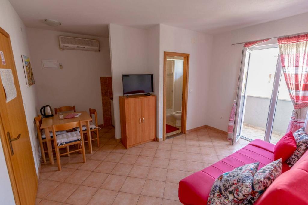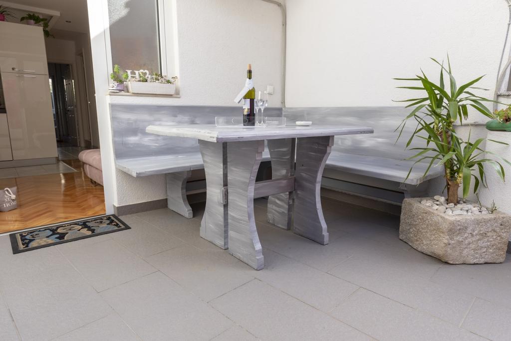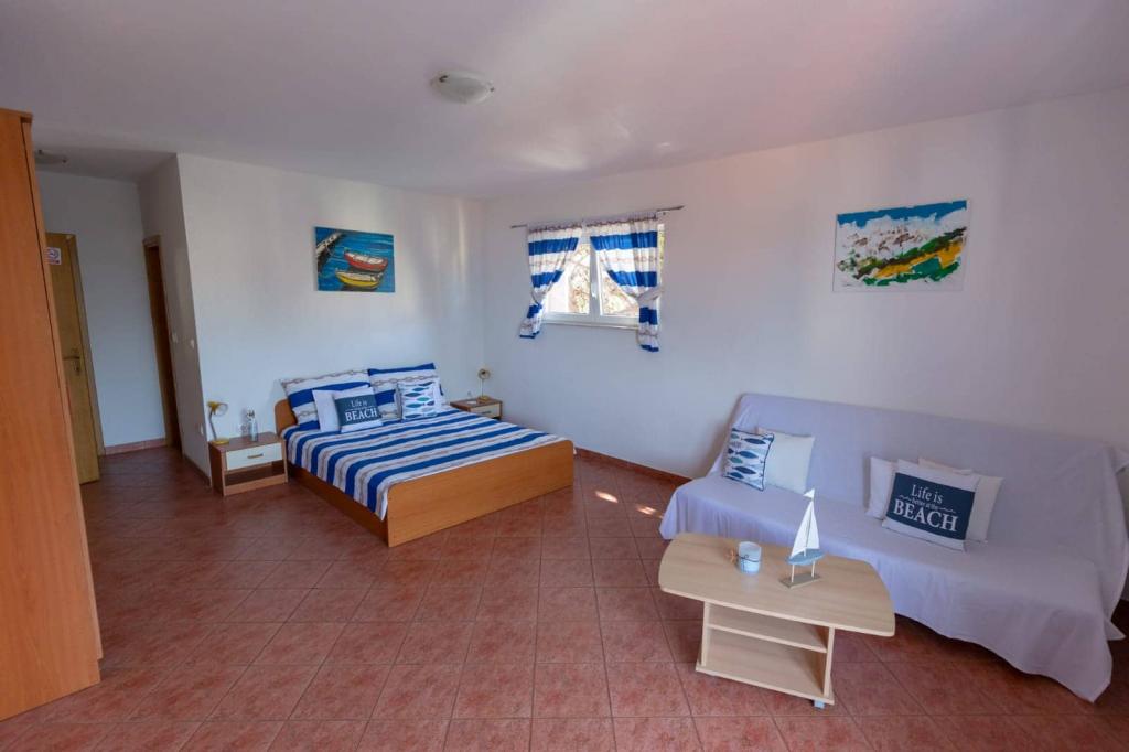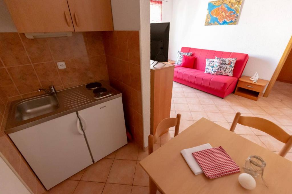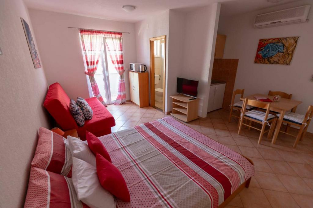 Az apartmanok 30 méterre találhatók a tengertől, az apartman közelében éttermek, bárok, szupermarket és egyéb létesítmények találhatók. Személyenként és éjszakánként 6 eurós felár ellenében reggelit biztosítunk a strand melletti épületben. Ideális autómentes nyaraláshoz. Érezze Dalmácia gyöngyszemeinek varázsát, pihenjen a 3 km-es strandokon a kristálytiszta tenger tükörképével.