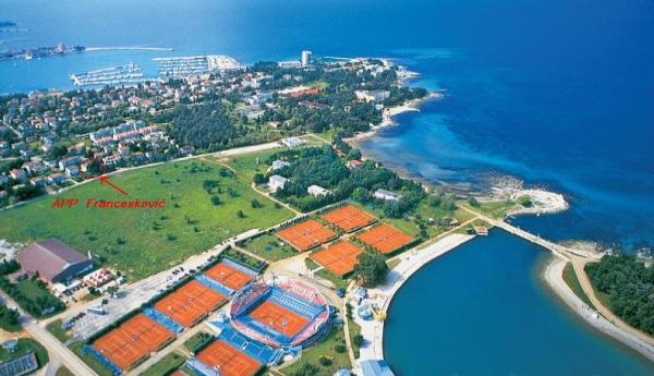 Umag, attraktív apartmanok 2-6 fő 200 m-re a strandtól Punta legjobb helyen. Mindössze 220 m teniszcentrum Stella Maris ATP Croata nyitott, ingyenes parkolást (ahogy a ház a strand közelében, ez egy parkolási zóna). Két privát park fenyőfák és zöld mintegy 1000 m2 használata a grill. A közelben kitűnő éttermek, wellness centrum, kaszinó, valamint számos egyéb idegenforgalmi szolgáltatások.