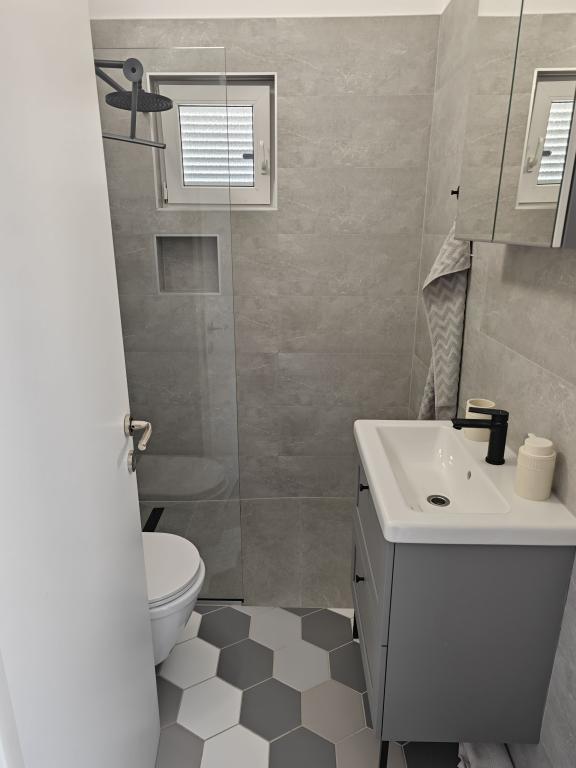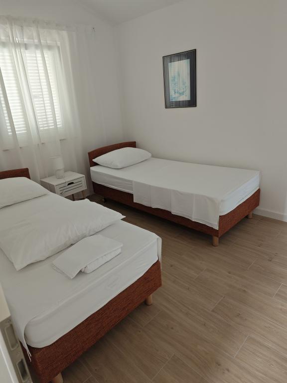 Mi kiadó lakást a házban, első emeleti, külön bejárattal, parkolási lehetőség az udvarban. A lakás két szoba, - Egy dupla ággyal és - A másik két egyszemélyes ággyal, - Nappali kanapéval, TV, légkondicionáló - Teljesen felszerelt konyha, - Fürdőszoba zuhanyzóval, - Nagy terasz, parkoló és barbecue Felújított, légkondicionált, 100 méterre a tengertől, 5 fő részére.