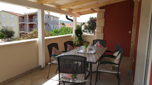 Az apartmanok Vodice csendes részén található, különféle növényekkel körülvéve, bekerített udvarral és parkolóval. Az első emeleti teraszok részben fedett, részben napozásra nyitottak, a földszinten teljesen fedett. Az első emeleti apartmanok saját grillgel rendelkeznek, a földszinti apartmanok pedig az udvaron grillezési lehetőséggel rendelkeznek. A strandig 10 perc séta, 15 percre a központtól. Minden apartman modern berendezésű, tágas nappali, étkező és konyha, két hálószoba, fürdőszoba és folyosó, valamint egy nagy terasz tartozik. Minden apartmanban van mosógép, vasaló, vasalódeszka és hajszárító, valamint ingyenes Wi-Fi. A konyha teljesen felszerelt mindent.