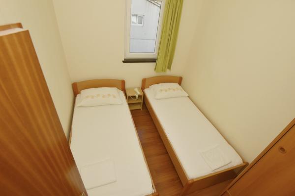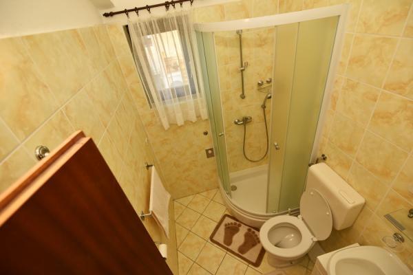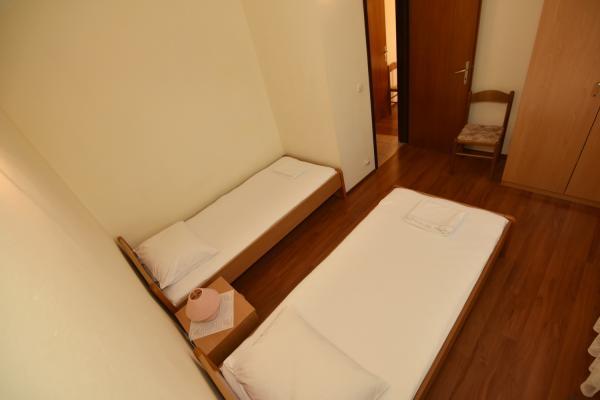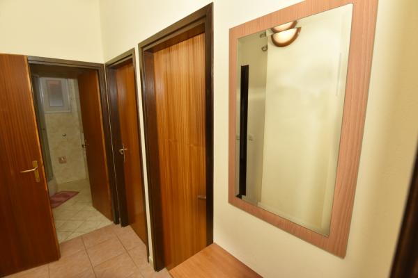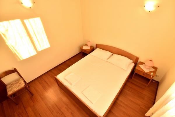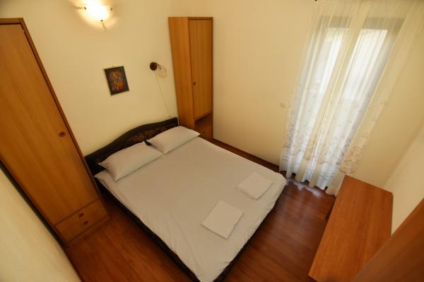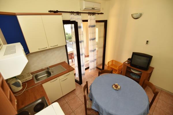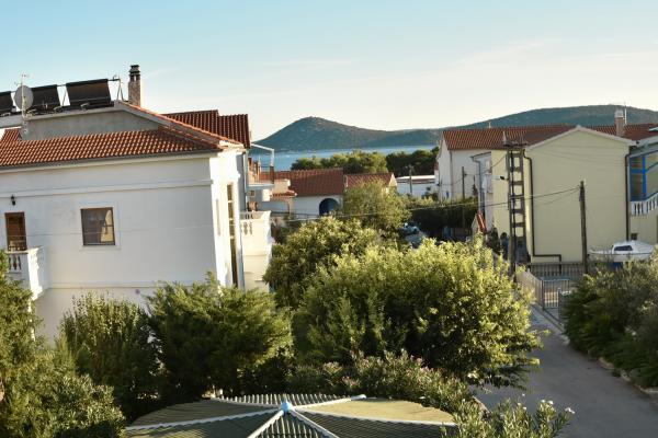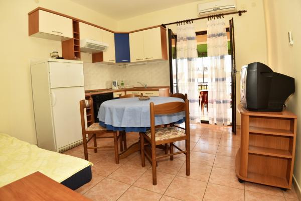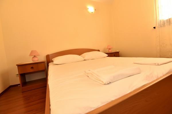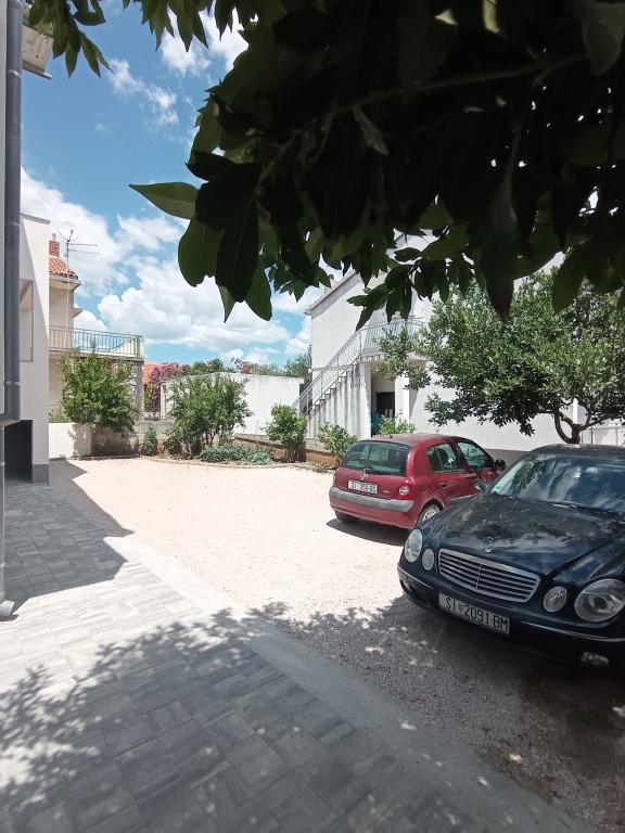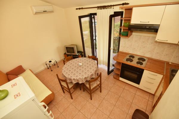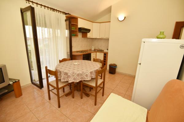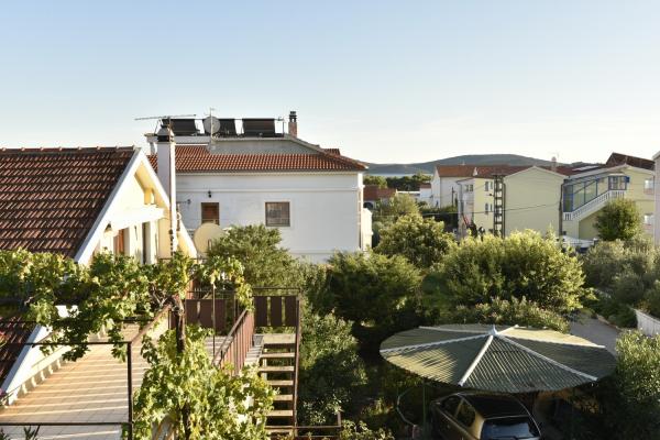 Vodice egy szép apartman, nagy terasszal, 2 szobával és egy pótággyal a konyhában;