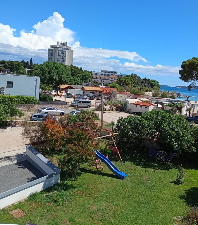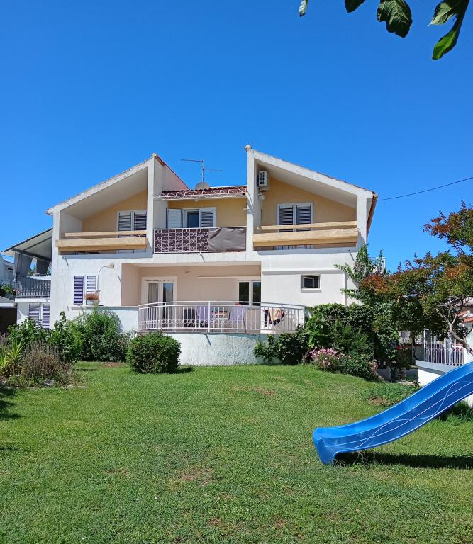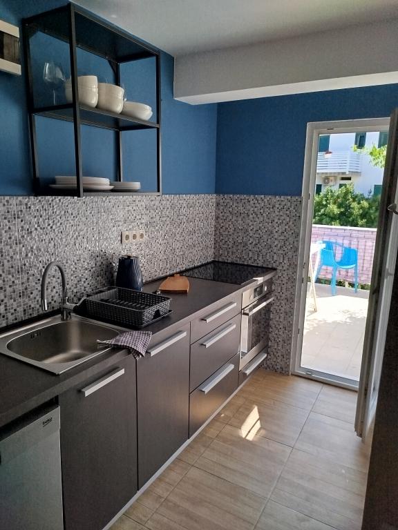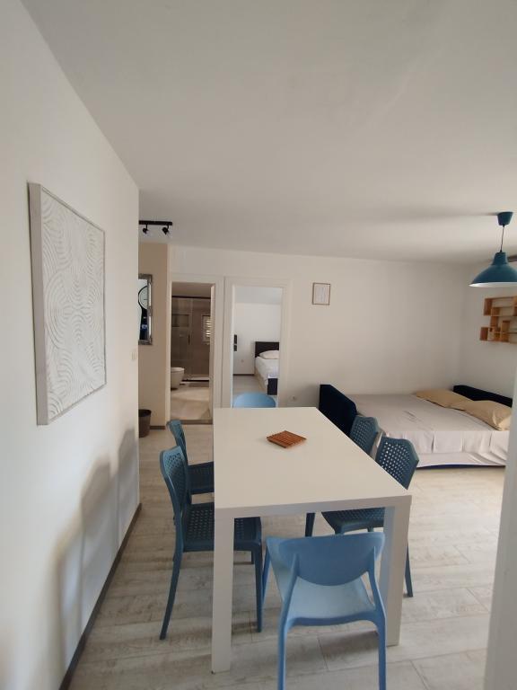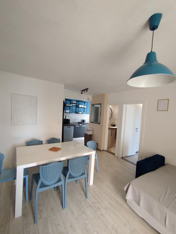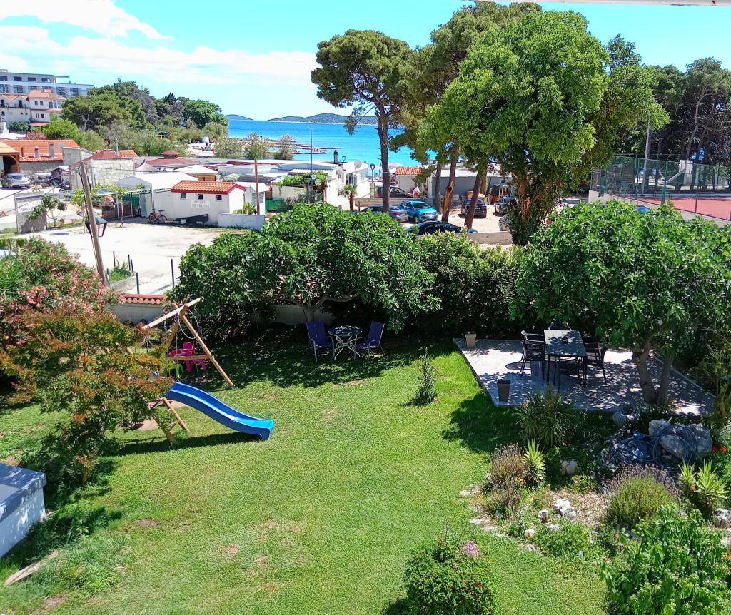 Apartments Blue Beach, egy csendes részén, a város, a parton, tengerparti. A központ és egyéb létesítmények csak 5 perc gyalog. Az apartmanok mindegyike tengerre néző, fenyőerdő és gyönyörű kertben. Az apartmanok igényesen berendezett minden szükséges felszerelést. Az a lehetőség, kert, grill és játszótér. parkolás az udvarban.