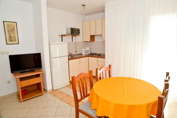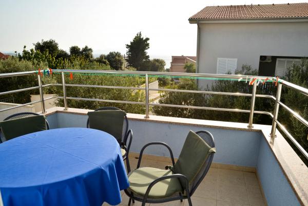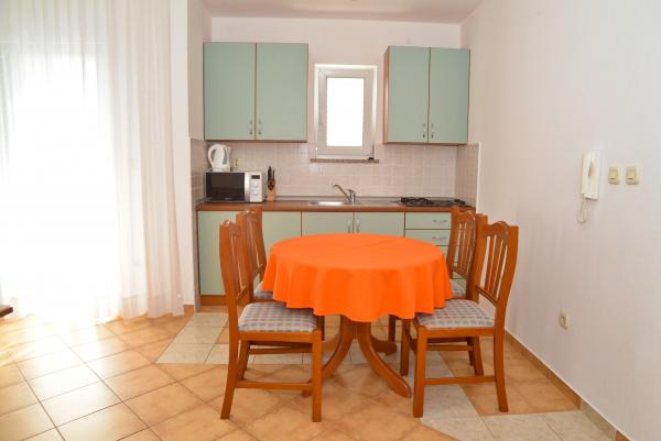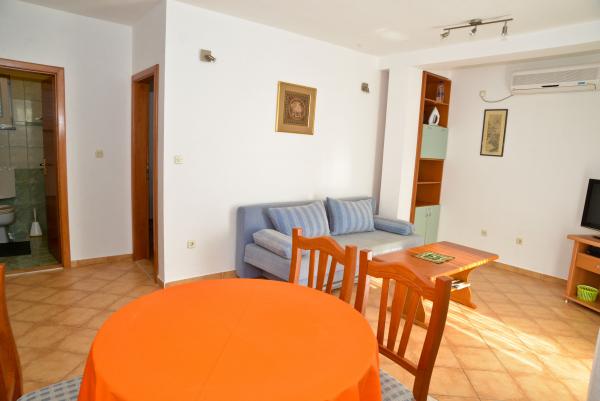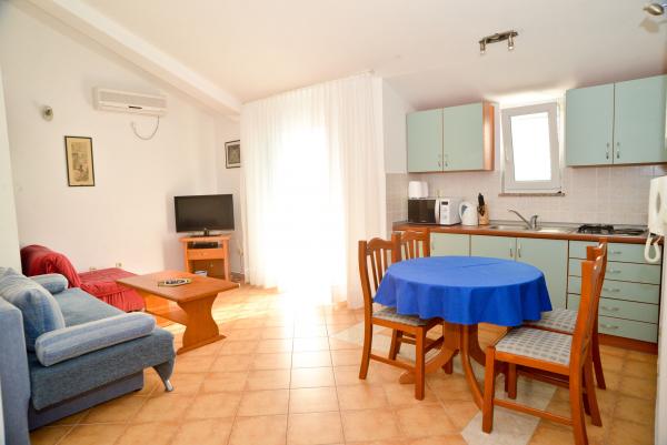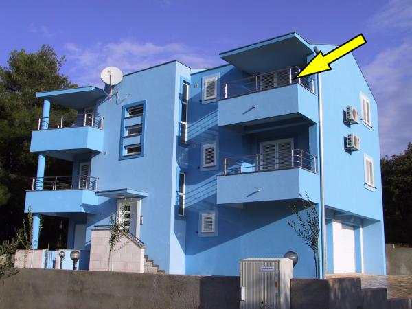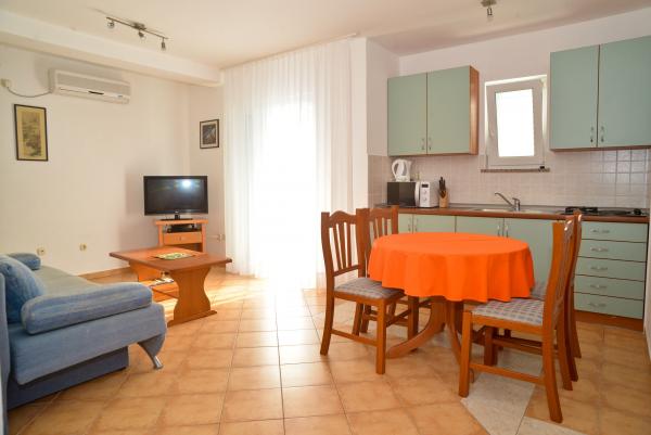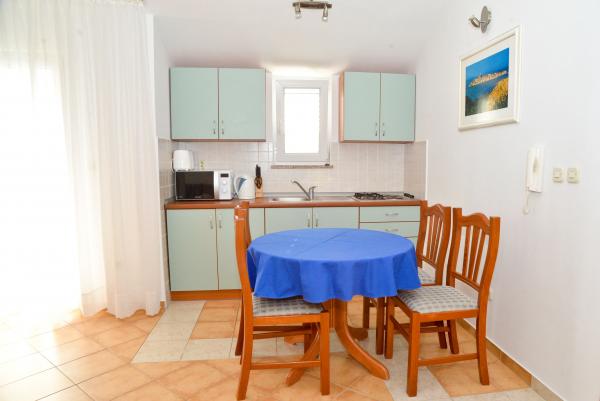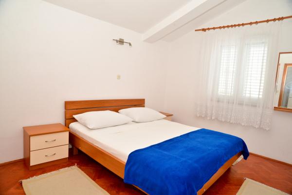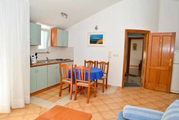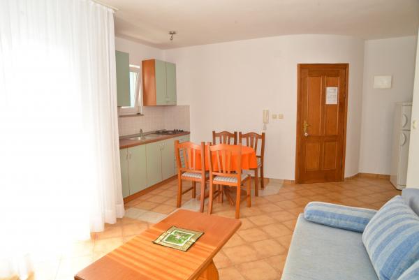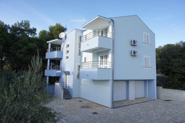 Blue Apartments, teljesen felszerelt, csendes környezetben, csak 70m-re a strandtól, kínál kellemes környezetet kikapcsolódásra és szórakozásra. Kilátással a tengerre és a szigetre az erkélyen van valami, hogy emlékezni fog egy életen át. Blue apartmanok találhatók a házban, és a következő öt apartmanok közül az egyik akadálymentesített. Az udvaron egy barbecue, amely rendelkezésre áll minden alkalommal. Ingyenes parkolási lehetőség. A strand előtt a kavicsos és alkalmas a gyermekek számára minden korosztály, míg a felnőttek élvezhetik a szabad napágyakkal és napernyőkkel. Internet kapcsolat áll rendelkezésre, és ingyenes a lakások és a strandon.