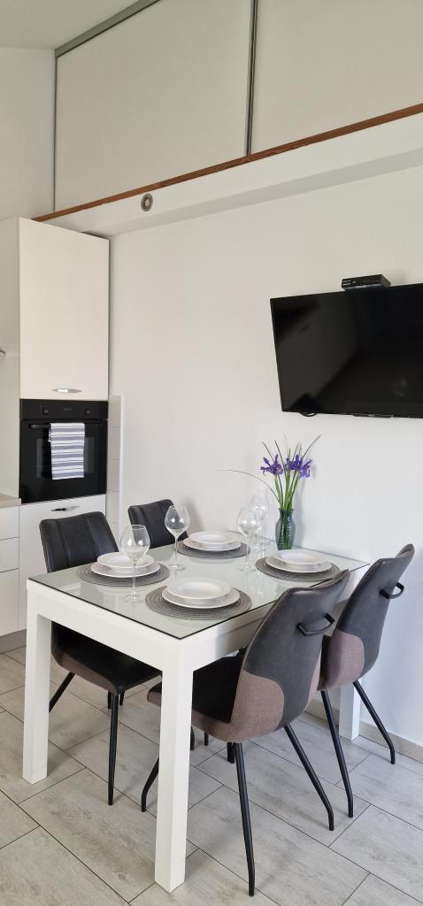 Apartments Iva található enyhén megemelt helyen, egy modern villa második 5 km-re az óvárostól. Az ajánlat, ráadásul ingyenes Wi-Fi és a parkolás, a további 2 lakások talál elegáns szobák, légkondicionált mindegyikben (3 Klíma per fő), nappali / konyha stílusosan berendezett és LCD TV-vel, tágas terasz, ahol pihenhet és élvezheti a kilátást, modern fürdőszoba zuhanyzóval, stb Nagyobb lakások két hálószoba, egy dupla ágy, egy ágy és 1 fő, ami belenyúlik egy ágy 2 fő részére a második hálószobában. Kanapé a nappaliban, ha szükséges, lehet alakítani egy ágy 2 fő részére. A konyha fel van szerelve minden szükséges kényelmes pihenésre: hűtőszekrény, sütő, mosogatógép (1 suite) ... Studio egy kisebb tér 25m2, amely áthidalja 2 szintes, és úgy van kialakítva, 2 fő elhelyezésére alkalmas. Ez 1 hálószoba franciaággyal a felső emeleten, és a konyha és a fürdőszoba az alján. Minden apartman felújított.