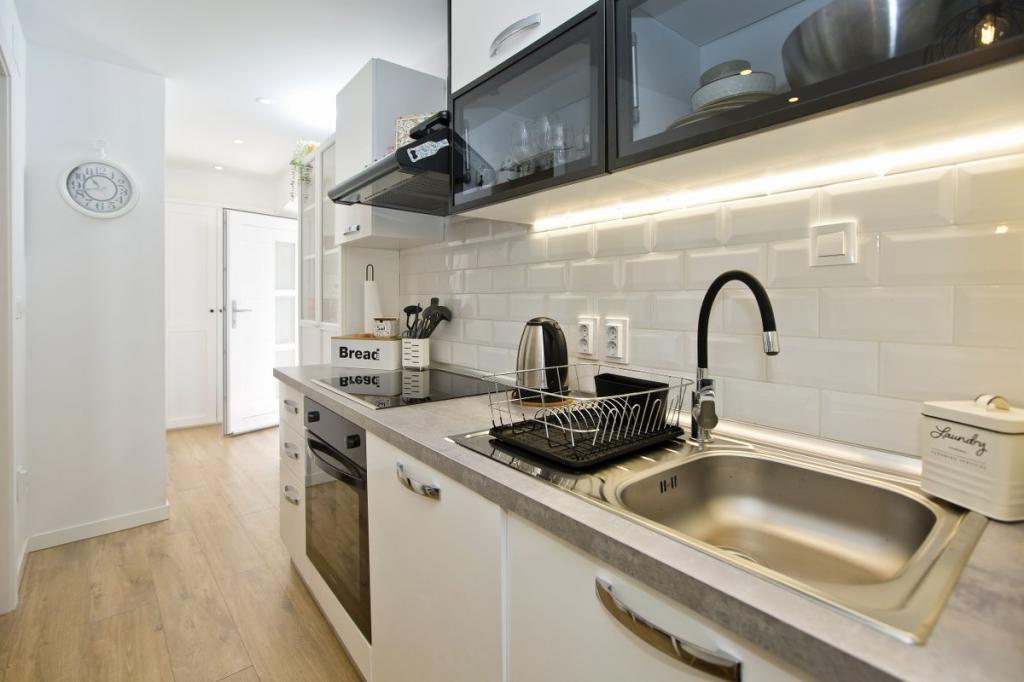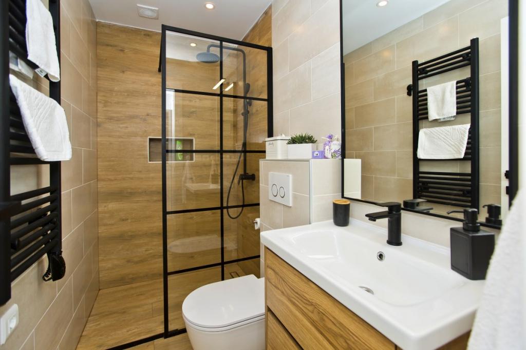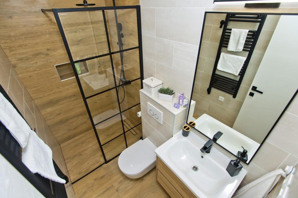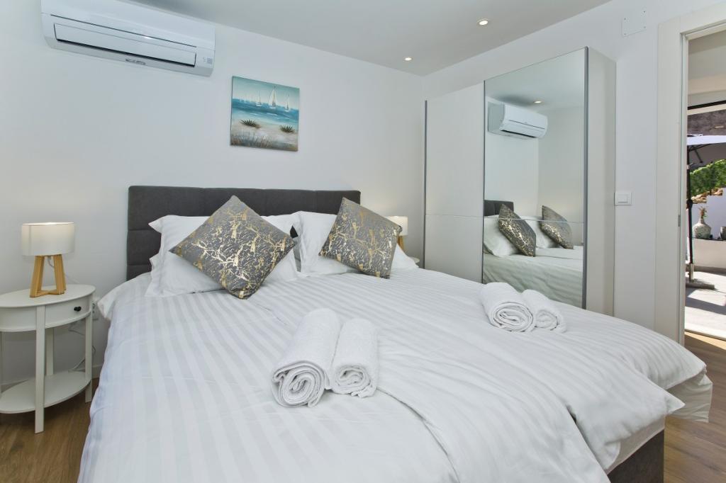 A ház egy 30 m2-es lakásból és egy 20 m2-es udvarból áll. A lakás egy hálószobából, fürdőszobából, konyhás nappaliból és egy kis tárolóhelyiségből áll. A szobából gyönyörű kilátás nyílik, és egy franciaágy található benne, amely alatt egy 160x200 cm-es csomagtároló található. Van egy nagyméretű, tolóajtós gardróbszekrény, két éjjeliszekrény lámpákkal és légkondicionáló. A fürdőszobában zuhanyzó, radiátor, ventilátor, mosdó és WC található. Az ablakos nappali és a konyha egybenyitott. A nappaliban légkondicionáló, kanapé, TV, konyhaasztal székekkel található. A konyhában sütő, főzőlap, mosogatógép, hűtőszekrény, mikrohullámú sütő, vízmelegítő és kenyérpirító található. A kis tárolóhelyiségben mosógép, bojler és cipőtartó található. Az udvar társasági és pihenési célokra szolgál, és nyugágy, napernyő, székek és kerti garnitúra található. Ez egy apartman a családi ház első emeletén, előtte egy nagy udvar található.