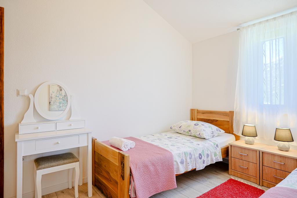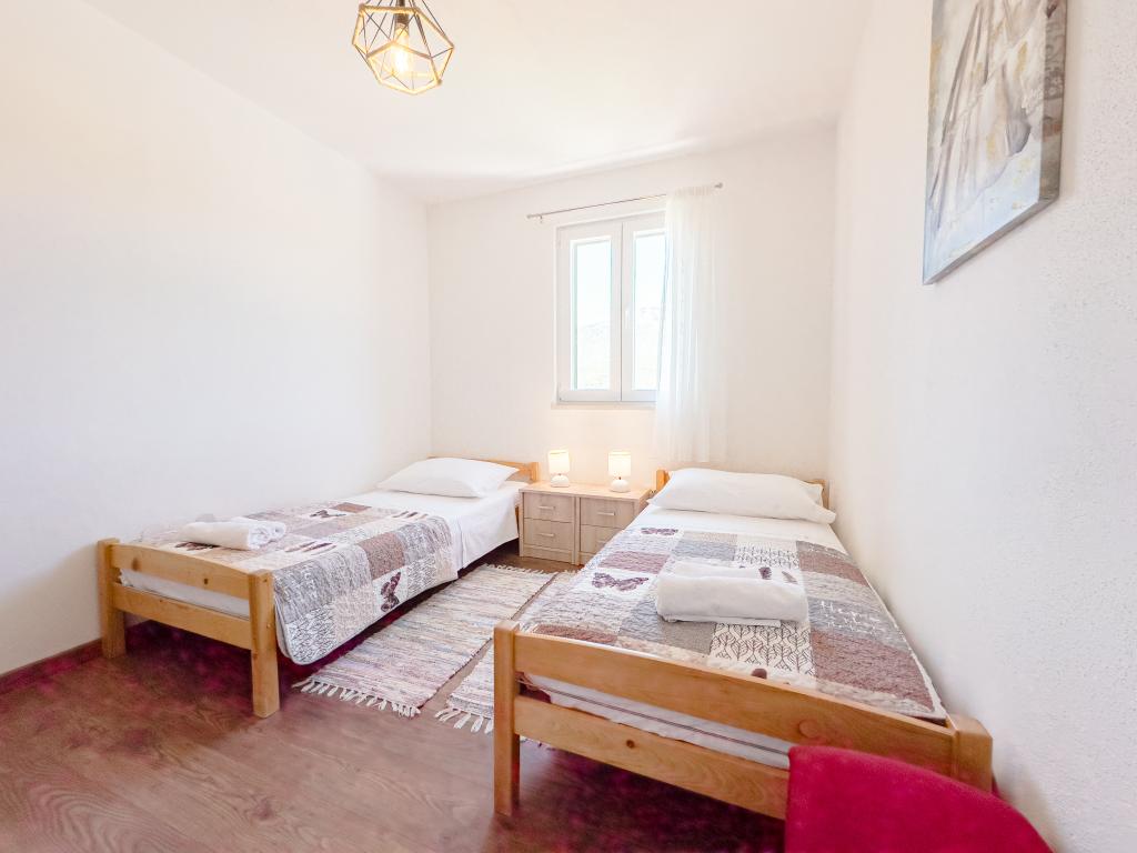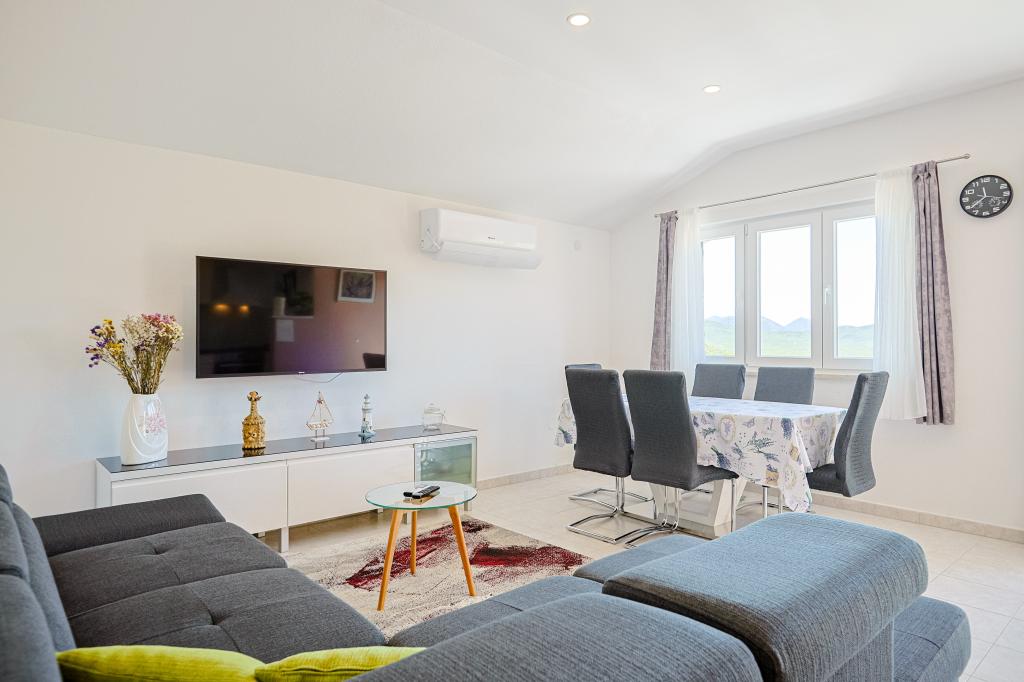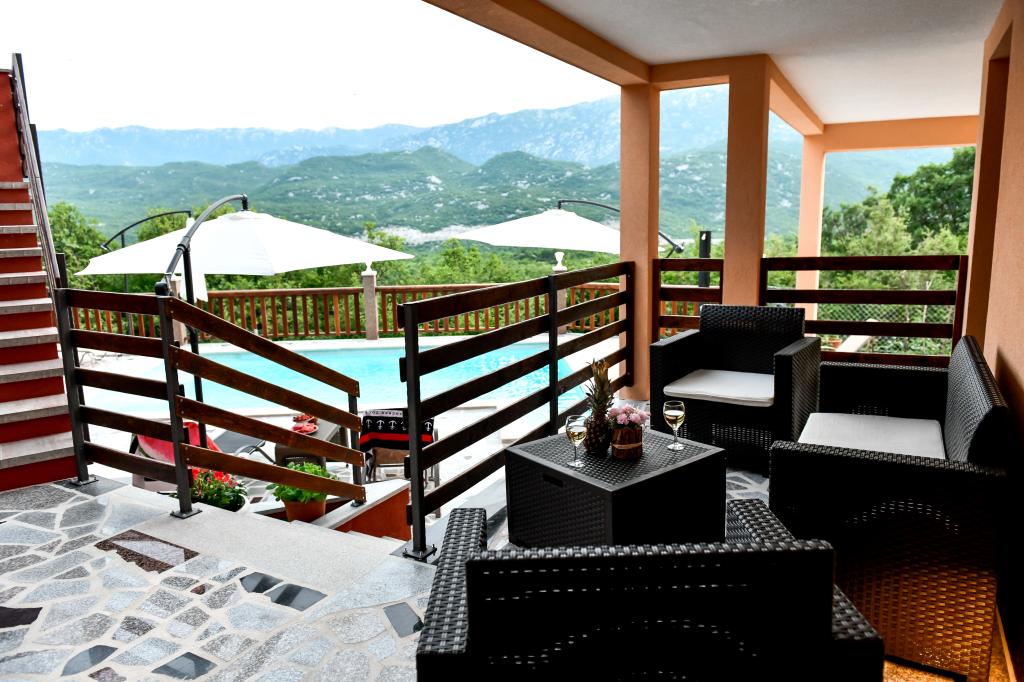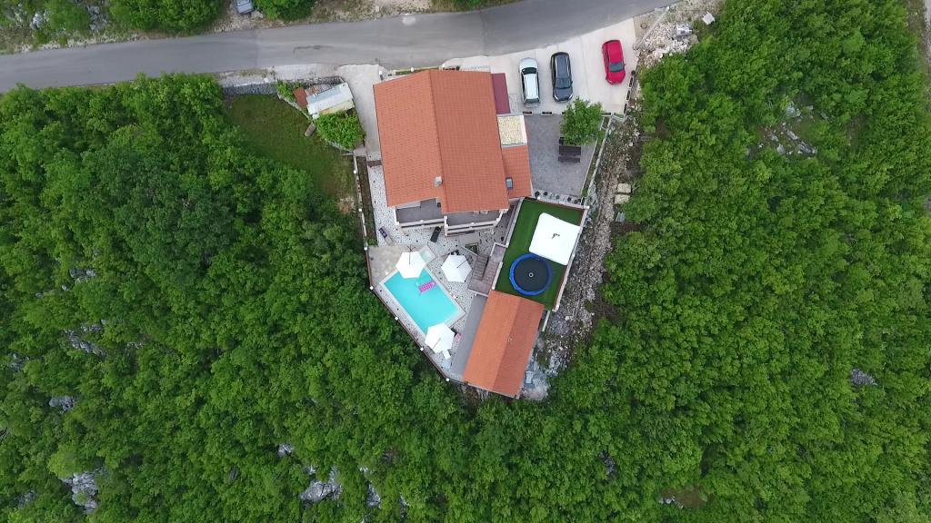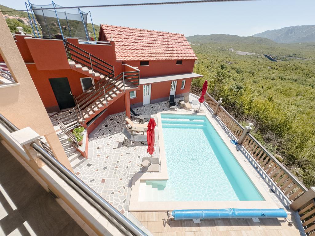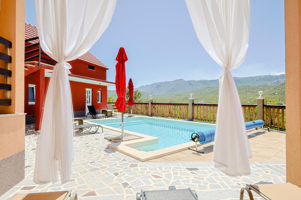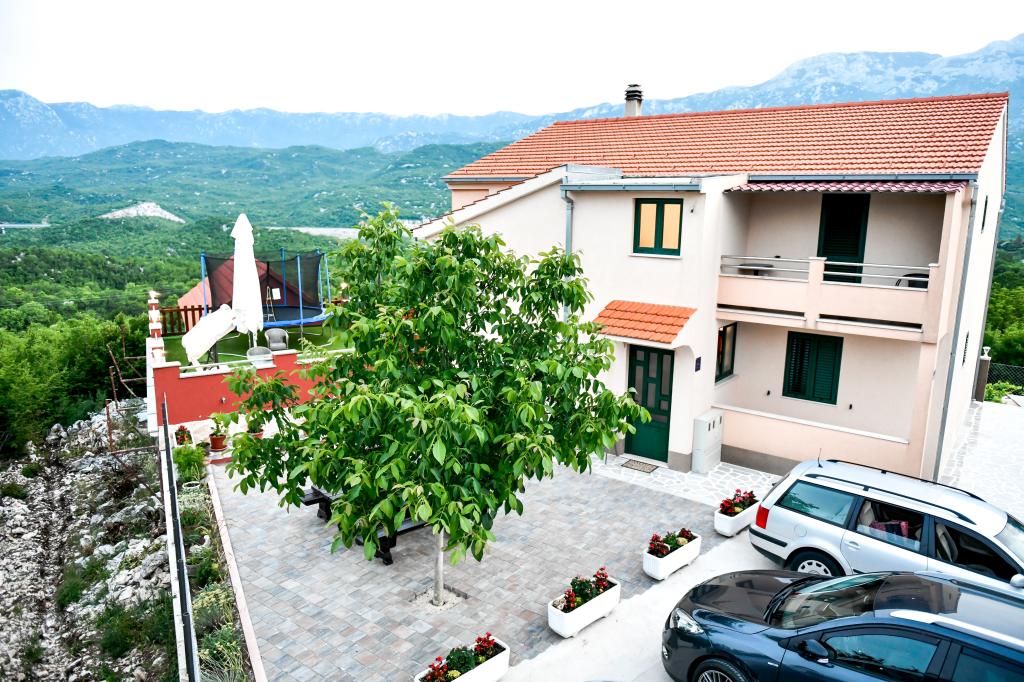 A tágas nyaraló 12 fő részére nyújt teljes élményt és kikapcsolódást. Tágas kert fűtött 7x4 méteres úszómedencével, víz- és légmasszázzsal a szórakozás és a kikapcsolódás érdekében. A medence mellett található a nyári konyha étkezővel és fürdőszobával, melyhez szabadtéri grillező is tartozik. Minden apartmanban 3 hálószoba, 2 fürdőszoba, teljesen felszerelt konyha, tágas nappali okostévével, valamint a medencére és a Biokovo-hegyre néző erkély található. Az ajánlat tartalmaz egy trambulint a legkisebbeknek, egy fedett grillezőt, 5 parkolóhelyet és egy nagy teraszt. Ennek az ingatlannak az egyedisége abban rejlik, hogy a ház egy félreeső helyen található, így biztos lehet benne, hogy teljes magánéletben lesz része. A ház elhelyezkedése kiváló, mert 25 perc autóútra van az Adriai-tengertől, 10 percnyire üzletek, kávézók, éttermek. Makarska, Imotski, Split, Omiš, Međugorje, Makarska és más vonzó helyek kevesebb, mint 20 perc-1 óra autóútra találhatók tőlünk. Az autópálya bejárata 9 km-re található.
