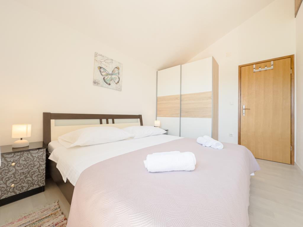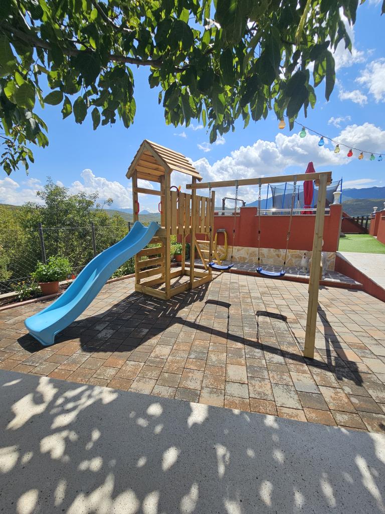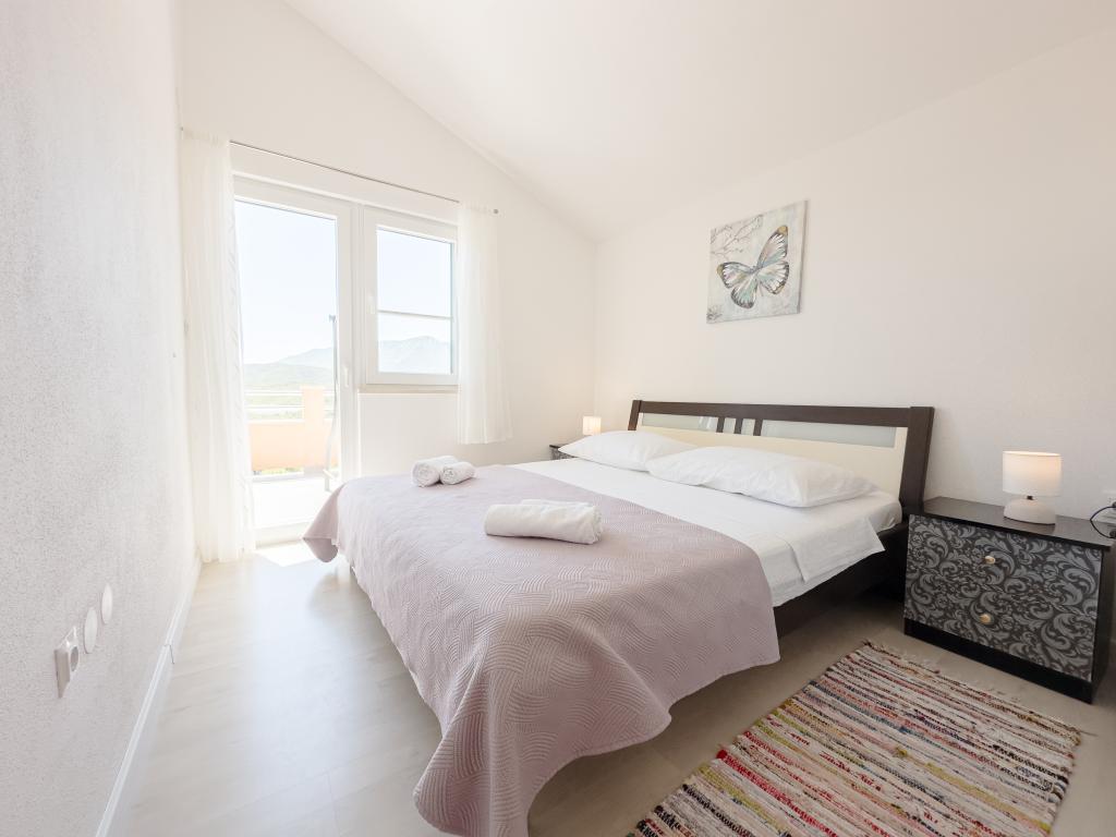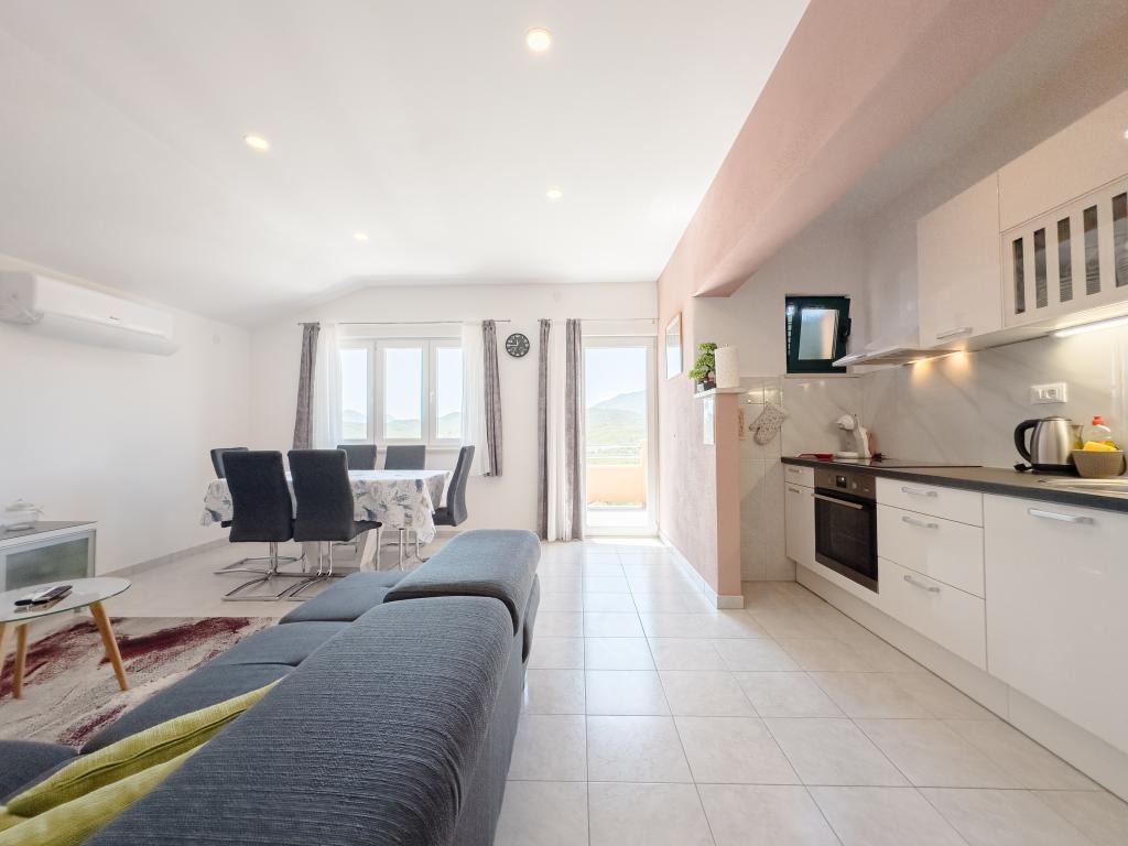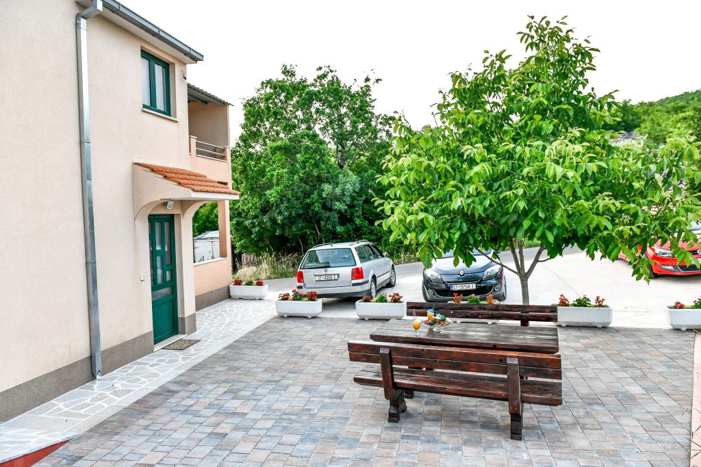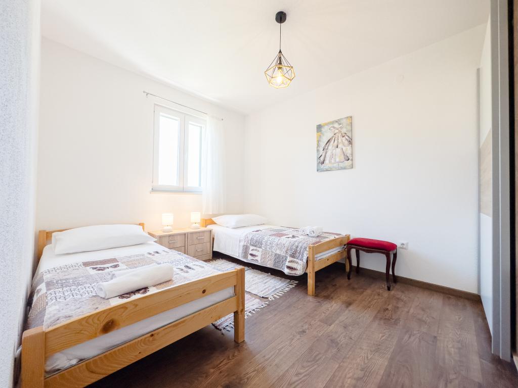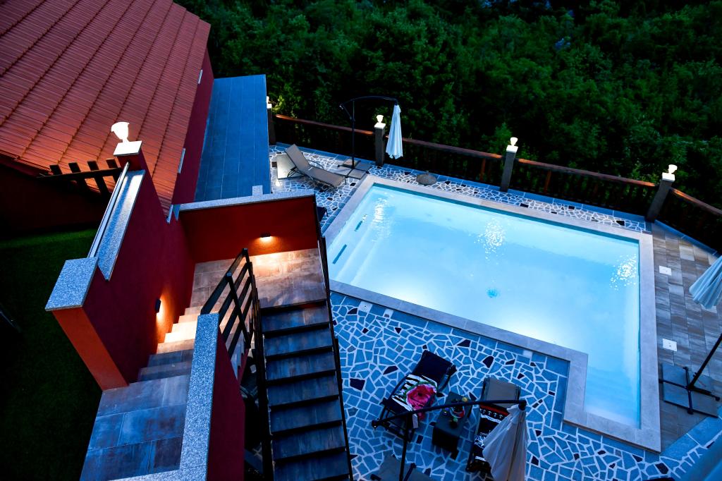 A tágas nyaraló 12 fő részére nyújt teljes élményt és kikapcsolódást. Tágas kert fűtött 7x4 méteres úszómedencével, víz- és légmasszázzsal a szórakozás és a kikapcsolódás érdekében. A medence mellett található a nyári konyha étkezővel és fürdőszobával, melyhez szabadtéri grillező is tartozik. Minden apartmanban 3 hálószoba, 2 fürdőszoba, teljesen felszerelt konyha, tágas nappali okostévével, valamint a medencére és a Biokovo-hegyre néző erkély található. Az ajánlat tartalmaz egy trambulint a legkisebbeknek, egy fedett grillezőt, 5 parkolóhelyet és egy nagy teraszt. Ennek az ingatlannak az egyedisége abban rejlik, hogy a ház egy félreeső helyen található, így biztos lehet benne, hogy teljes magánéletben lesz része. A ház elhelyezkedése kiváló, mert 25 perc autóútra van az Adriai-tengertől, 10 percnyire üzletek, kávézók, éttermek. Makarska, Imotski, Split, Omiš, Međugorje, Makarska és más vonzó helyek kevesebb, mint 20 perc-1 óra autóútra találhatók tőlünk. Az autópálya bejárata 9 km-re található.