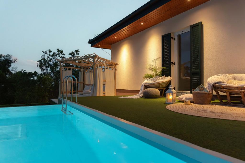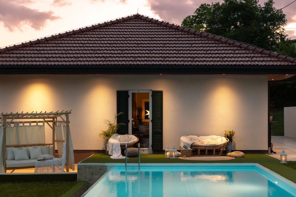 A Villa Plešivica kilátás a hagyományos, a helyi és a modern, ipari stílus ötvözete, melyet érintetlen természet vesz körül. Különös figyelmet fordítanak azokra a részletekre, amelyek eleganciát, légiességet és melegséget adnak a villának. Bár új épületről van szó, 2022-ben teljesen felújították. Található benne egy egyedi előszoba, egy tágas nappali, két hálószoba, egy külön konyha, két pompás fürdőszoba és egy késői terasz. A villa különlegessége az üvegtáblák, amelyekből nyílt kilátás nyílik az égre és a szőlő- és gyümölcsöskertek mesebeli lankáira. Maga a villa területe egy túlcsorduló medencéből, négy különböző teraszból és egy hangulatos pavilonból áll. Mindezt őshonos gyümölcsfákkal és gazdag növényzettel határolt több mint 3000 m2 füves terület keretezi. A villa gyógy- és wellness-oázist is kínál. Maga a villa dekorációja eklektikus, és a kortárs dizájnerbútorok kombinációját képviseli, valamint a restaurált art deco és szecessziós darabokat, amelyek a családi örökség részét képezik.
