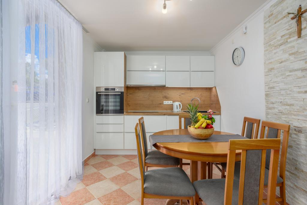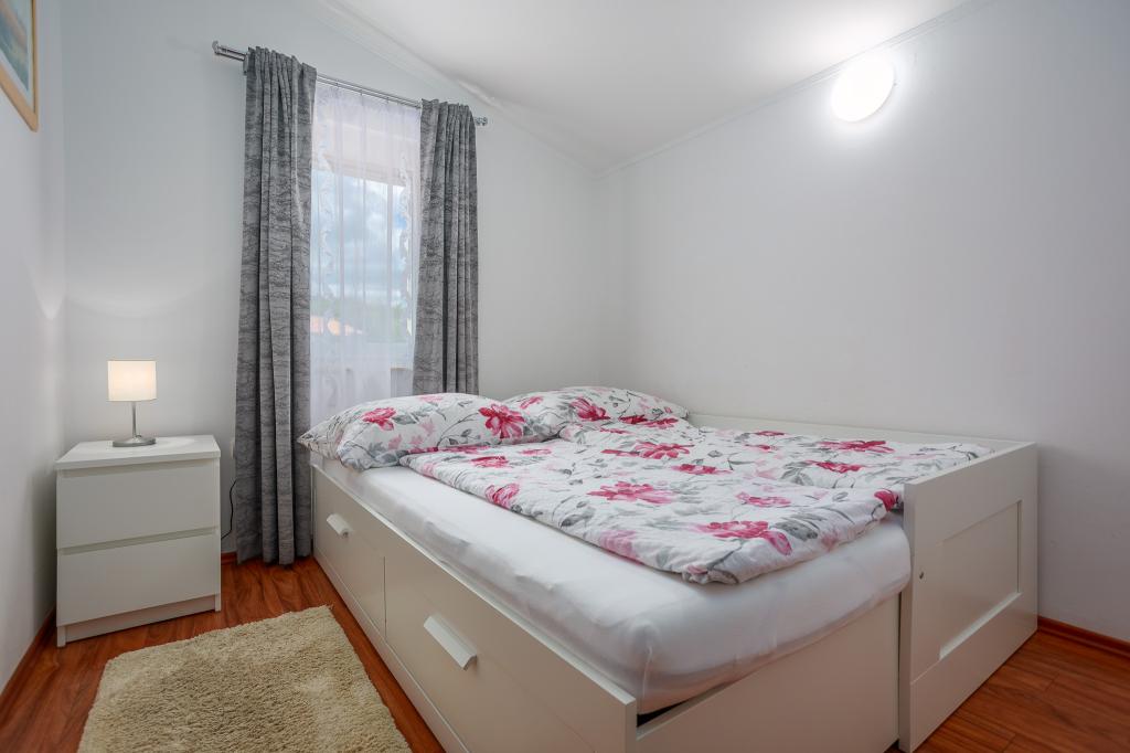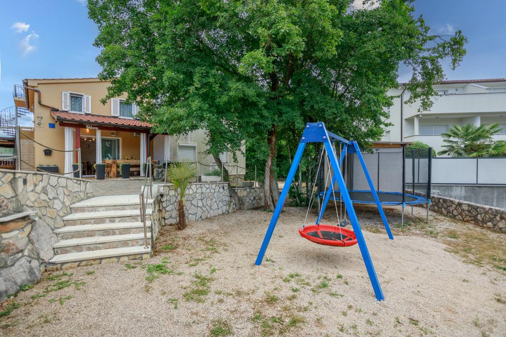 Szeretettel meghívjuk Önt, hogy töltse családi nyaralását Krk szigetén, a Margareta családi házban. Két család számára kínálunk teljesen és modernül felszerelt házat két különálló apartmanban, 8-10 fő részére, 900 m²-es telken. Négycsillagos Margareta családi házunk 200 méterrel a tengerszint felett található, mindössze két percre a Soline-öböltől, és Krk szigetének számos más látnivalója is néhány perc autóútra található. A házban 4 hálószoba található franciaággyal, két fürdőszoba/WC és egy további WC a földszinten, két konyha és két nappali található, ahol egy 1-2 fő részére alkalmas kanapéágy található. Ezen kívül a házban 4 terasz, grillező és egy játszótér található trambulinnal és hintával. A ház a Vila za odmor településen található Gornja Hlapában, Soline közelében, Dobrinj községben, Krk szigetén. Az udvarban 5 férőhelyes parkolóhely áll rendelkezésre. Van egy gyönyörű tetőterasz is, ahonnan romantikus naplementéket és napozást lehet megcsodálni, kilátással a Kvarner-tengerre. Élvezze Krk szigetét.