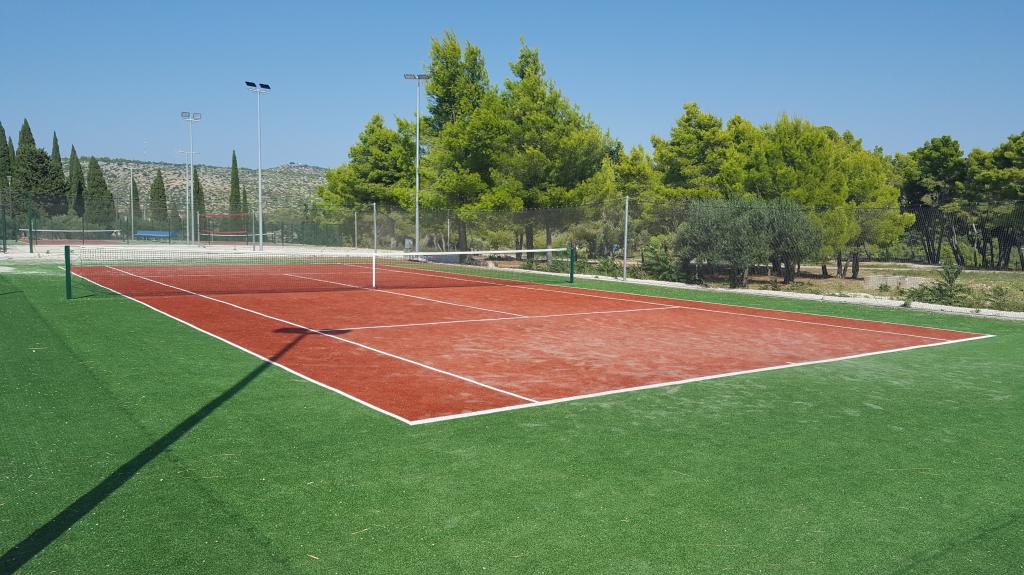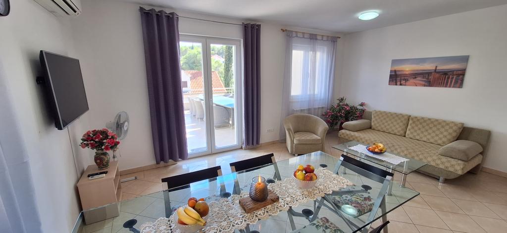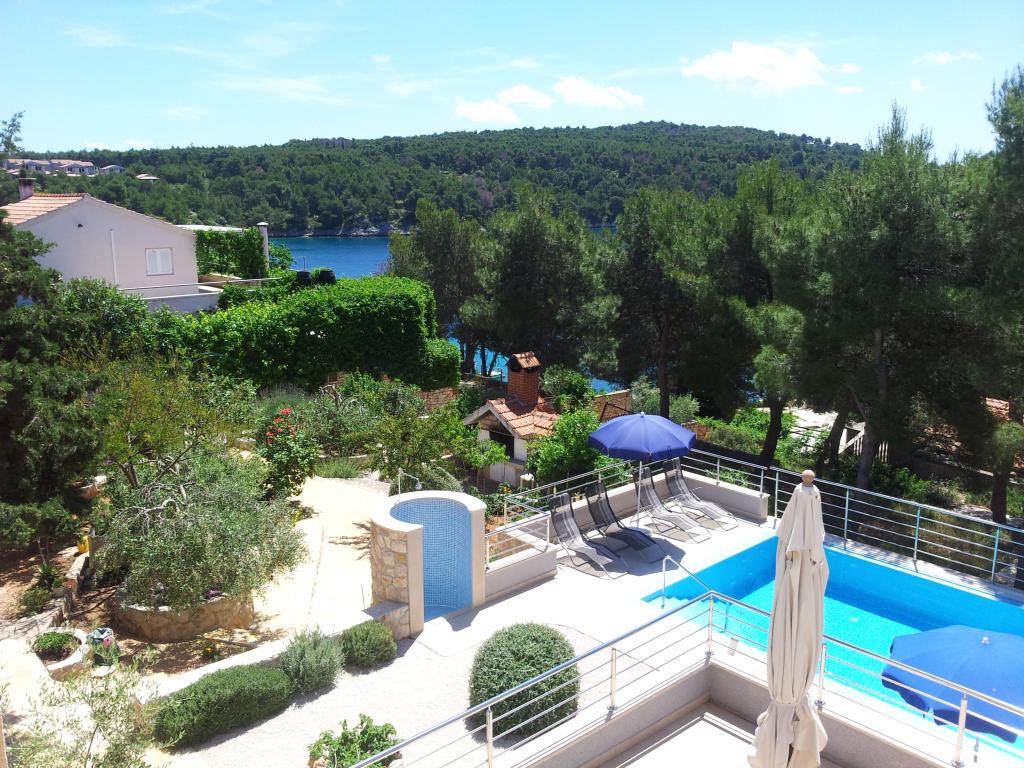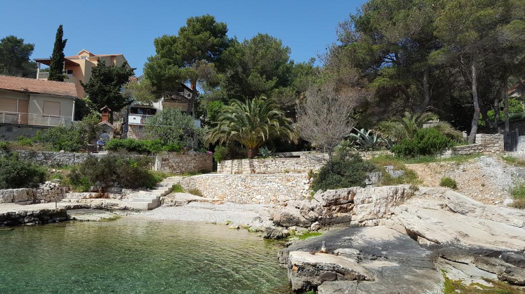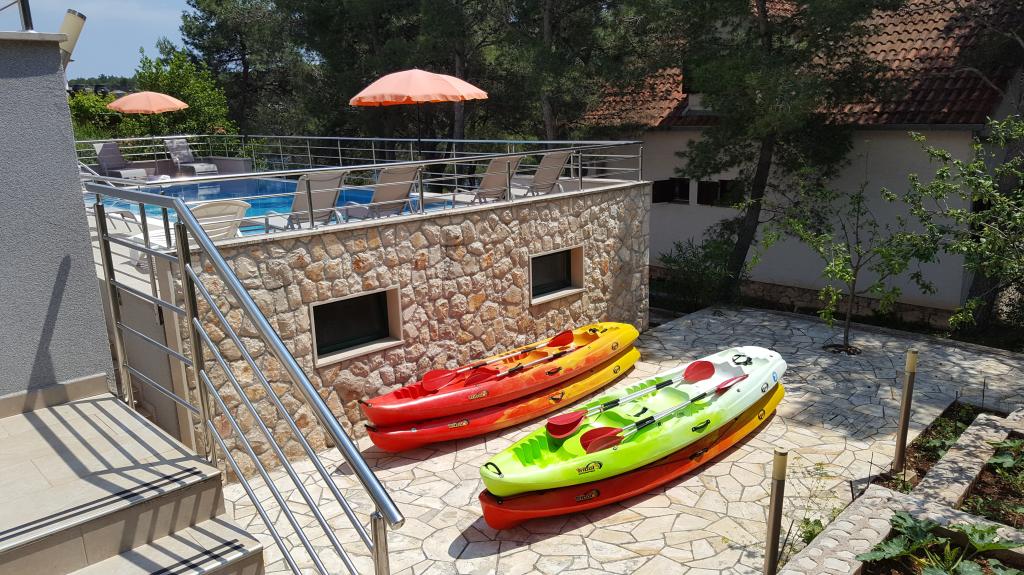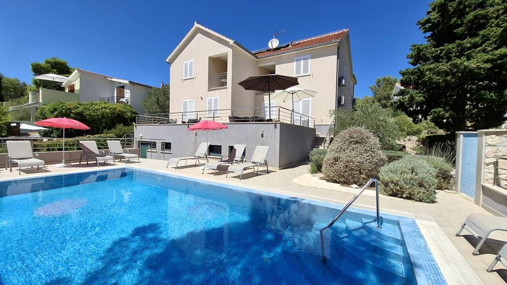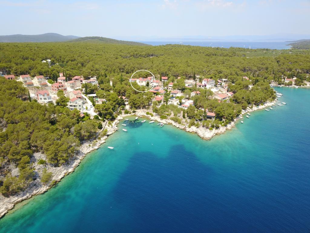 The detached holiday villa has a heated private pool and is located in the quiet and crystal-clear Osibova Bay, just 30 m from a small pebble beach. The house includes 4 kayaks and 8 bicycles. In the town of Milna, 2 km away, you'll find everything you need. On the way there, you'll find public sports fields (tennis, football, basketball and beach volleyball) that can be used. The modernly equipped villa consists of two identical residential units. In total, it features 6 bedrooms, 7 bathrooms, 2 living rooms with integrated kitchens, and a large shared sun terrace. In the basement, you'll find a 130 m² recreation room with games and fitness equipment, including billiards, table tennis and foosball. Facilities include Wi-Fi, private parking and a garden with a barbecue. The house is fully air-conditioned (each room with individually controllable air conditioning).