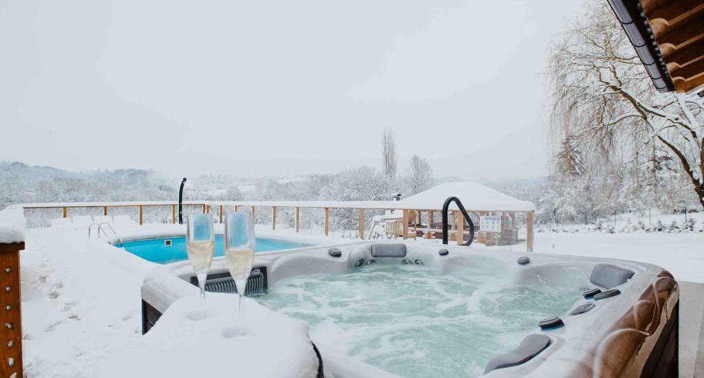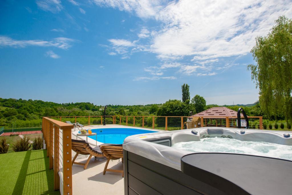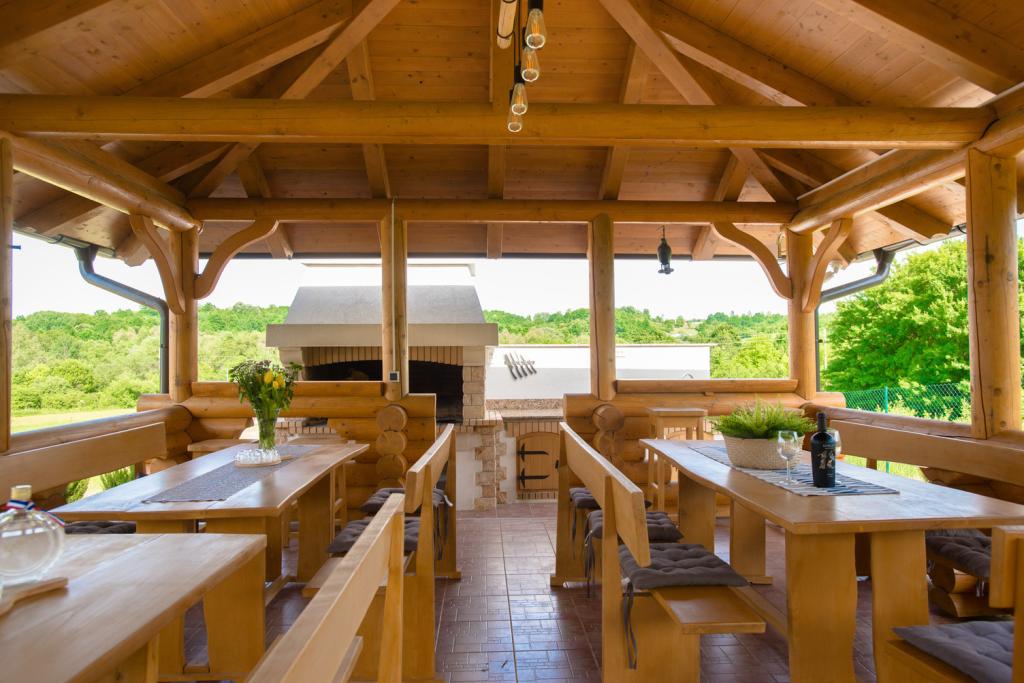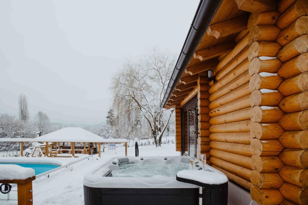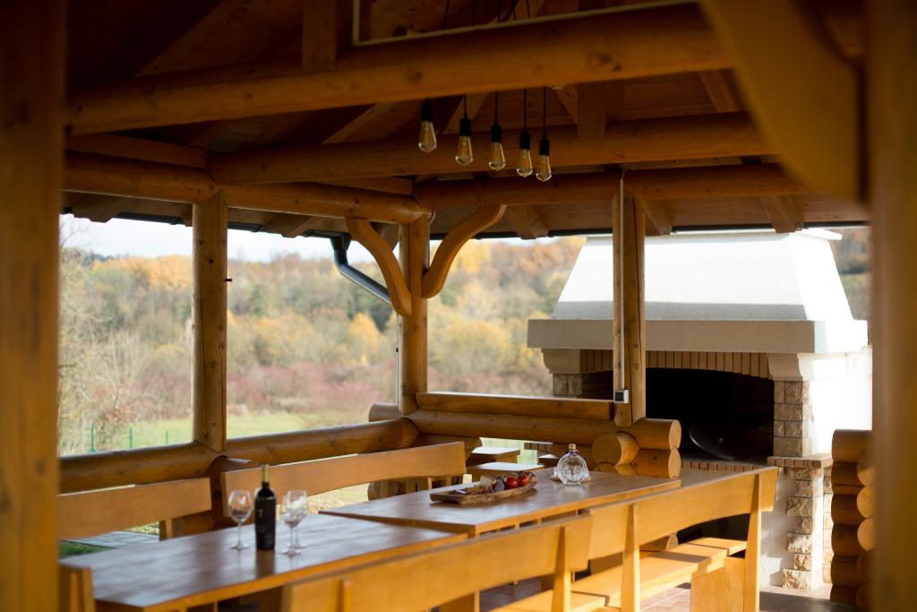 Szibériai fenyőből készült faház. Ház: maximum nem. ágy 10, ház 108 m2, terasz medencével 105 m2, szauna, jacuzzi, pavilon 30 m2. 7000 m2 feletti kert, parkoló, nappali konyhával, 3 hálószoba, fürdőszoba zuhanyzóval és WC-vel. Zárt terasz kandallóval, teniszpálya társasozásra és sportolásra, öltöző zuhanyzóval és WC-vel, pavilon grillezővel, horgászbottal és a szükséges felszerelésekkel. Játszótér, 4 TV, darts.