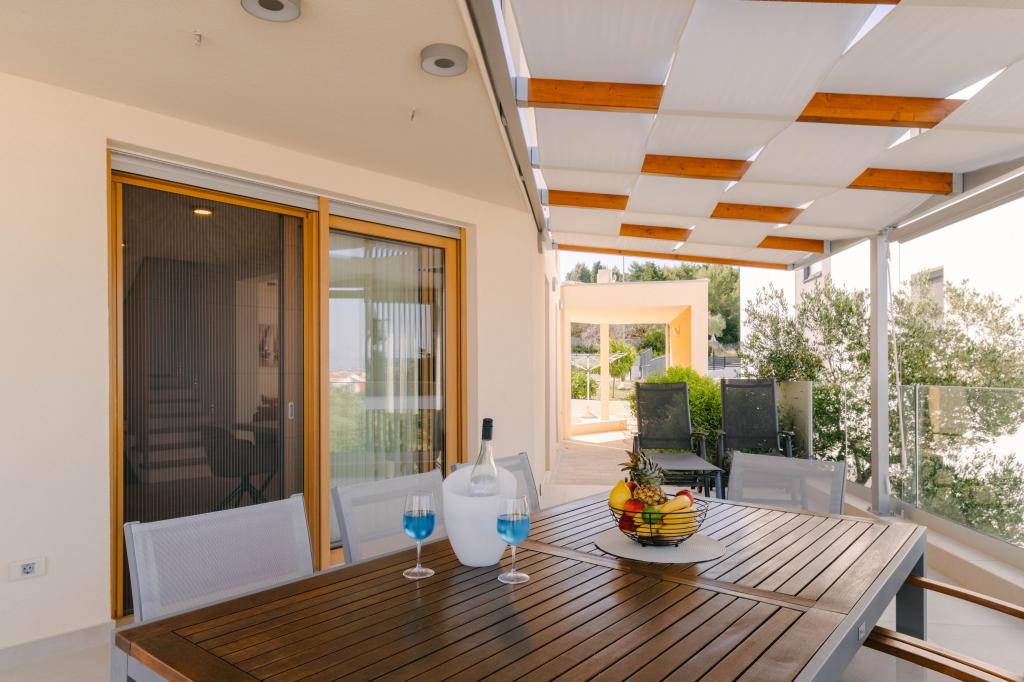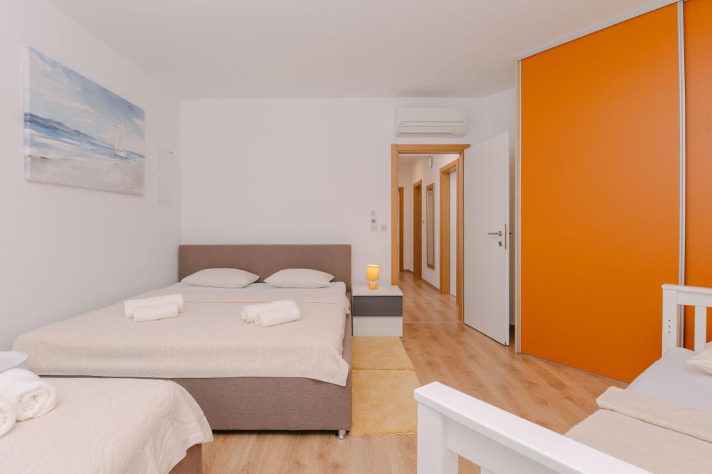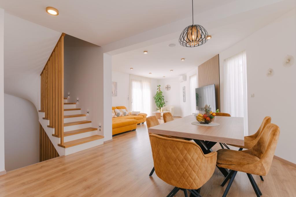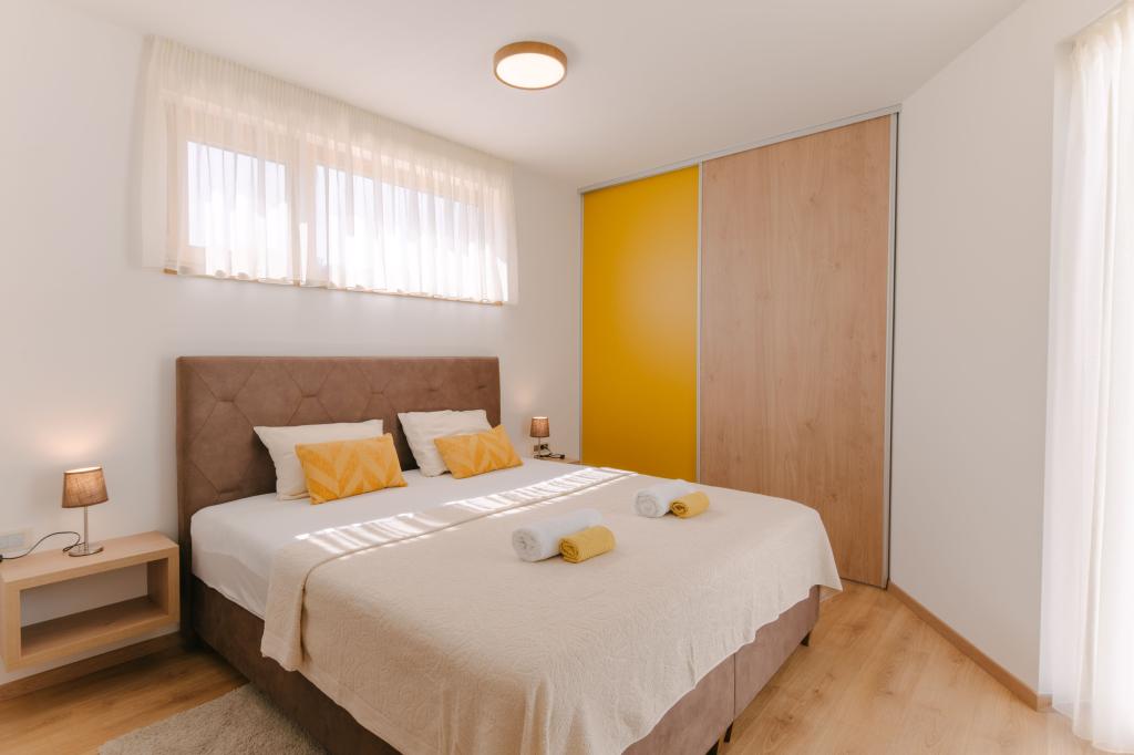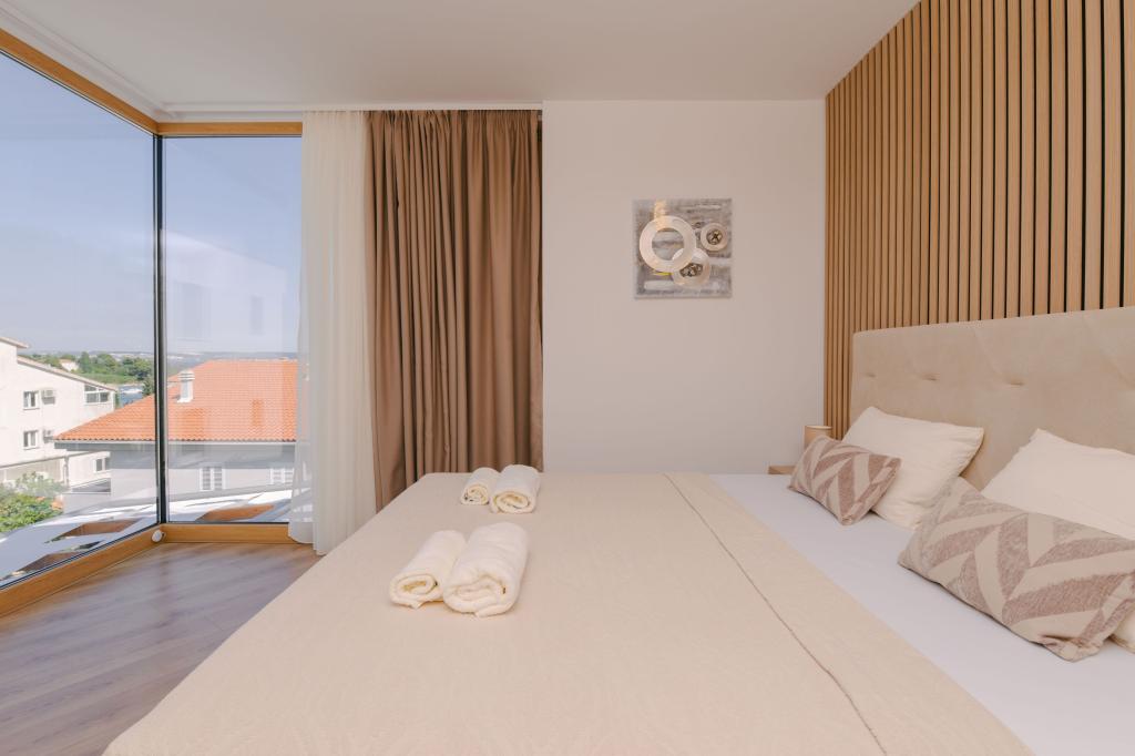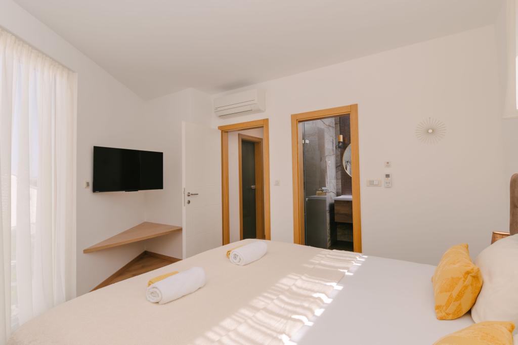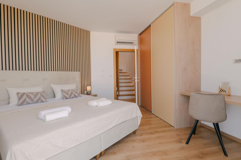 Három modern hálószoba található az emeleten, míg egy vendégszoba az alagsorban. Minden fürdőszoba a legmodernebb Grohe és Laufen szerelvényekkel, tekintélyes designer kerámialapokkal és elegáns üvegajtókkal van felszerelve. A ház hivatalosan is a Horvát Köztársaság Turisztikai Minisztériuma által minősített, amely 9, akár 10 vendég kényelmes elszállásolását teszi lehetővé. A nyitott terű nappali és étkező, valamint minden hálószoba egyedi légkondicionálóval van felszerelve, csendes üzemmóddal, amely tökéletes a nyugodt alváshoz. A modern konyha, a híres osztrák DanKüchen márkától, teljesen felszerelt a legmodernebb gépekkel, beleértve a jégkészítővel ellátott hűtőszekrényt és a hidegvíz-adagolót.